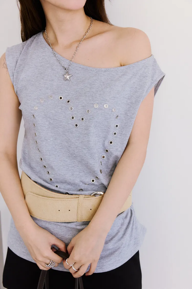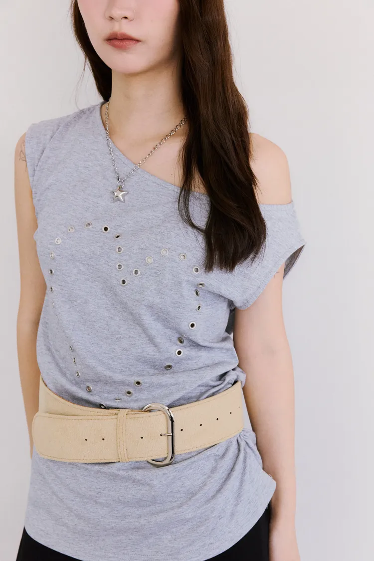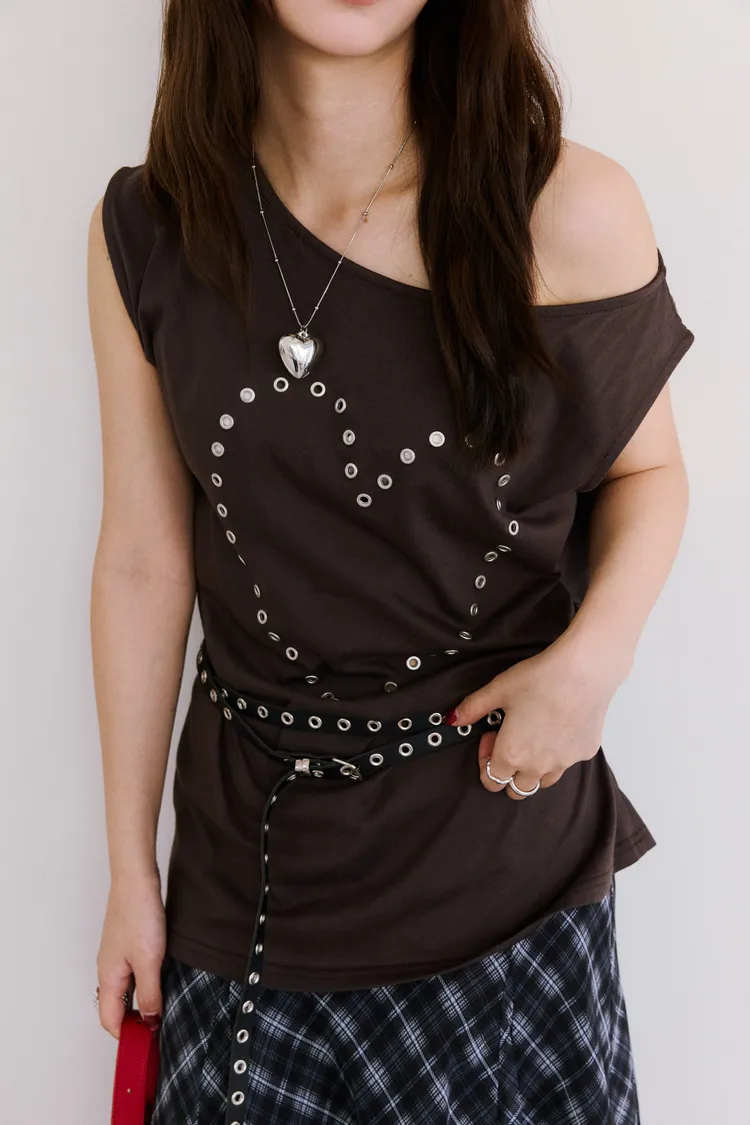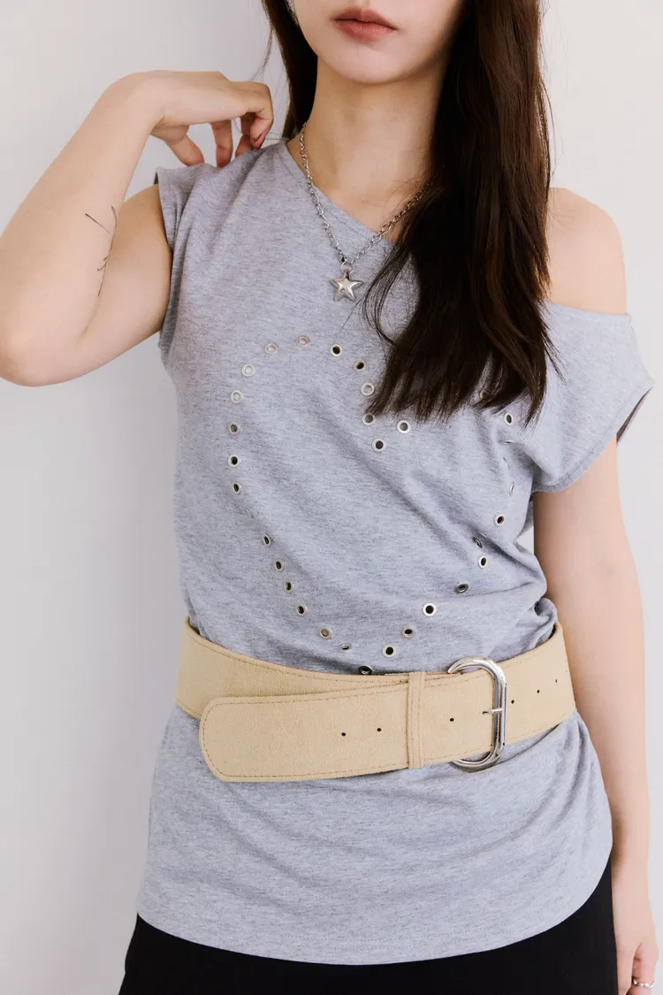 時髦鉚釘釦斜領收腰tee 2color