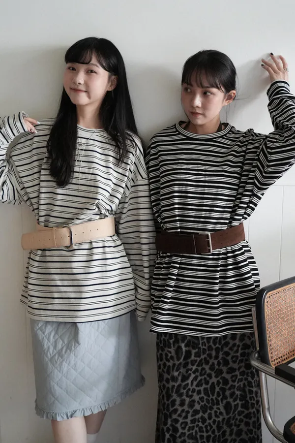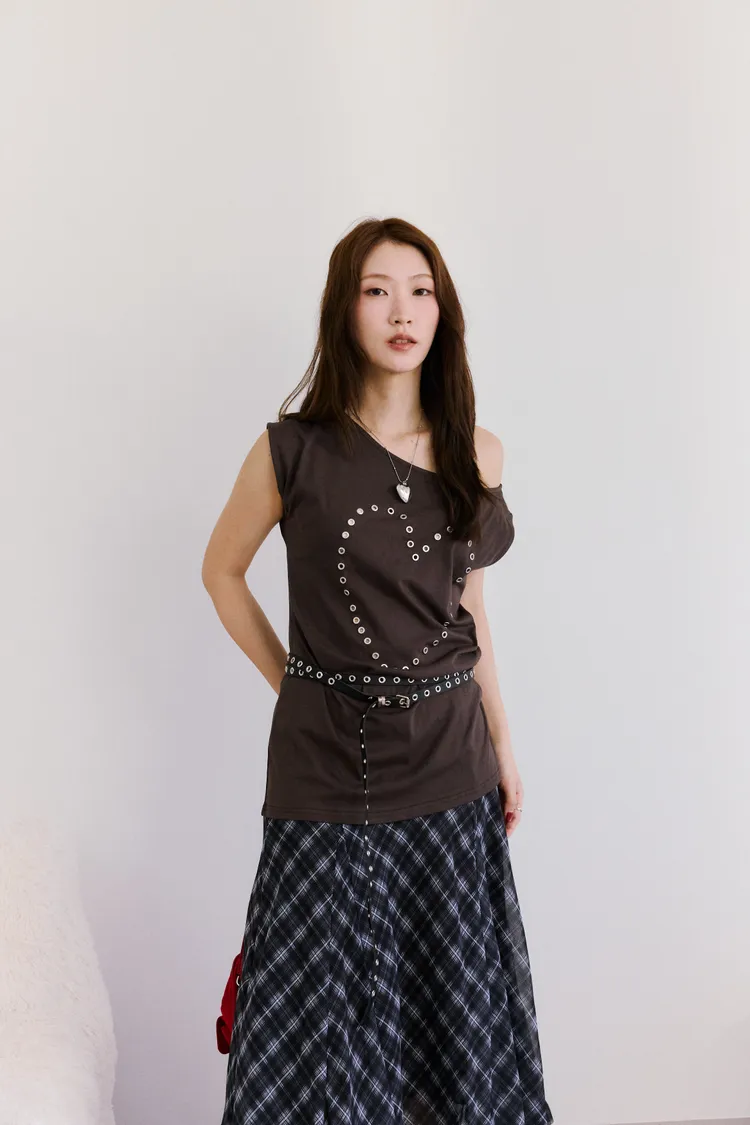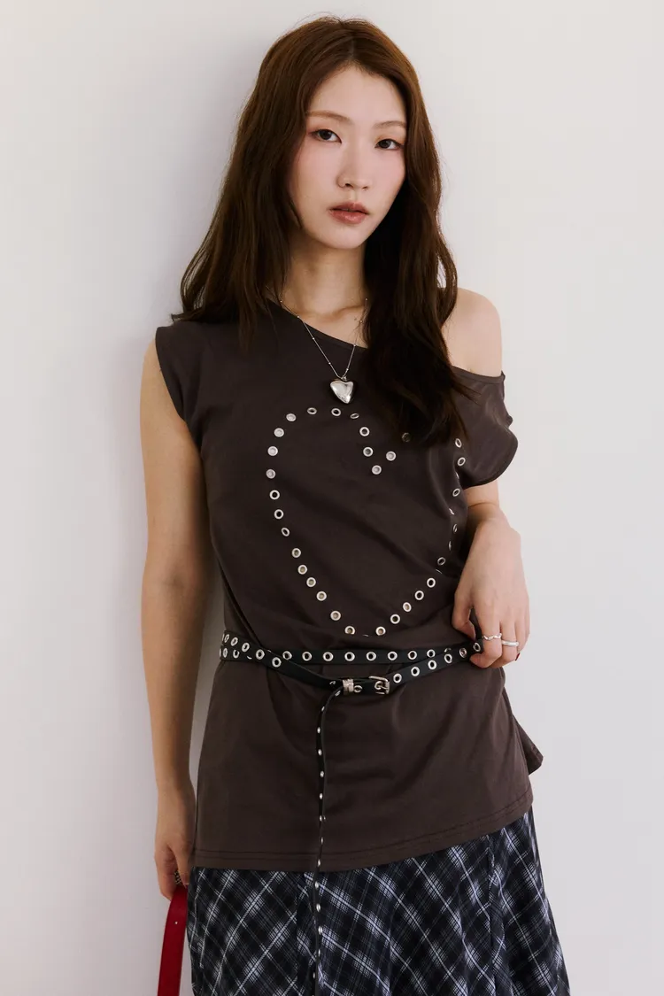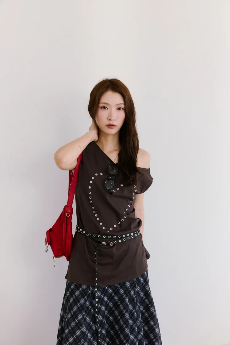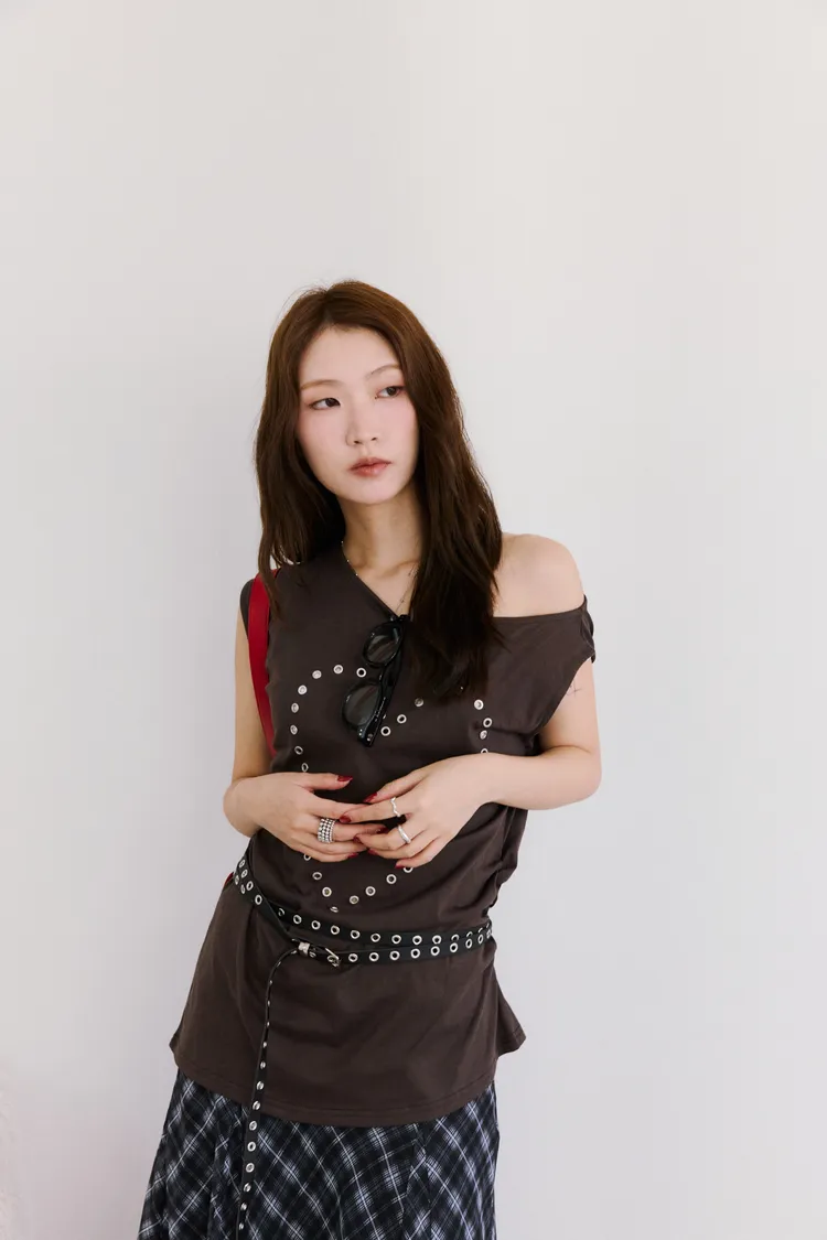 時髦鉚釘釦斜領收腰tee 2color