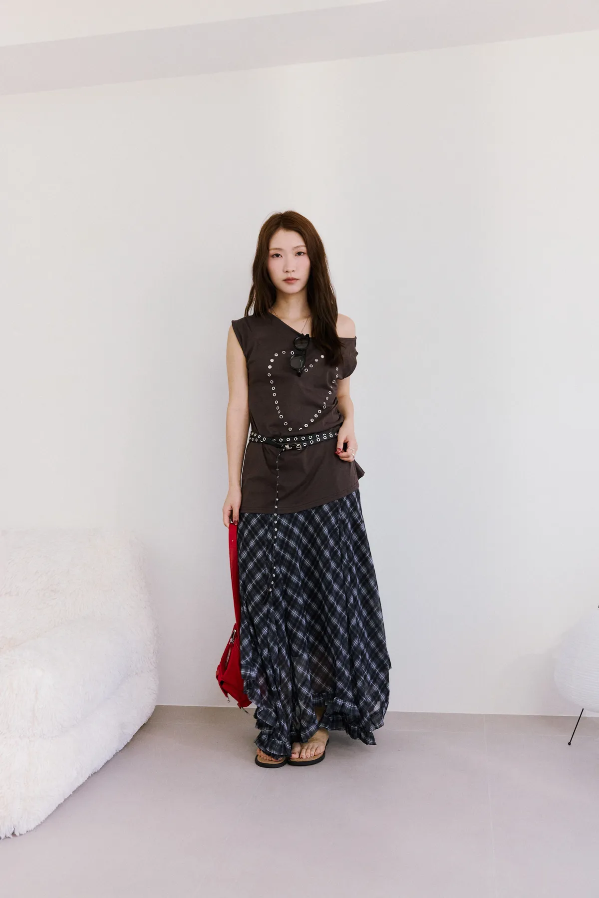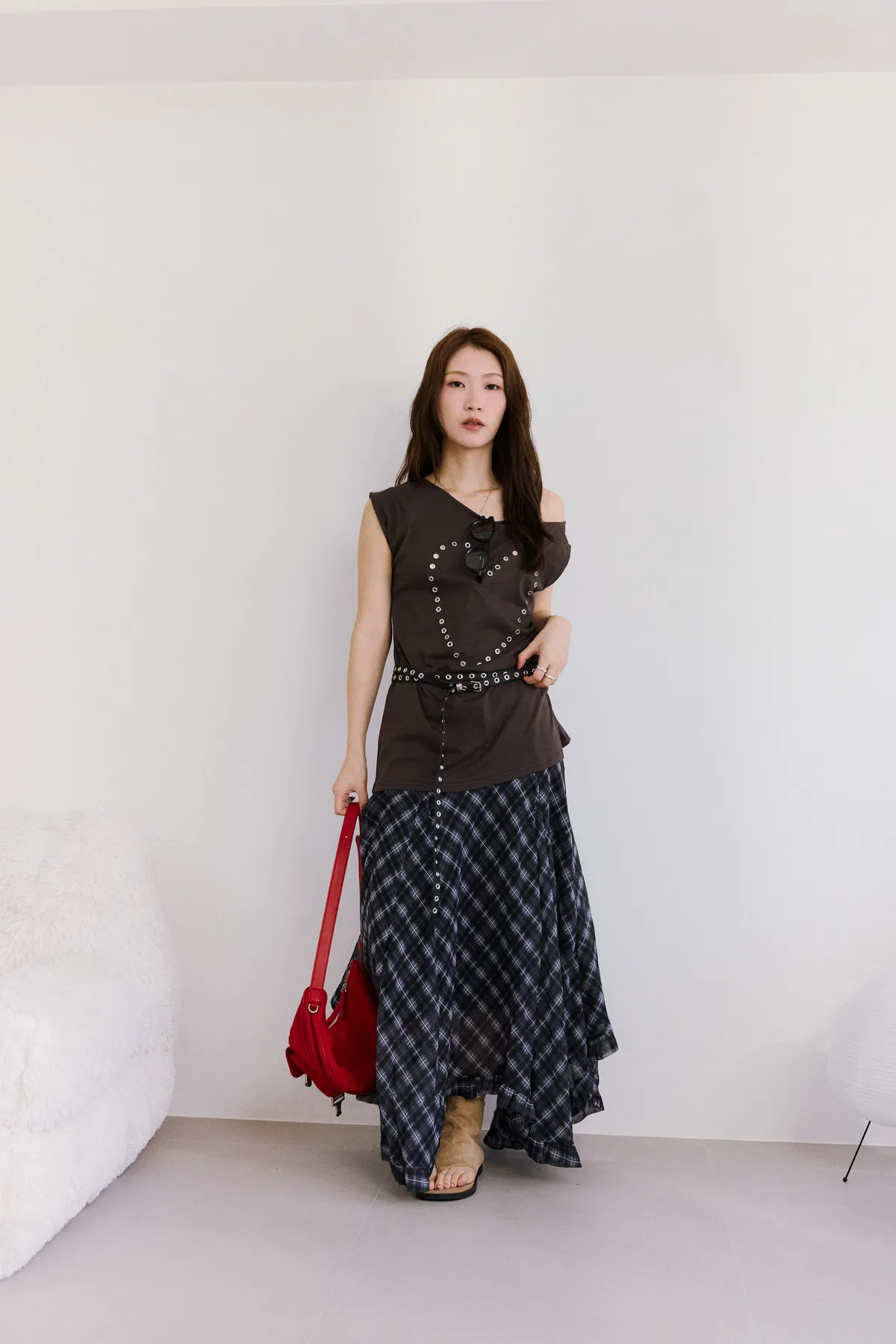 垂墜感格紋斜襬設計長裙