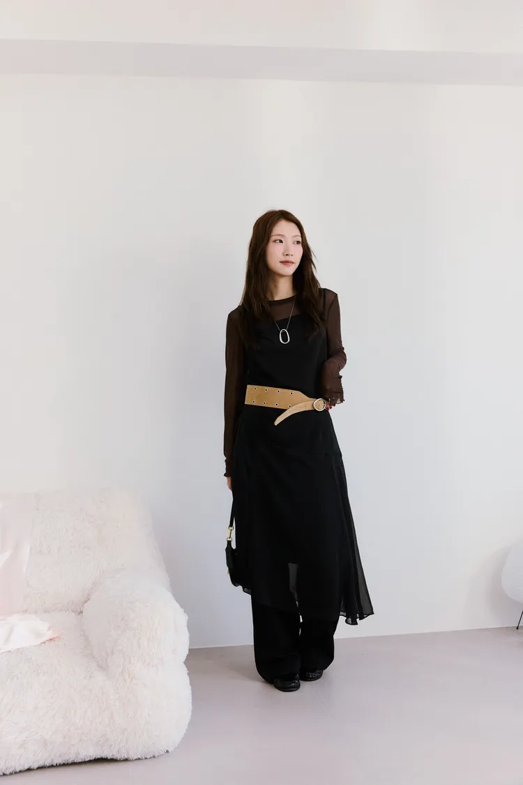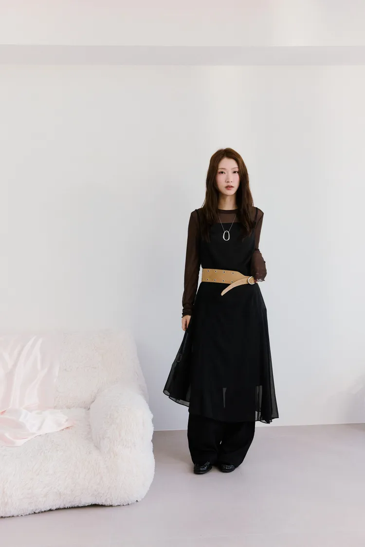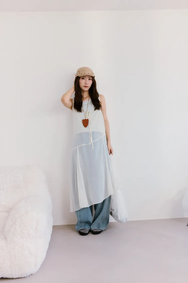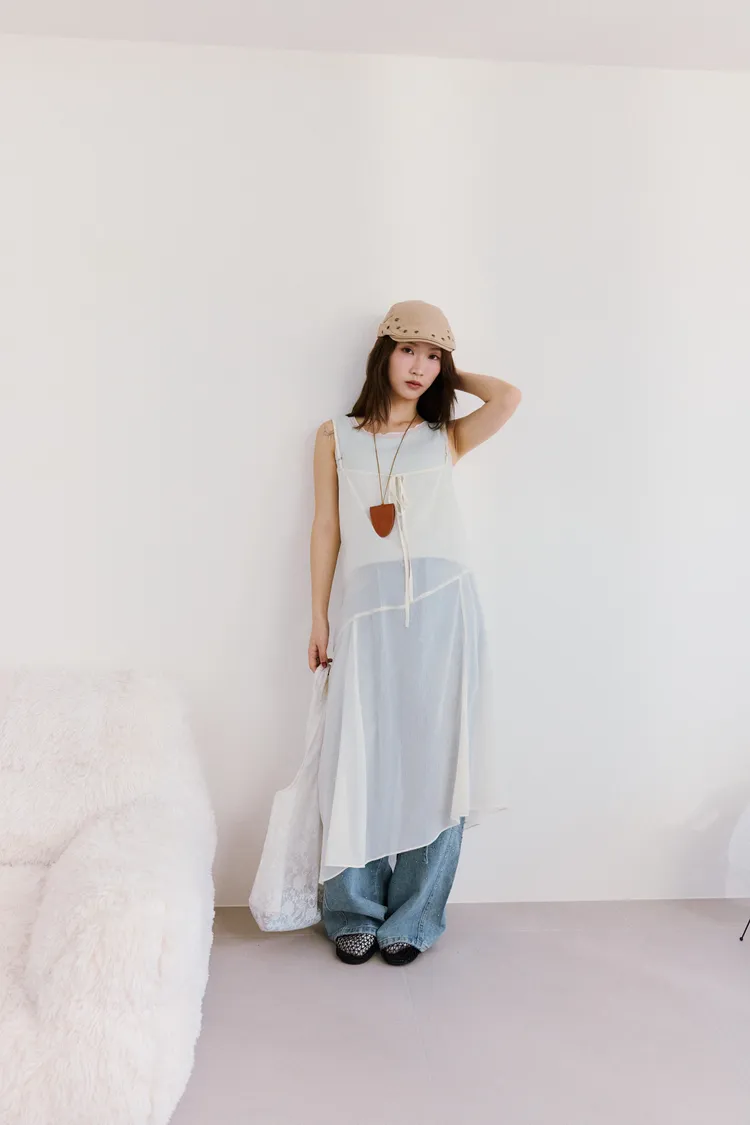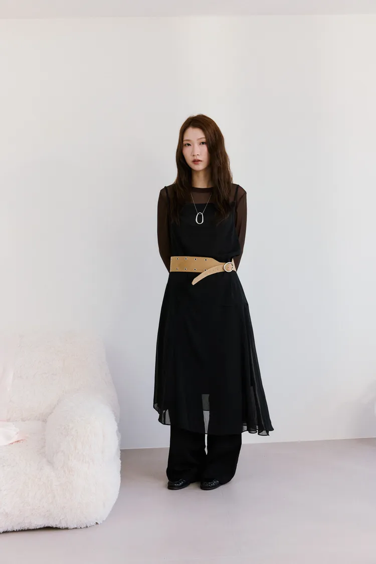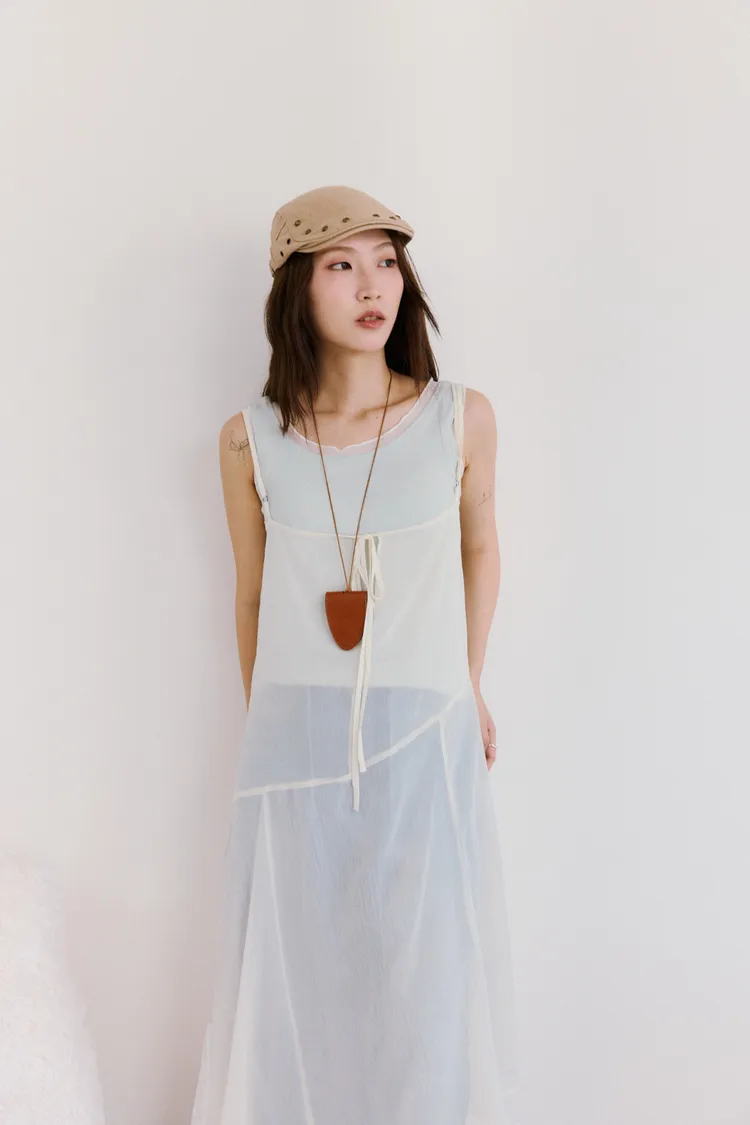 細肩透紗綁結長洋裝 2color