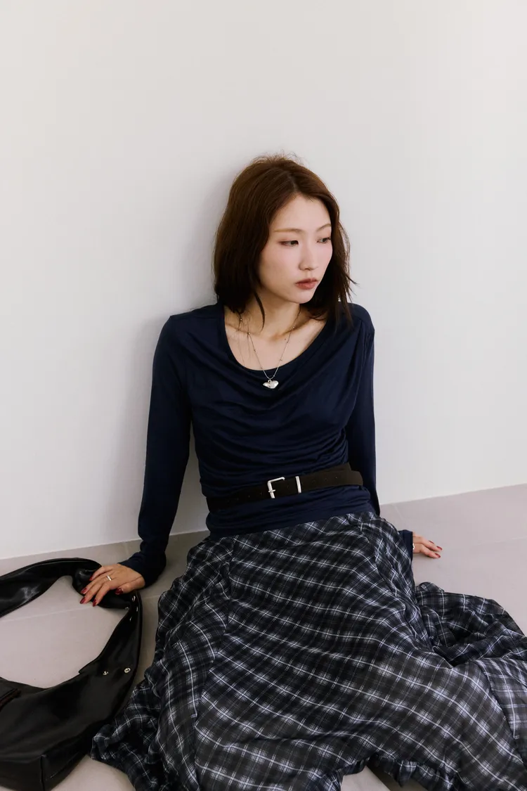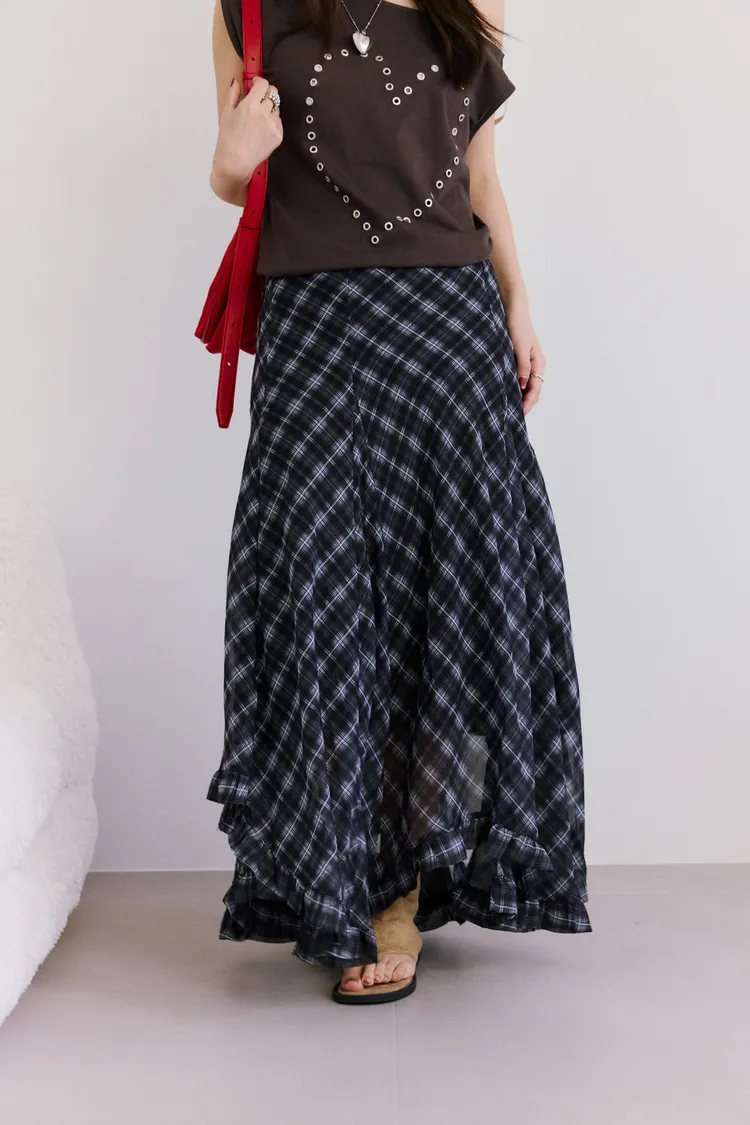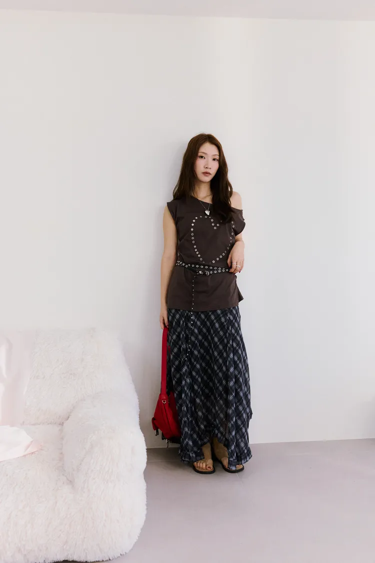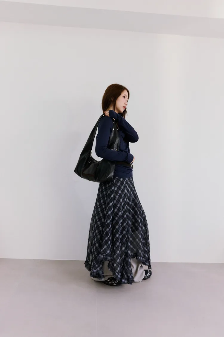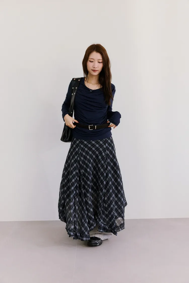 垂墜感格紋斜襬設計長裙