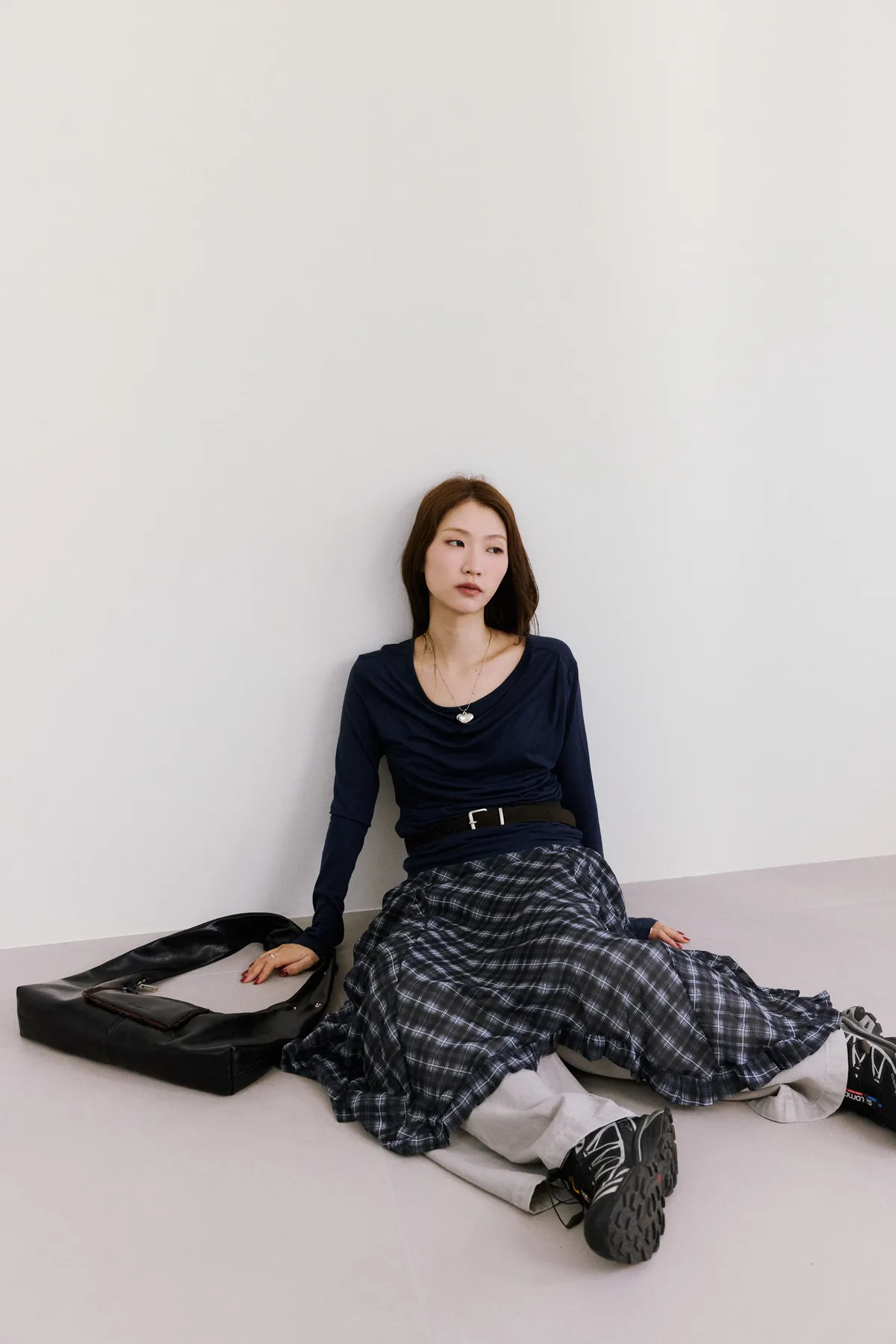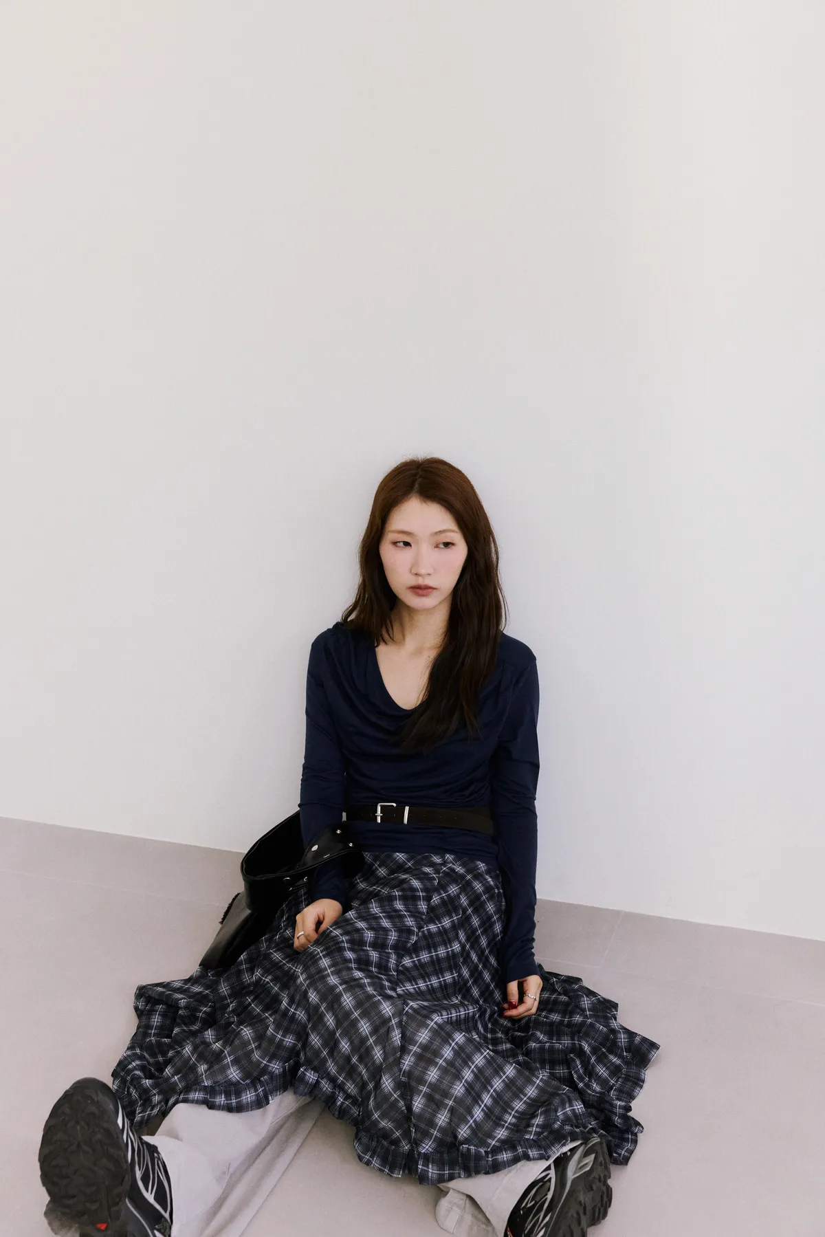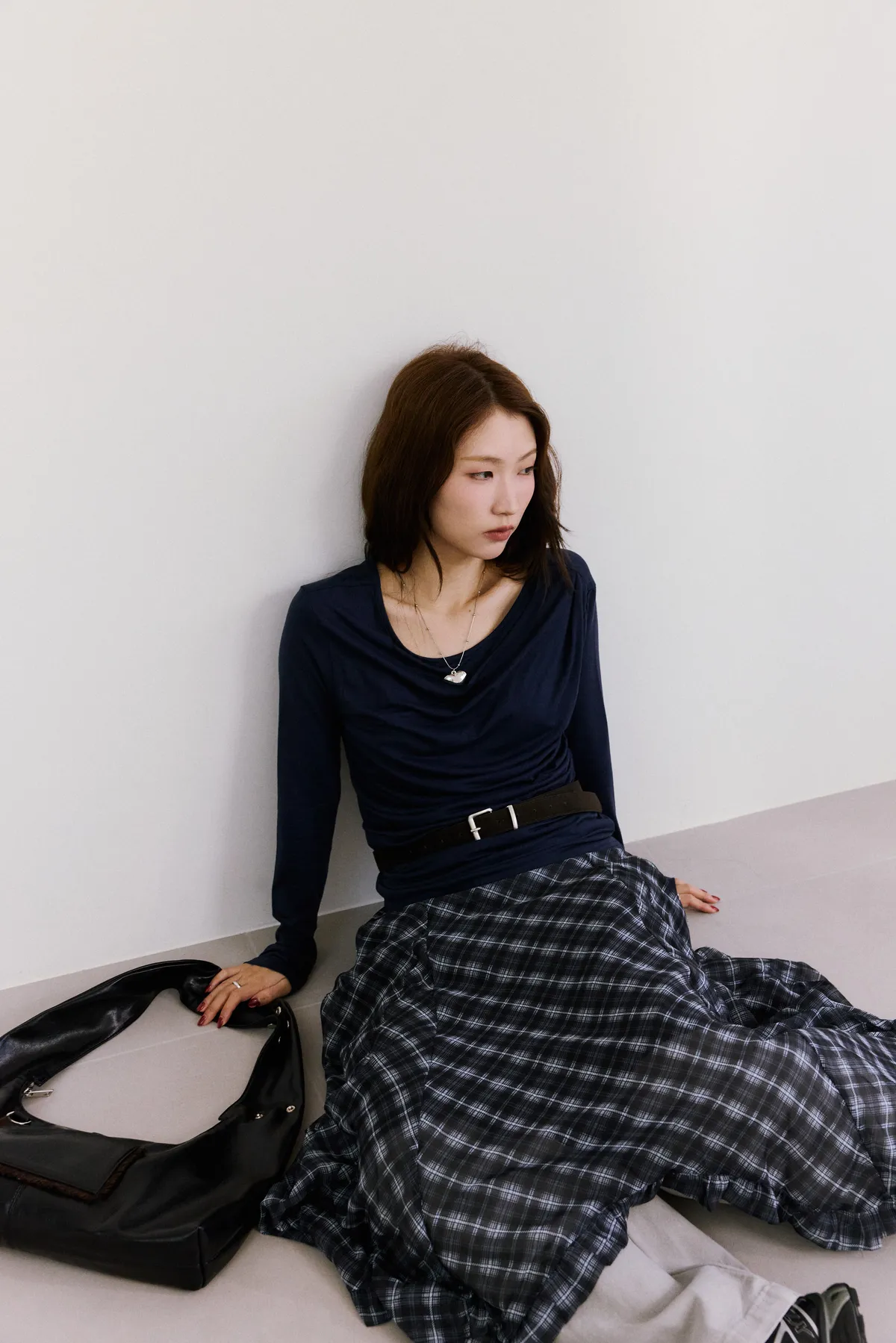 垂墜感格紋斜襬設計長裙