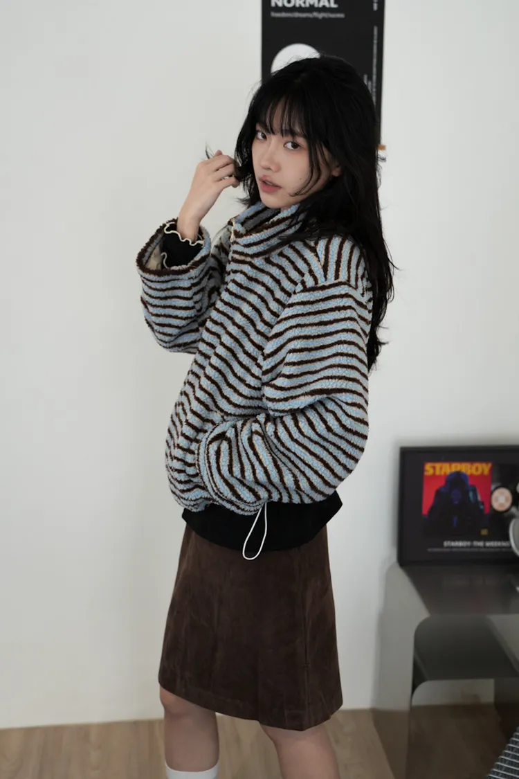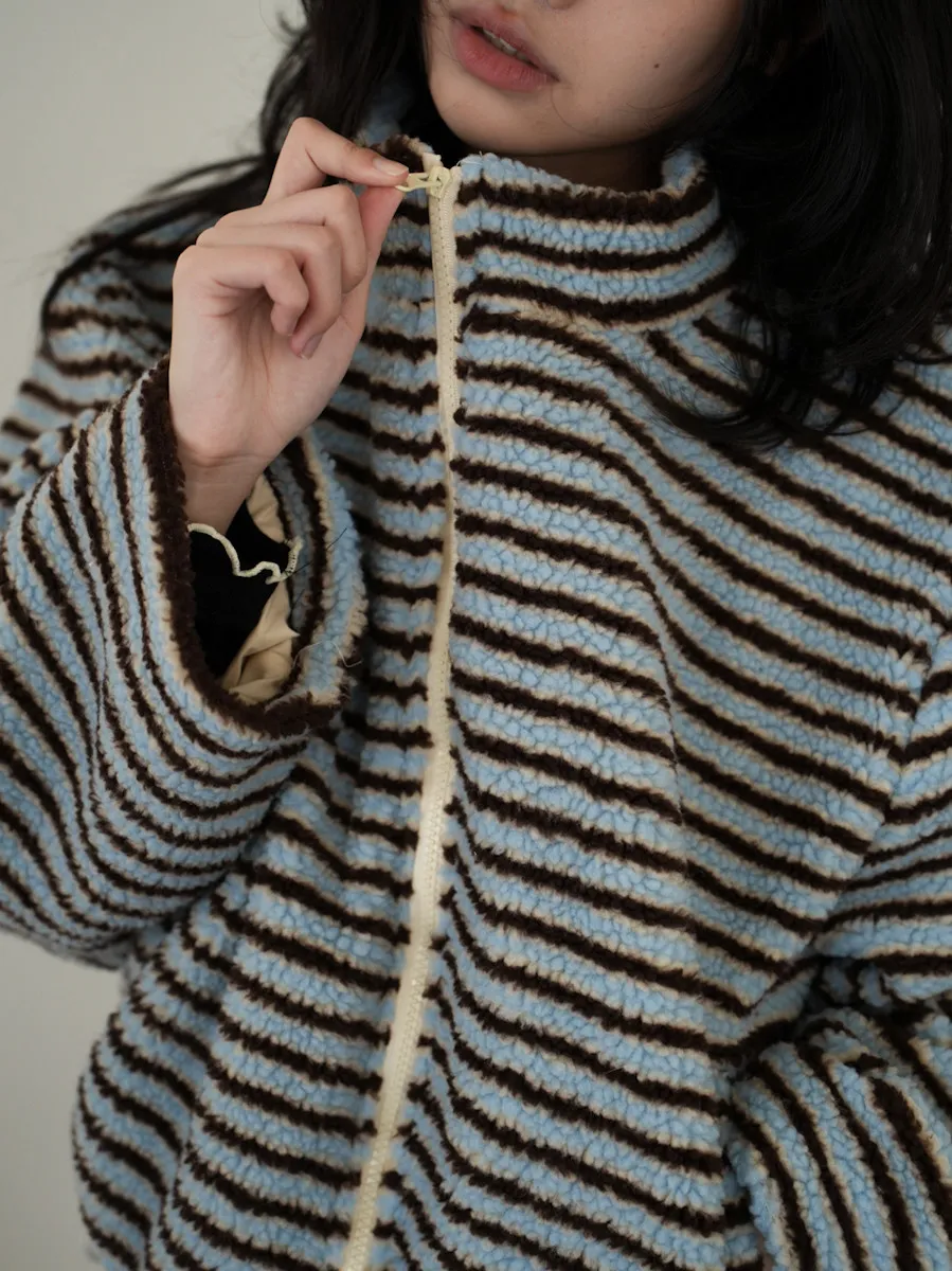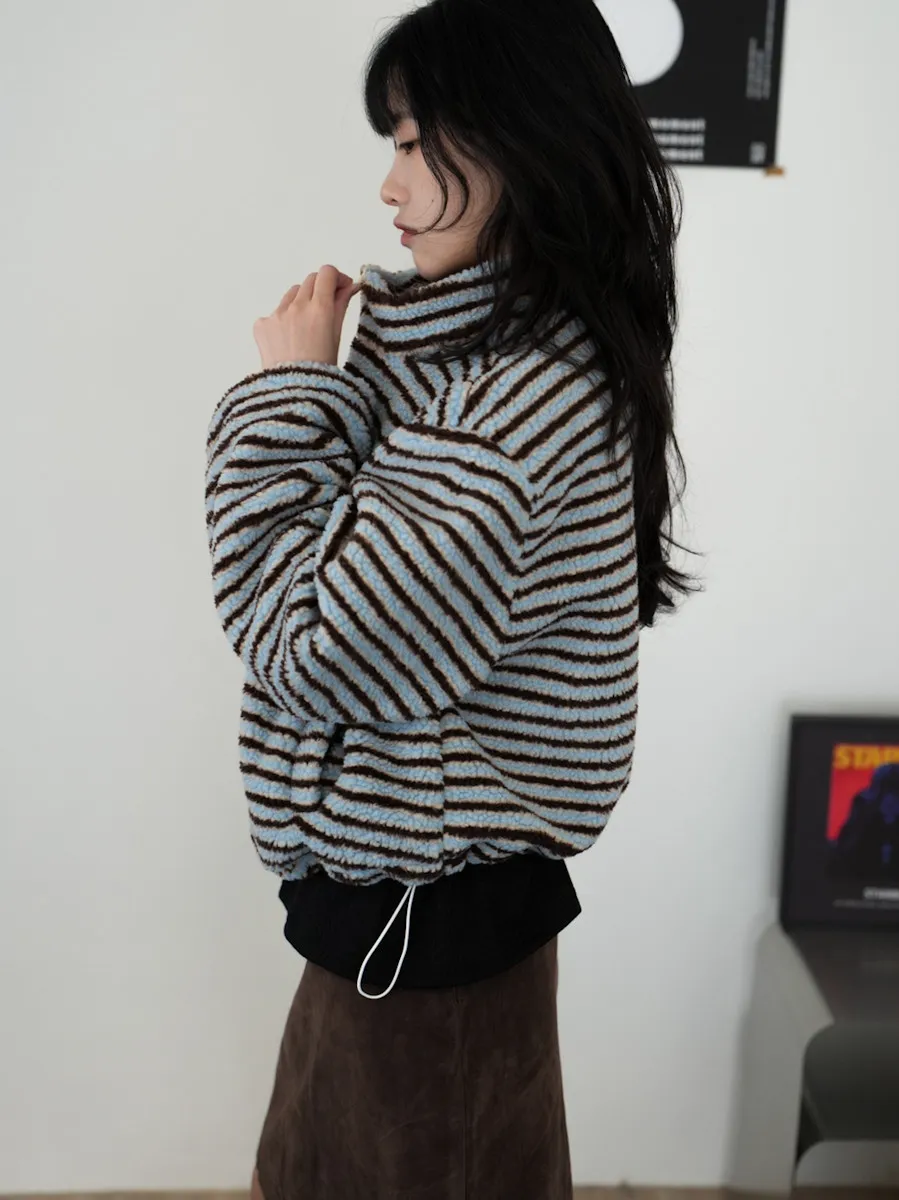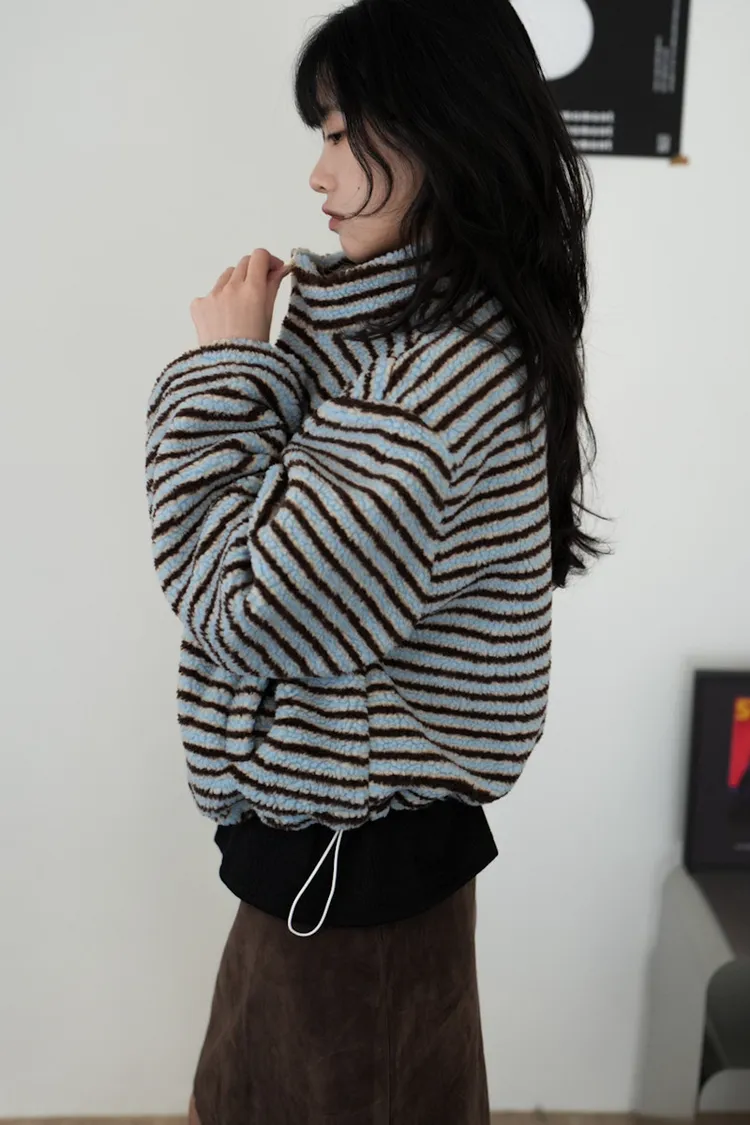 出片秘訣條紋半高領羊羔毛拉鍊外套