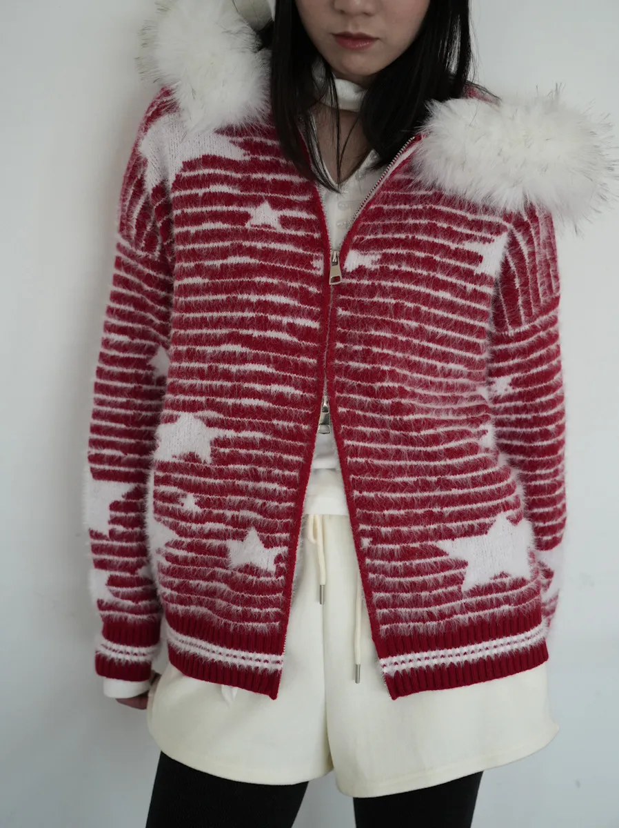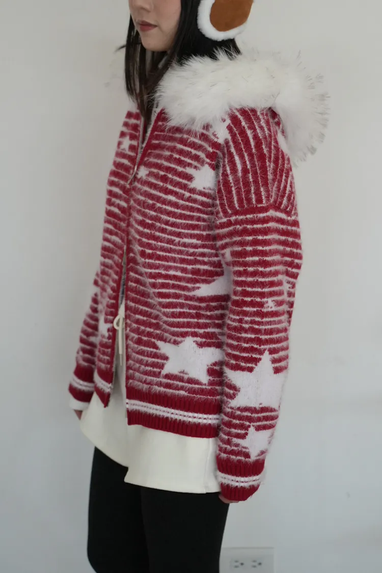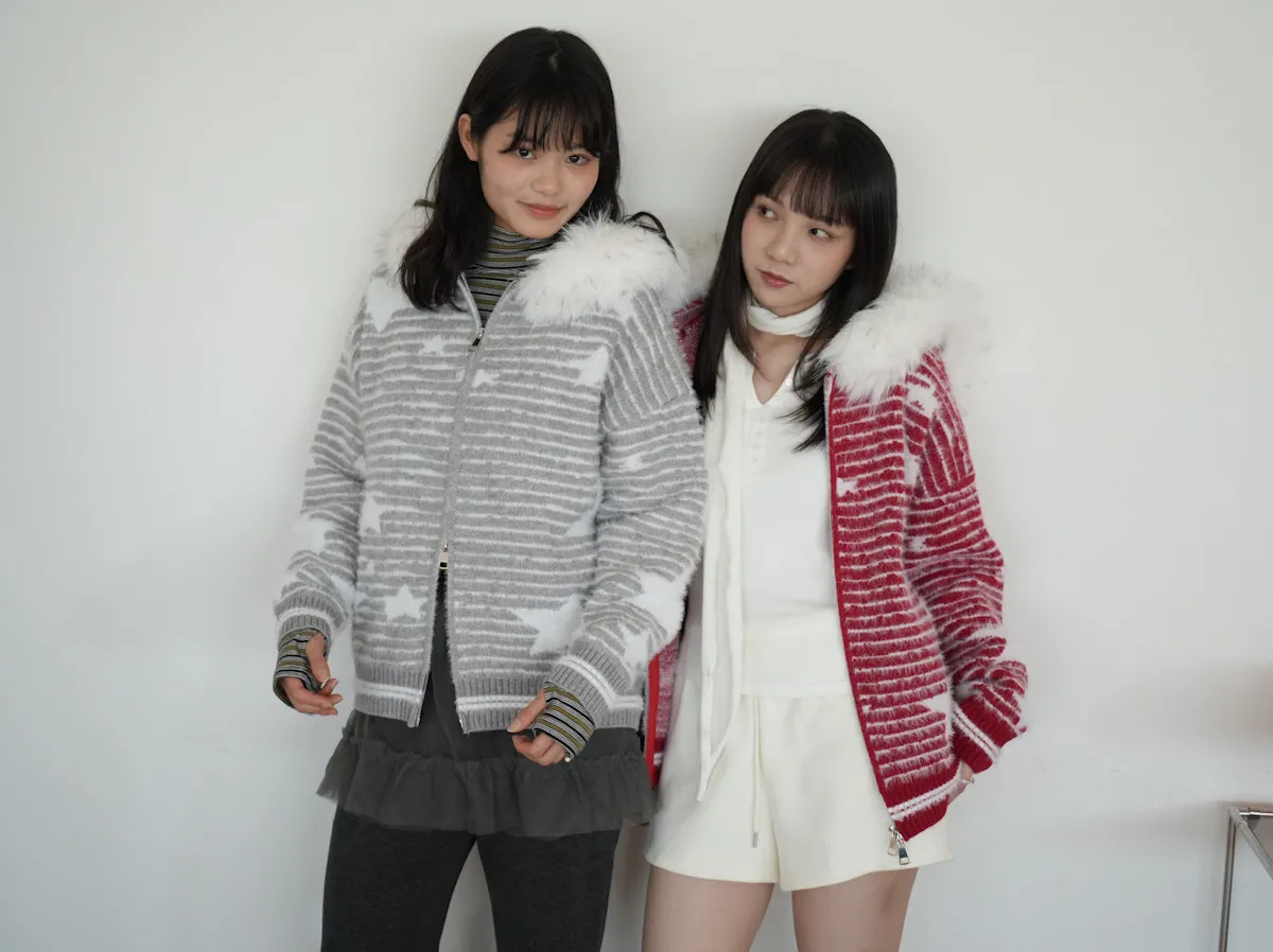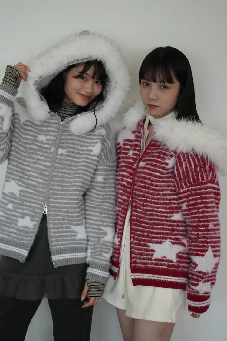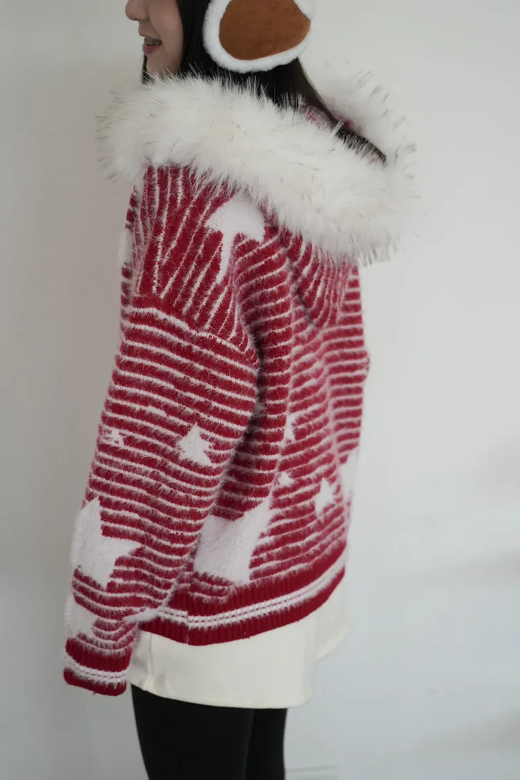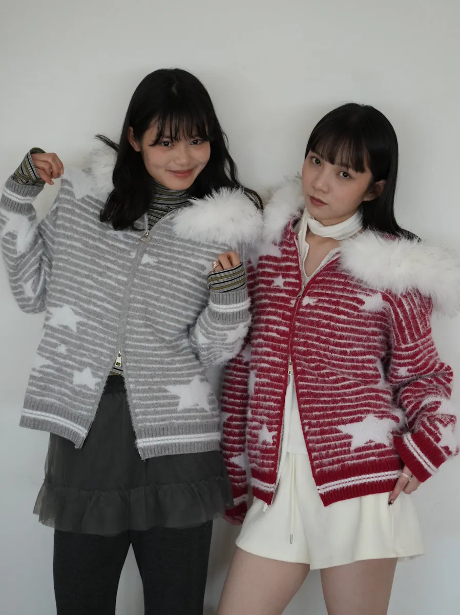 -星星get!連帽毛毛可拆毛衣外套 紅6灰1