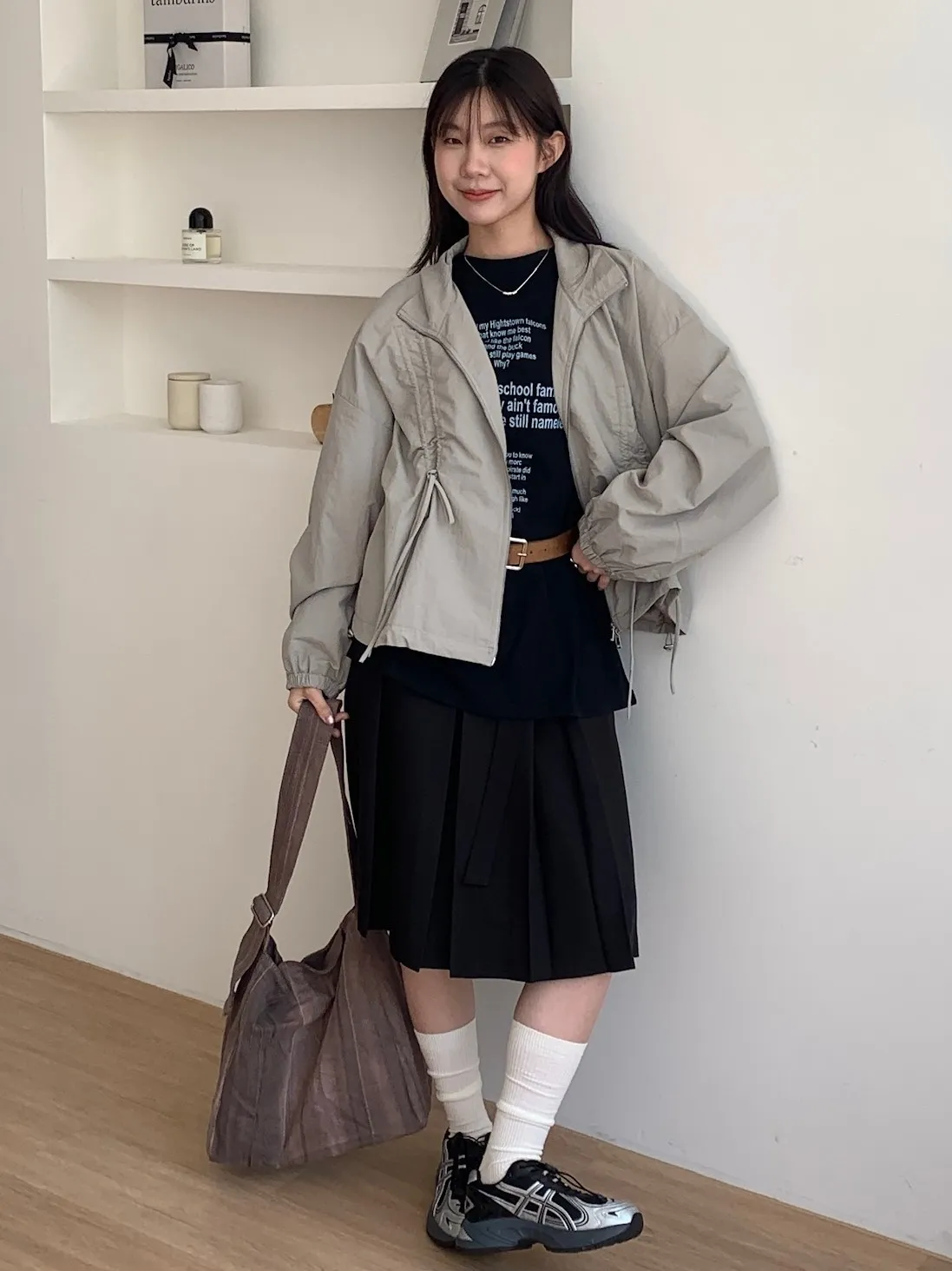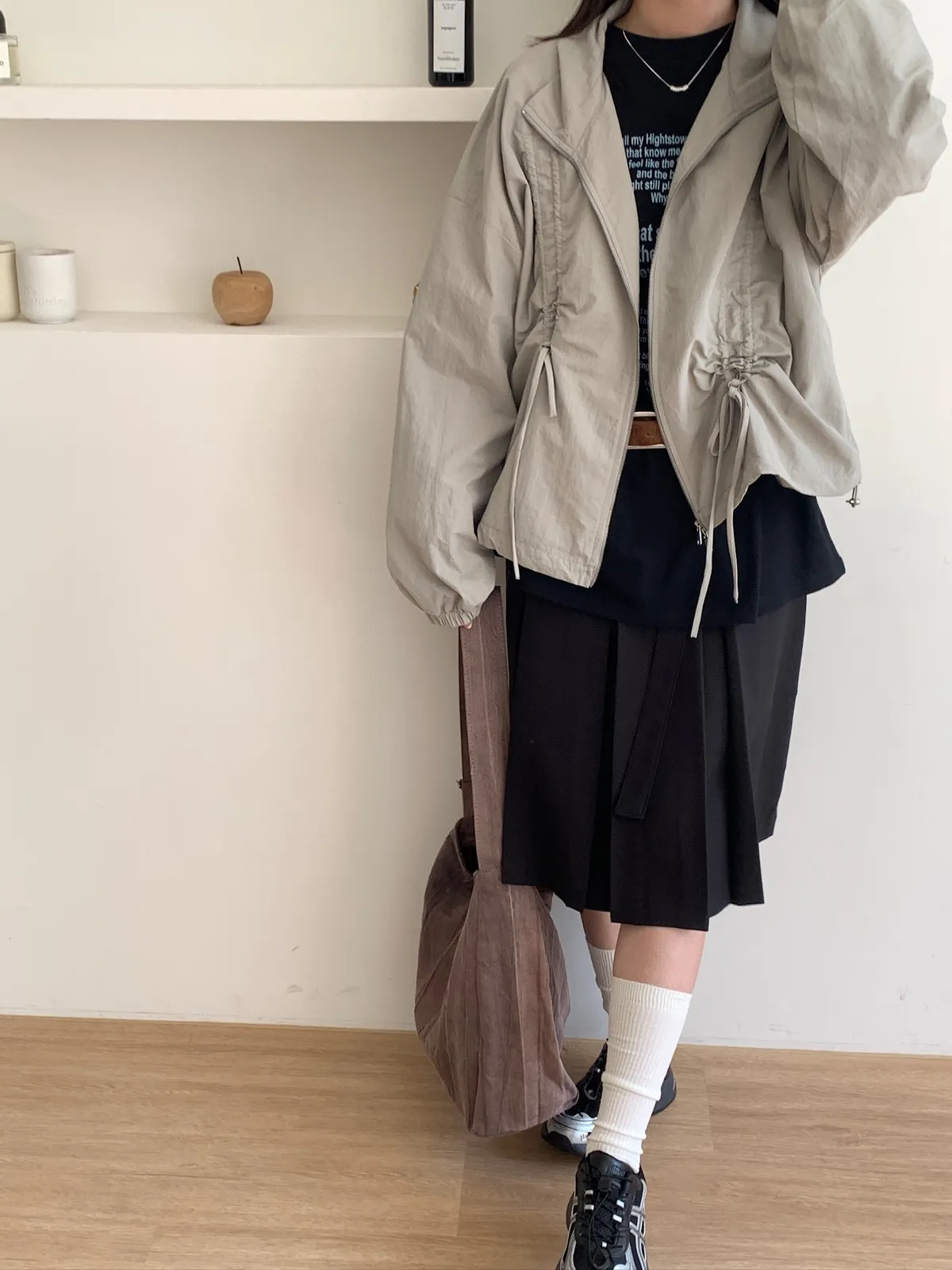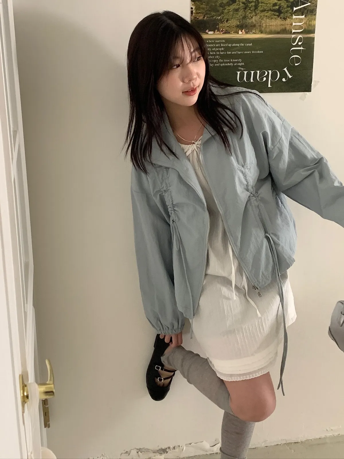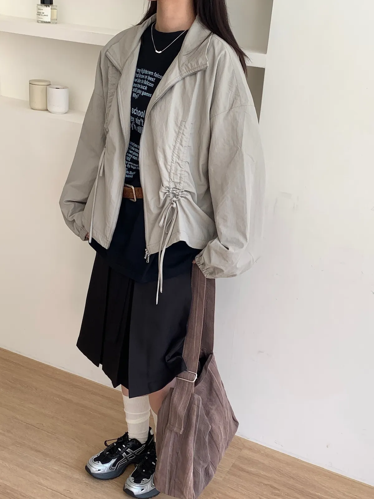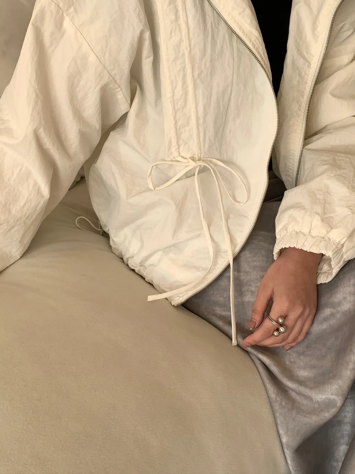 胸前雙抽繩可拉皺,可立領,下擺兩側有彈力繩可縮口