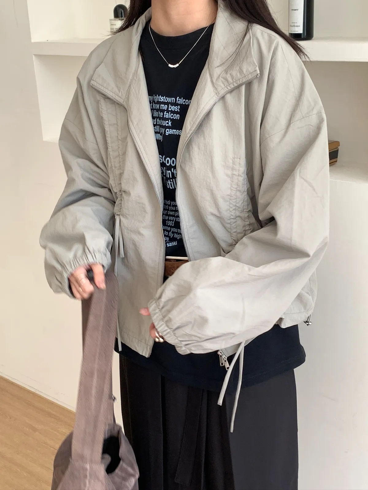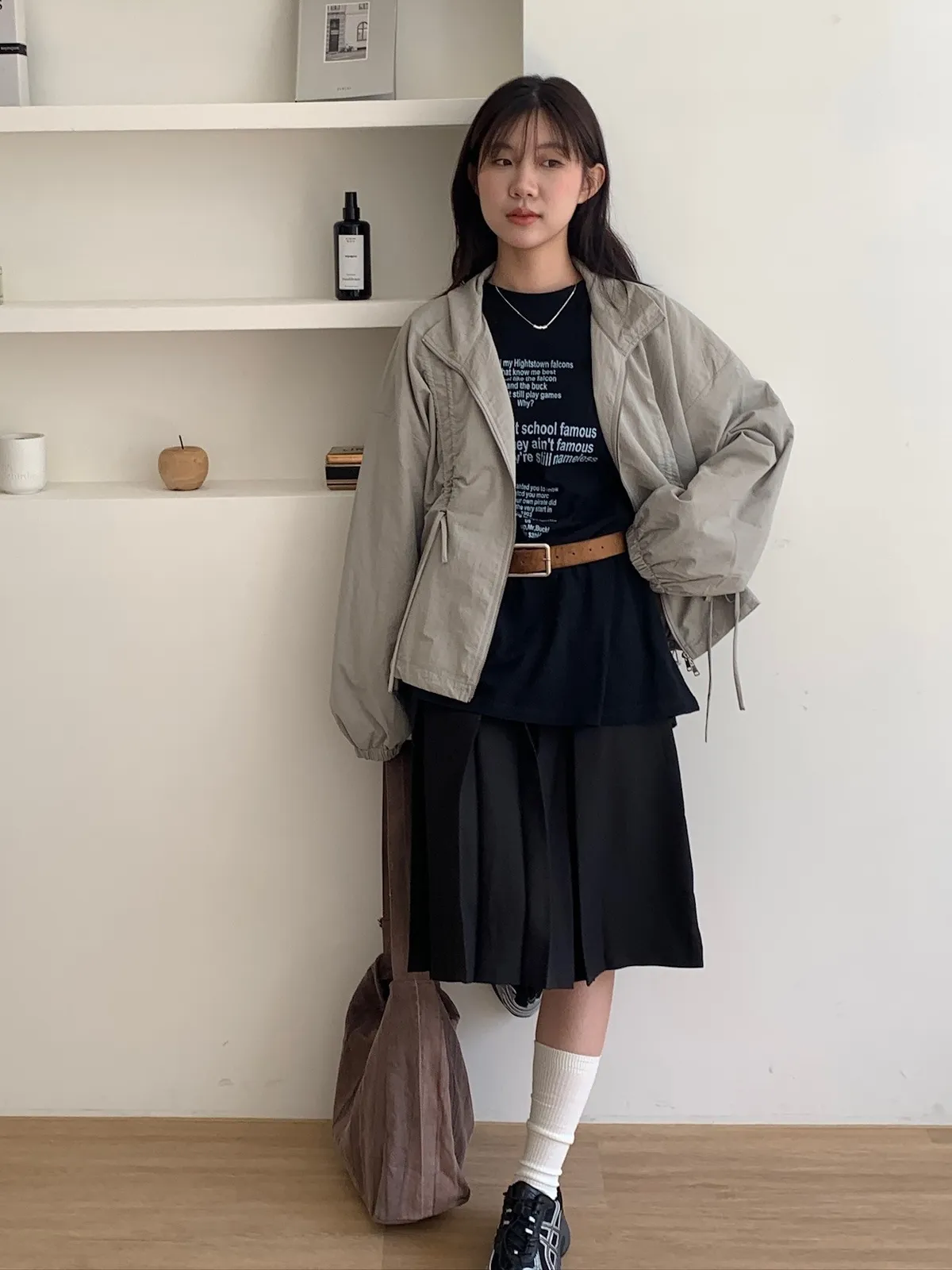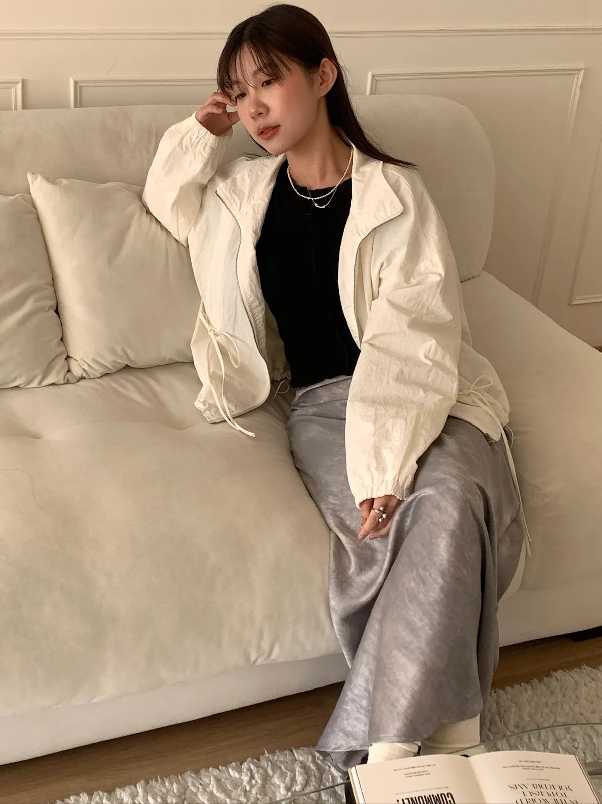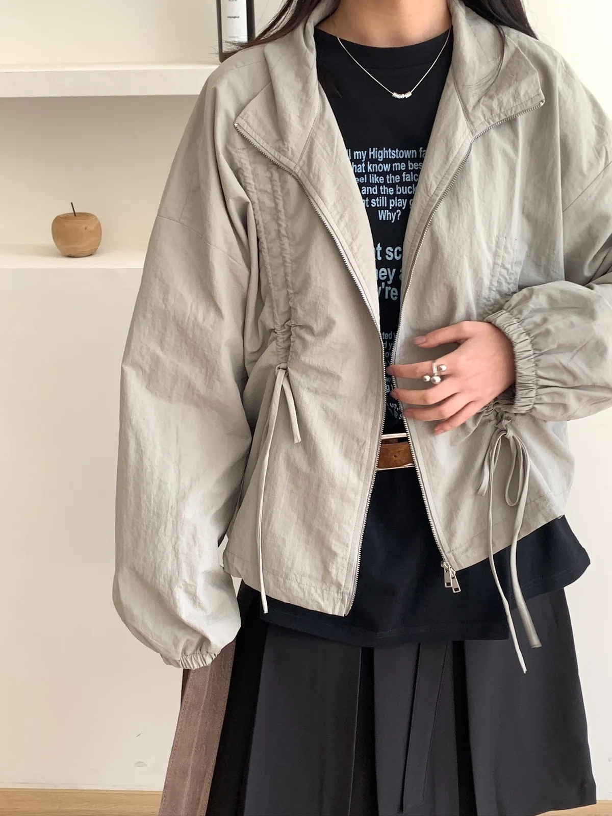 胸前雙抽繩可拉皺,可立領,下擺兩側有彈力繩可縮口