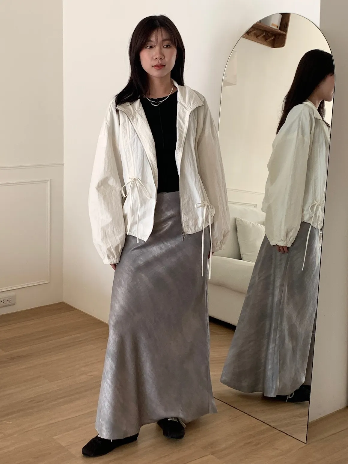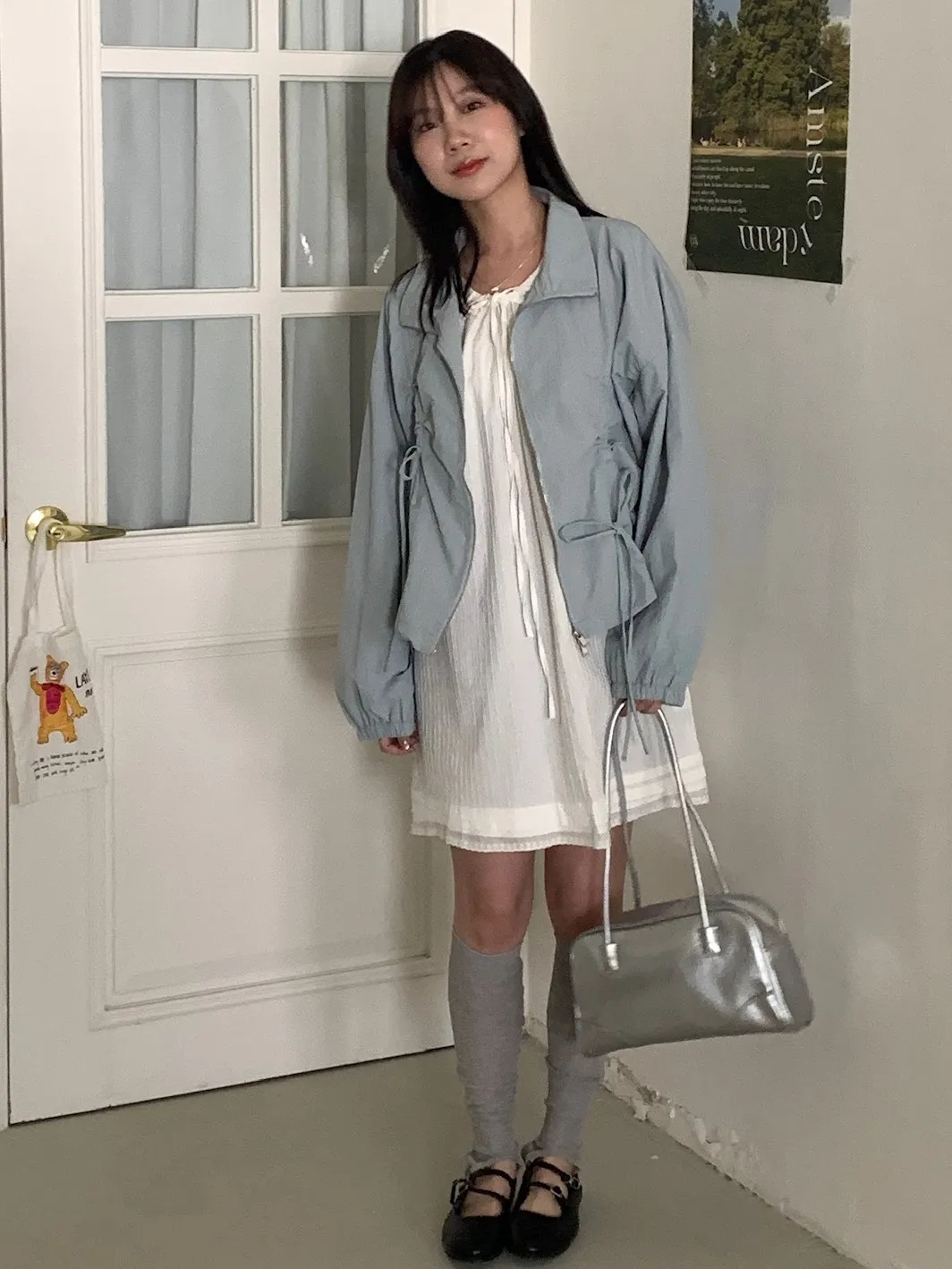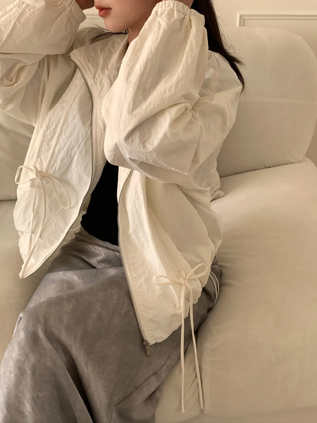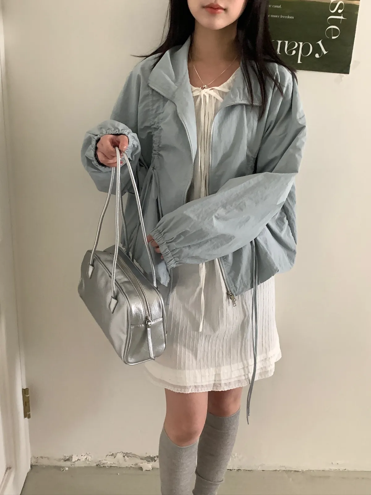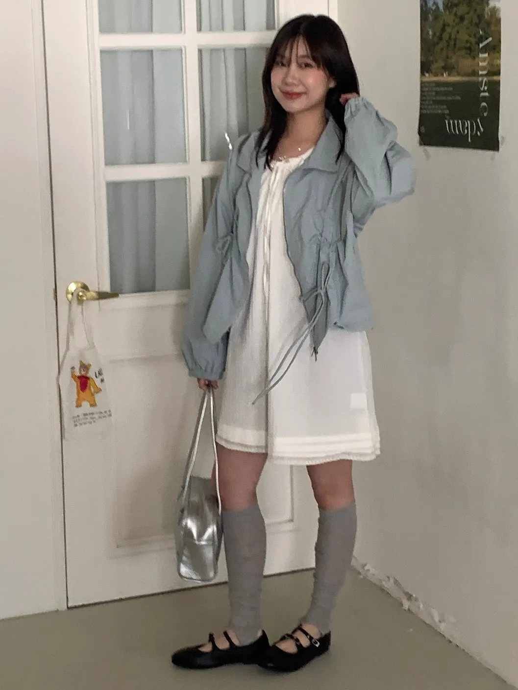 胸前雙抽繩可拉皺,可立領,下擺兩側有彈力繩可縮口