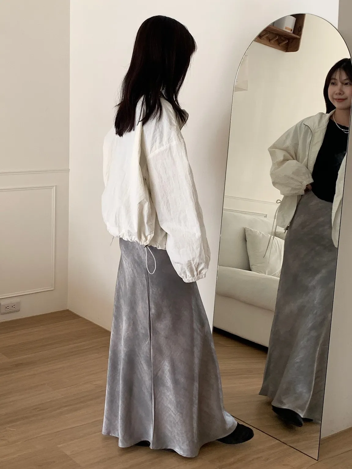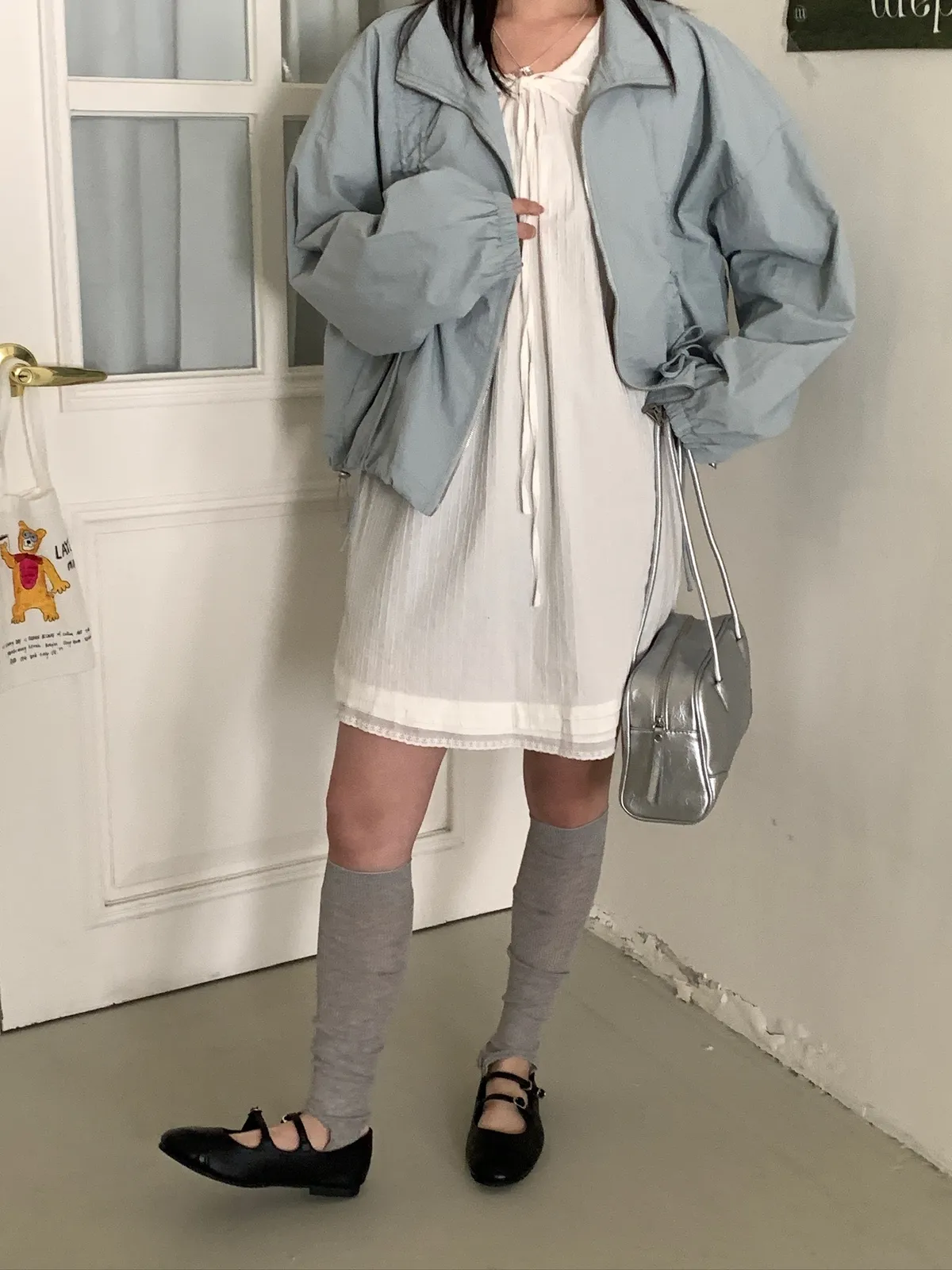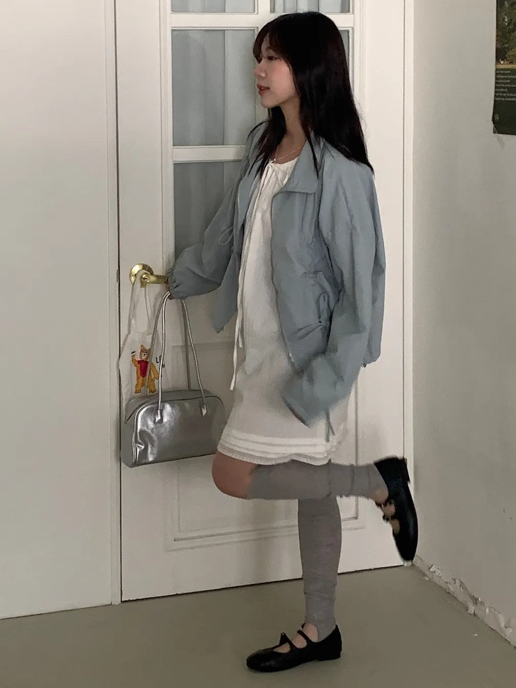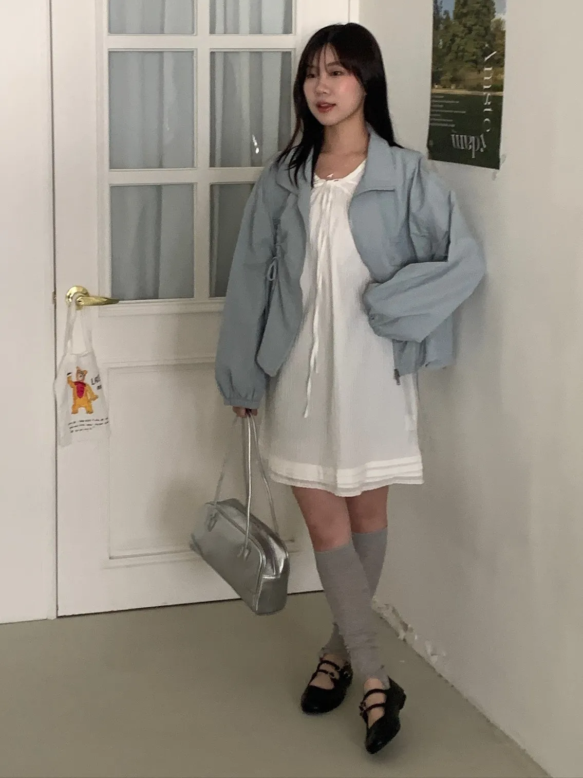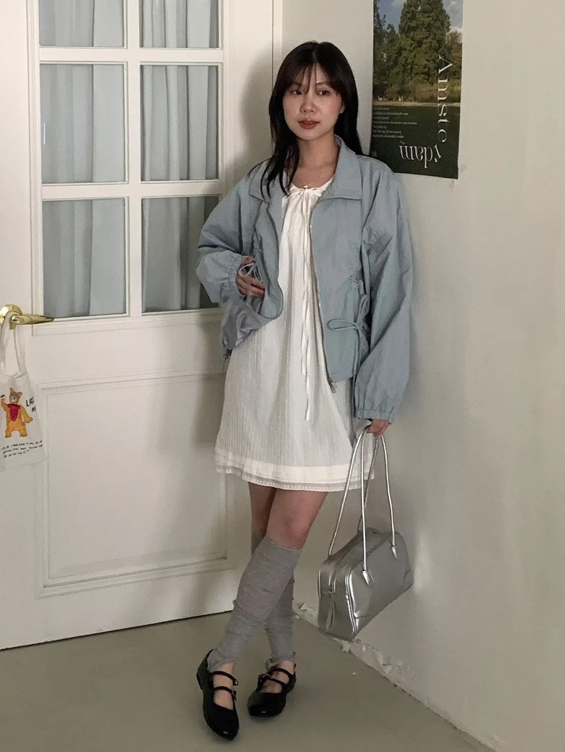 胸前雙抽繩可拉皺,可立領,下擺兩側有彈力繩可縮口