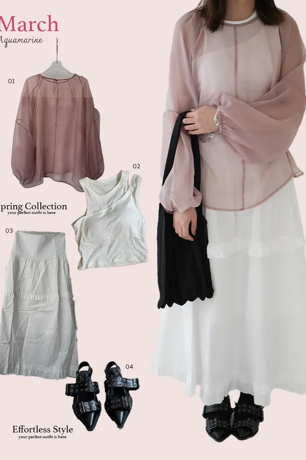 -墜入愛河 透光紗質浪漫寬袖上衣 黑5粉1灰3杏1綠1