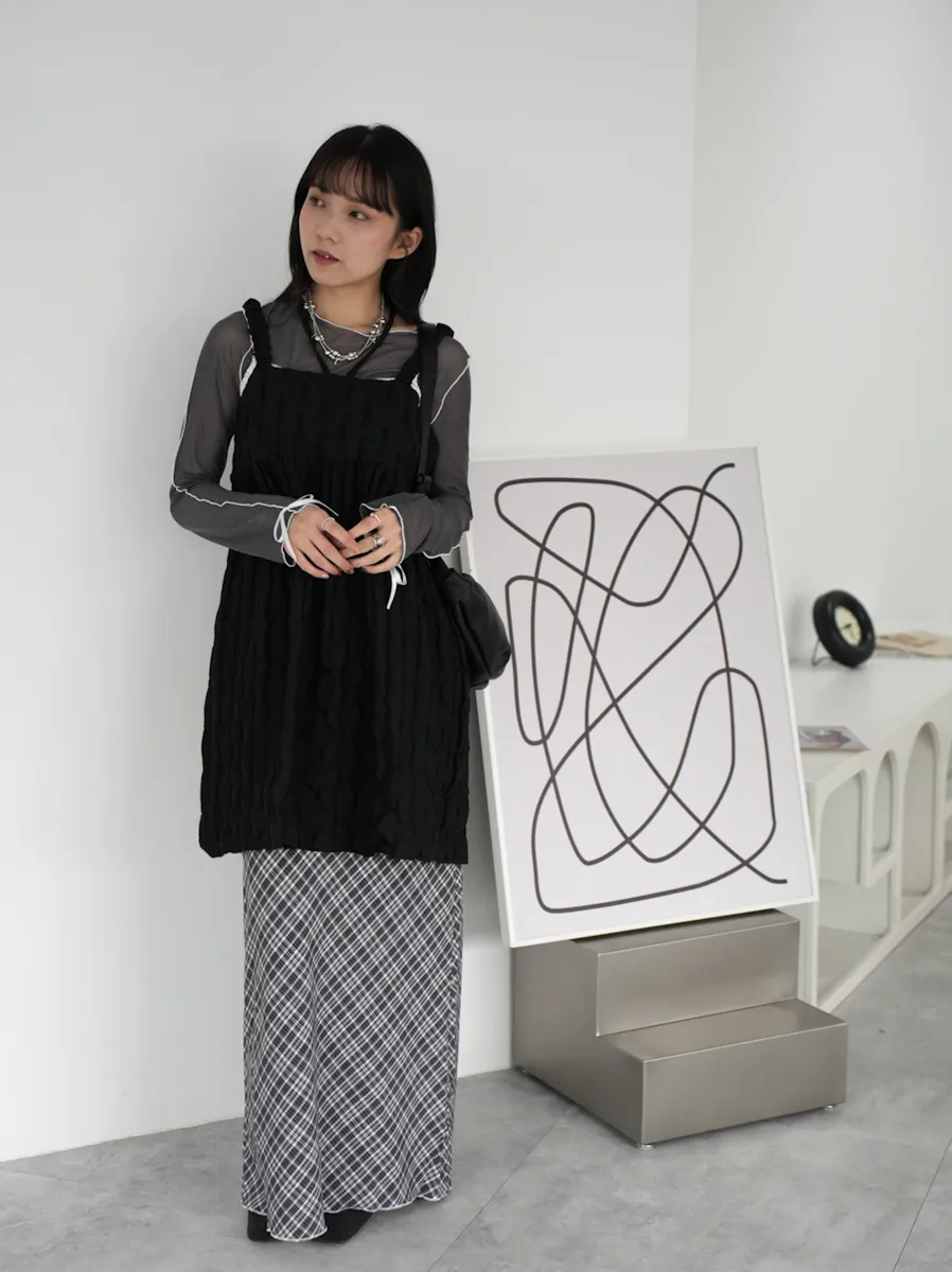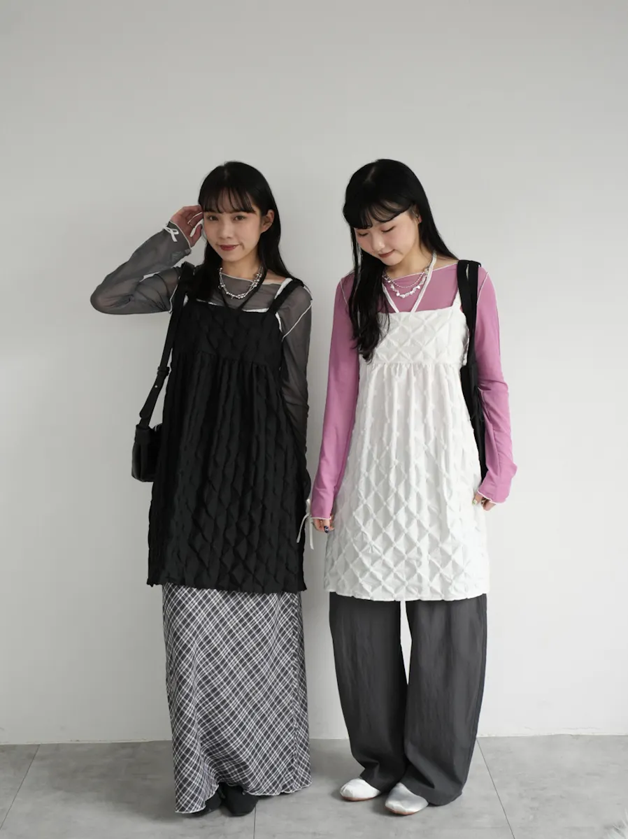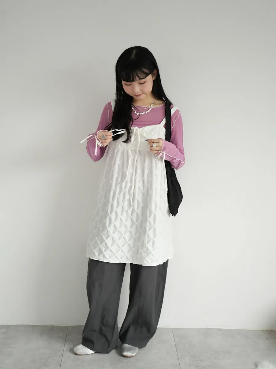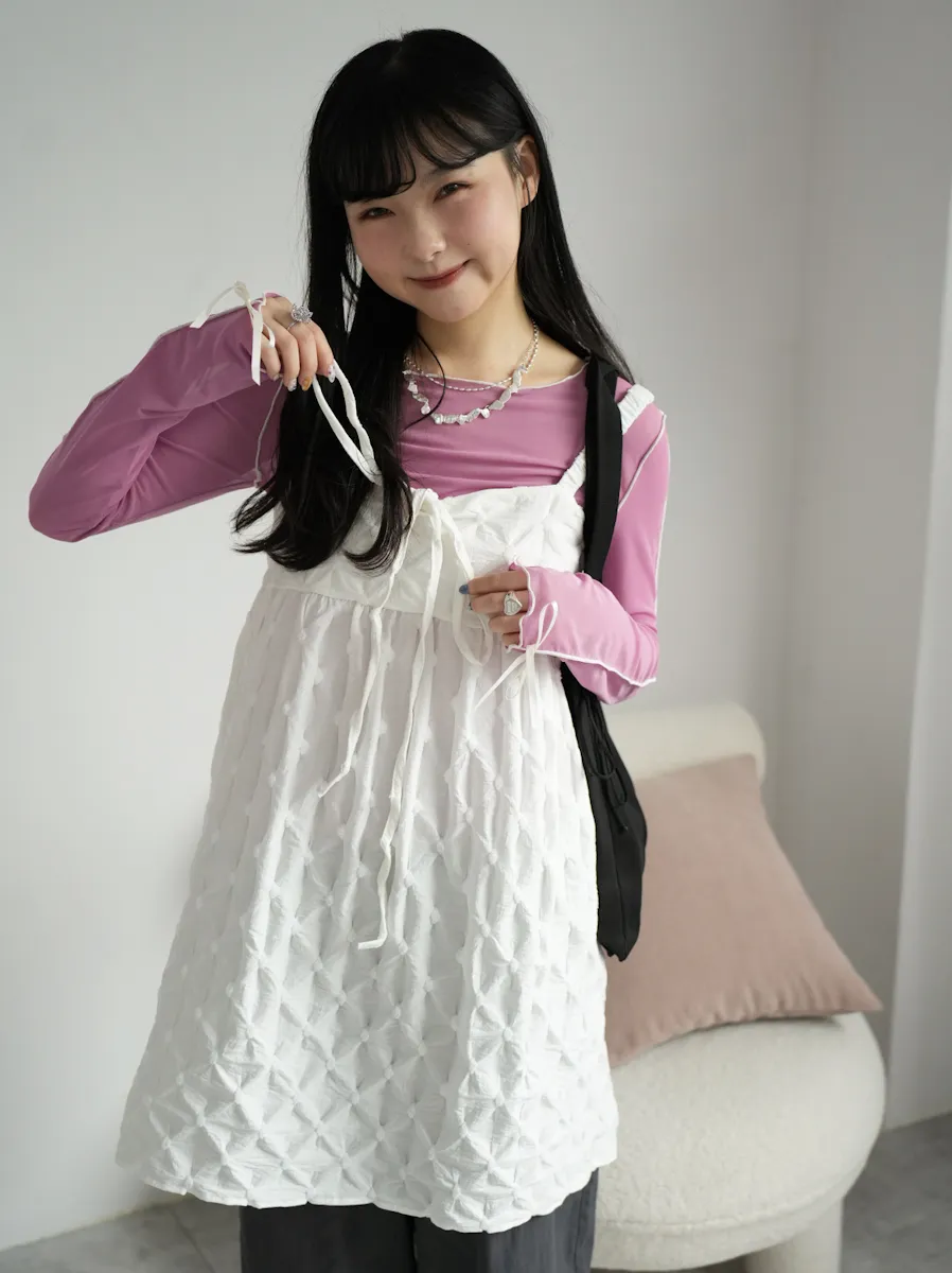 日系凹凸方格花布 胸前綁繩五分洋裝 2color