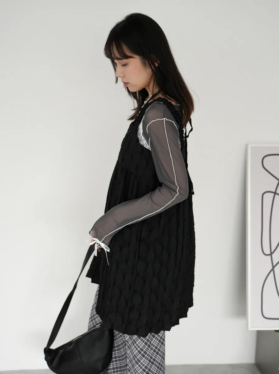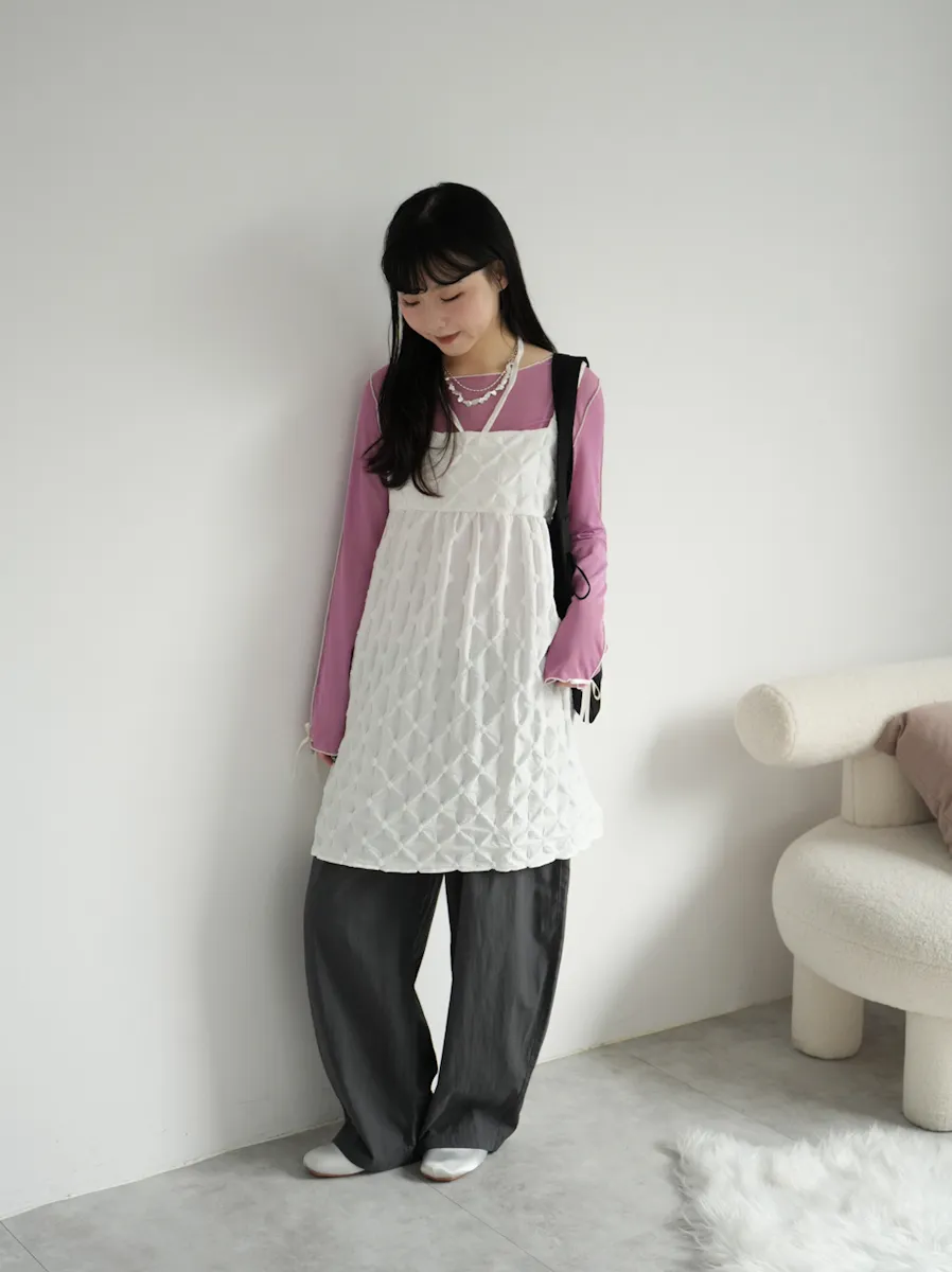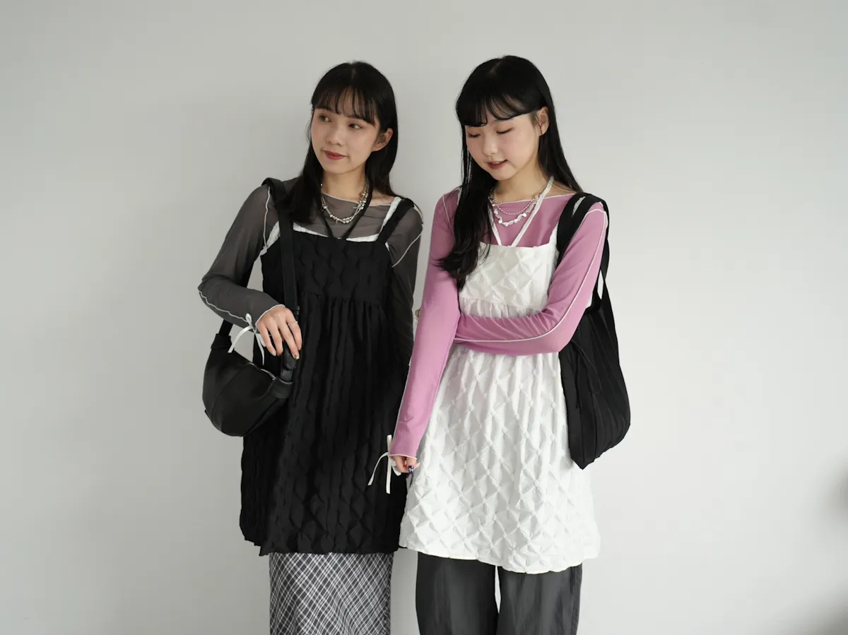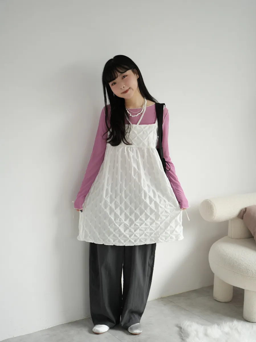 日系凹凸方格花布 胸前綁繩五分洋裝 2color
