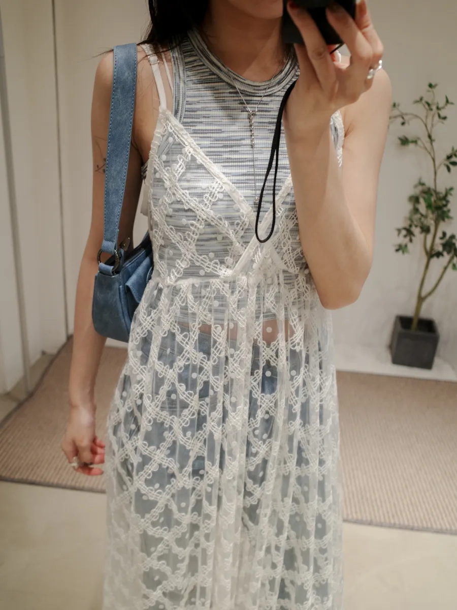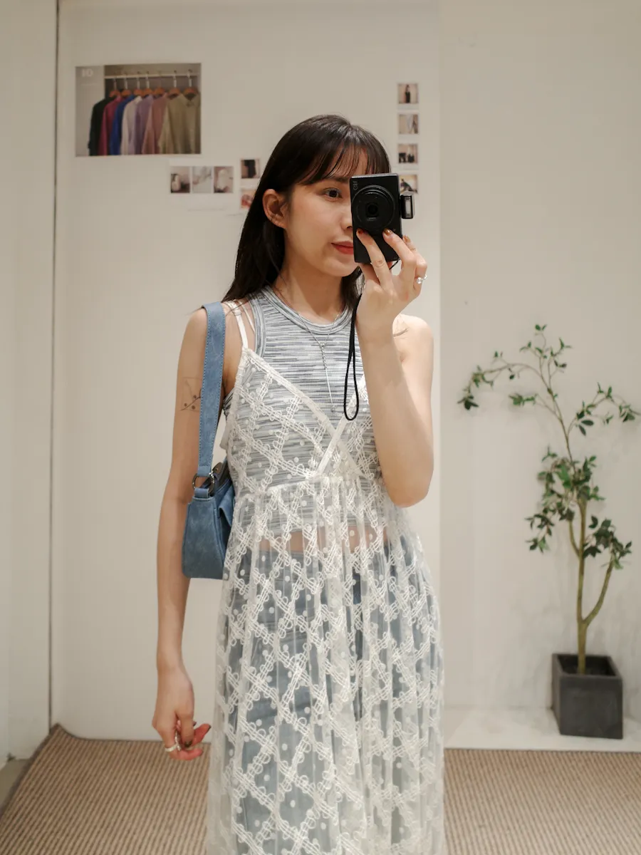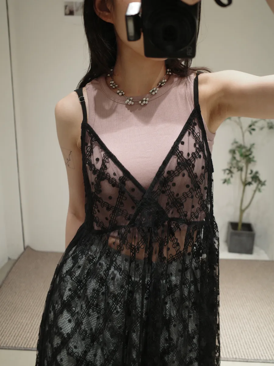 蕾絲疊穿著細肩帶亮片洋裝 2color