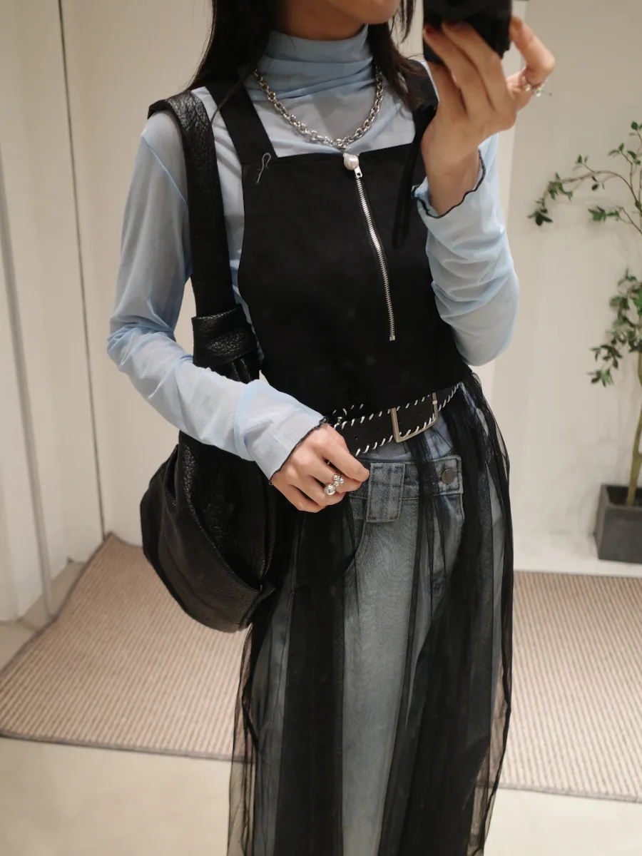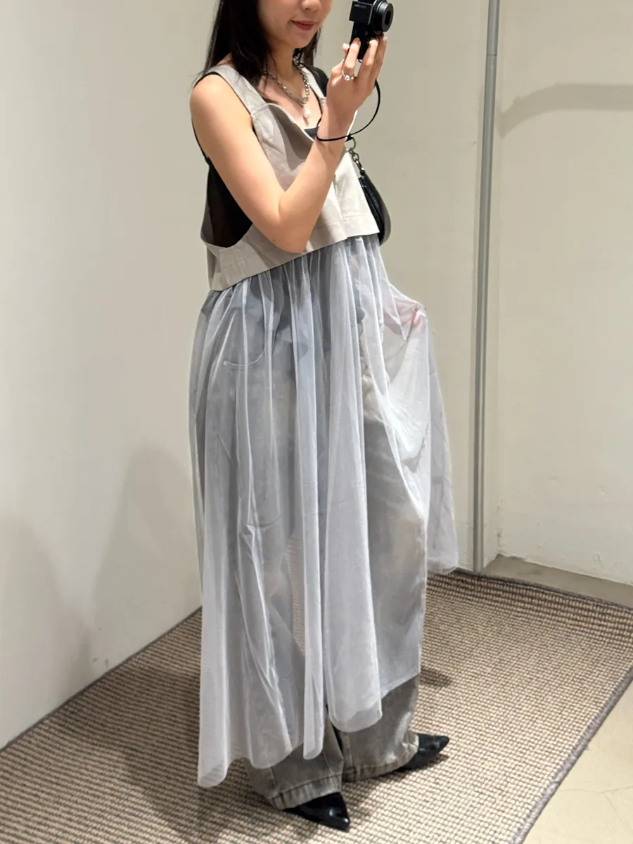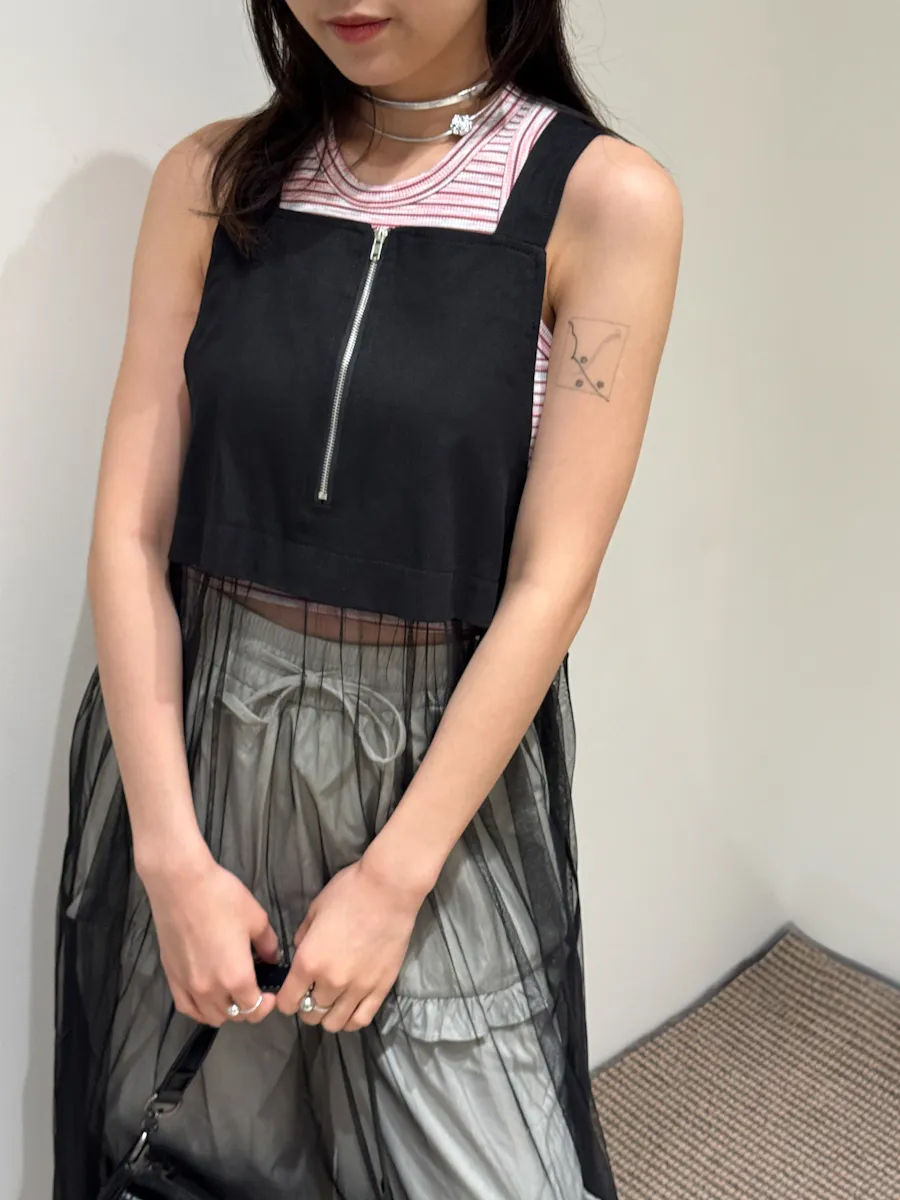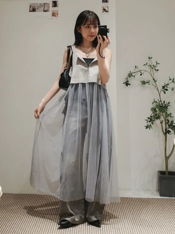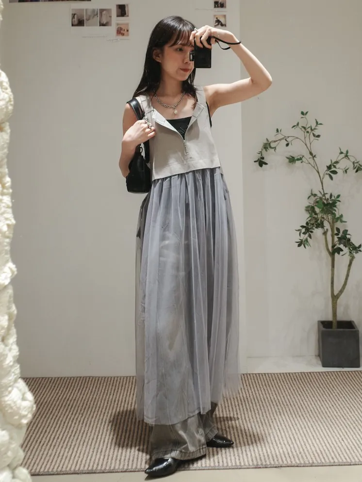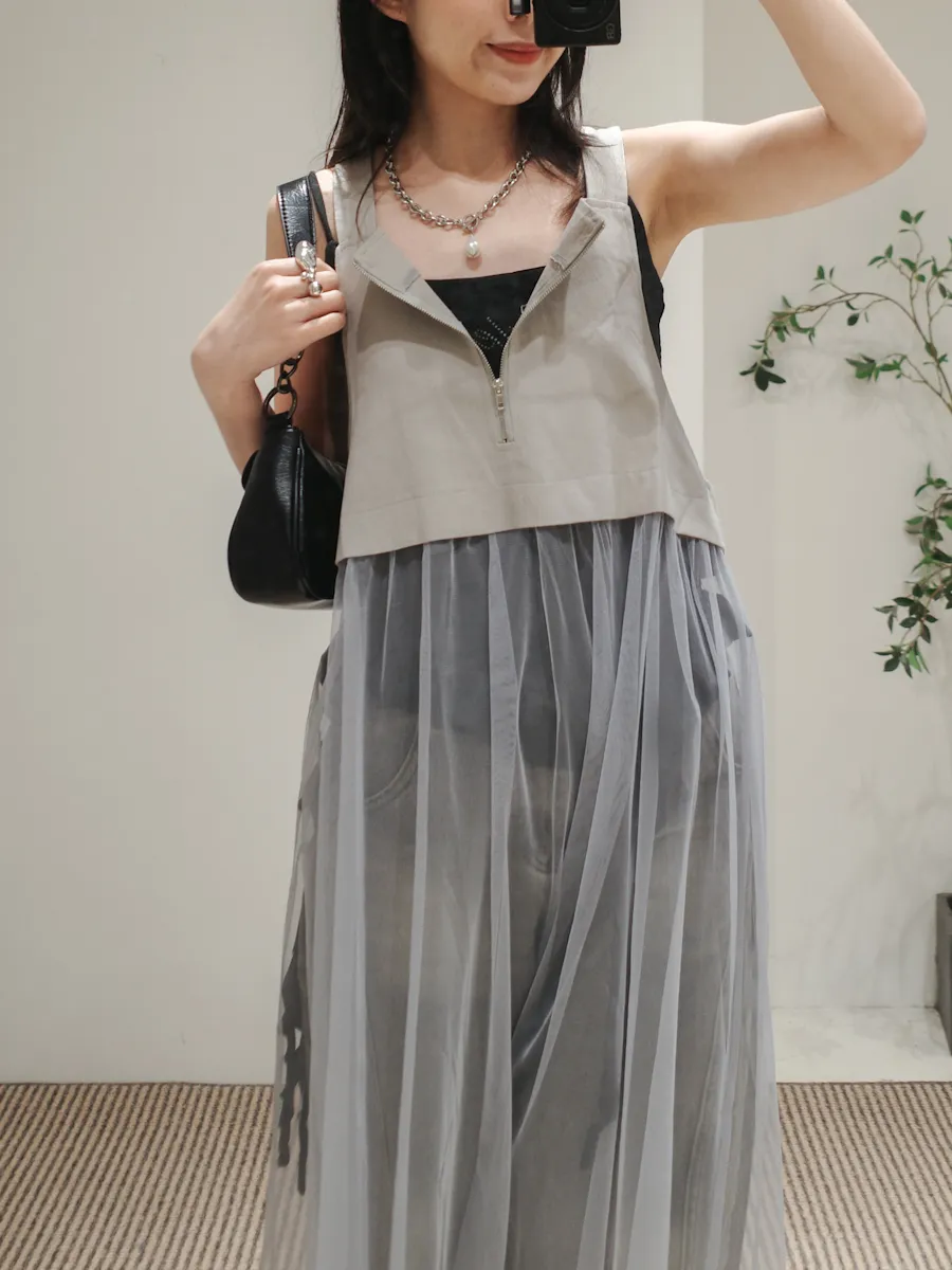 日系 吊帶前拉鏈下襬拼接紗長洋裝 2color