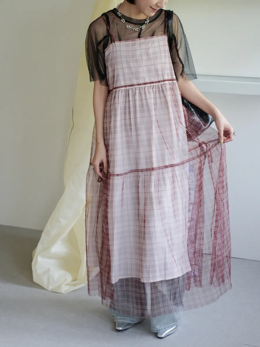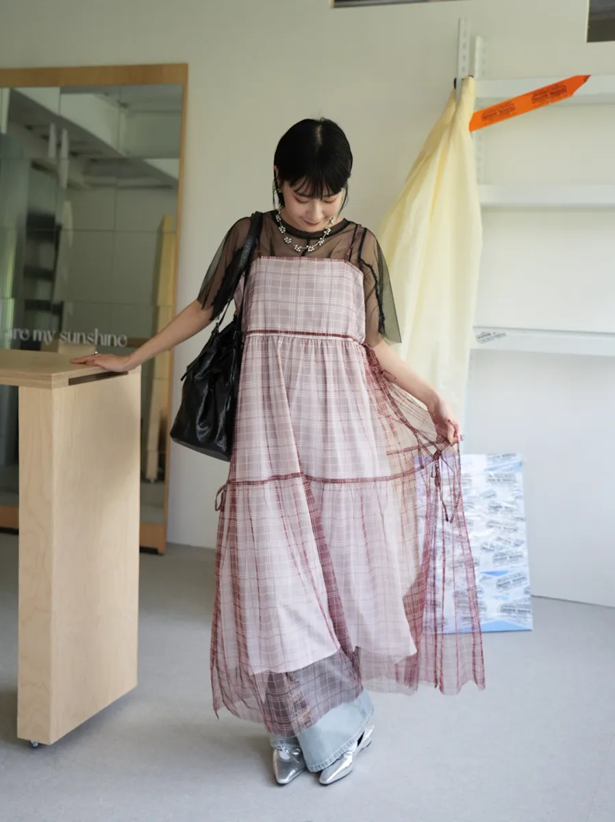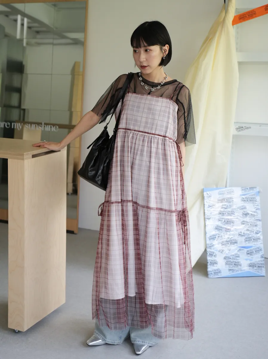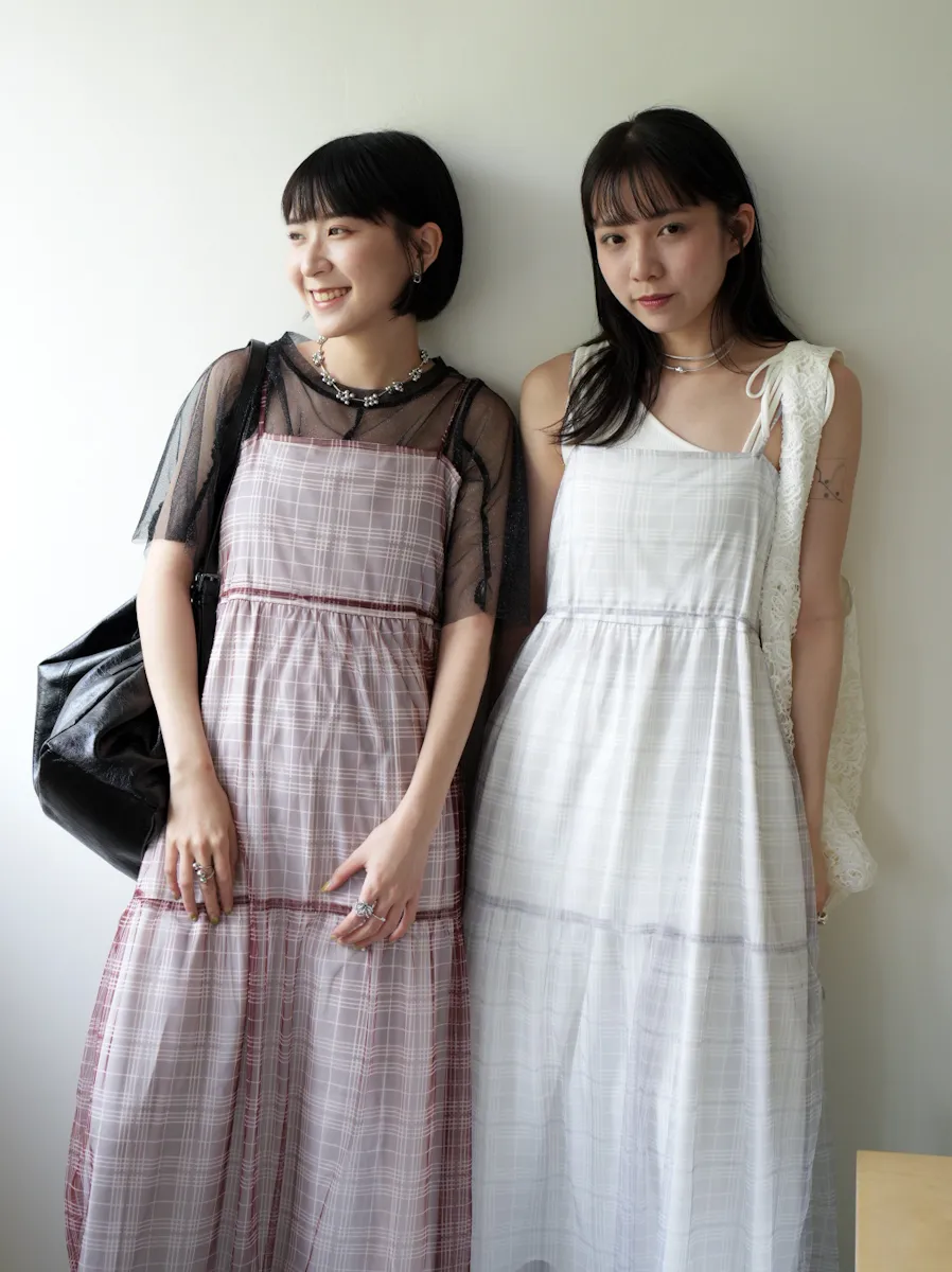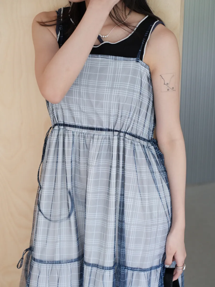 回復元氣 線格雙層拼接抽繩長洋裝 3color