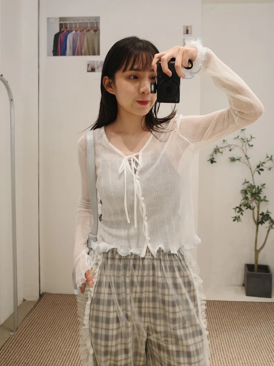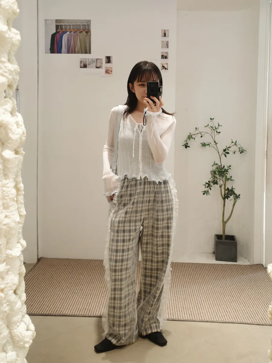 點綴穿搭拼接紗質格紋長落地褲