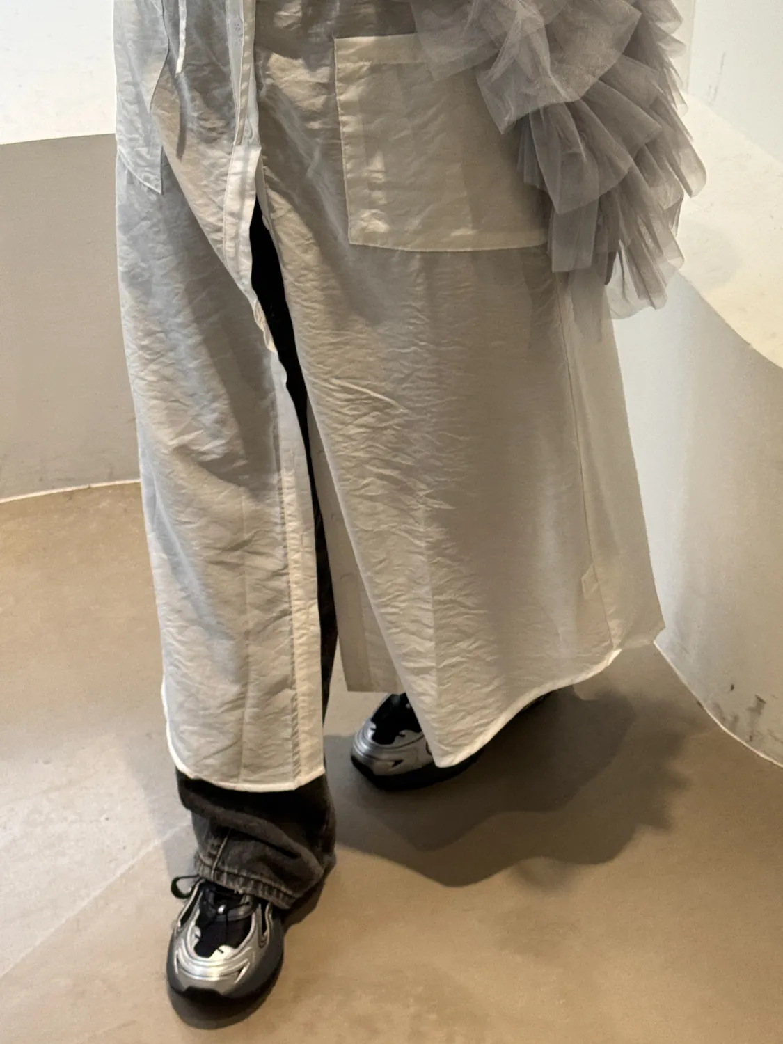後腰鬆緊帶前有抽繩,排扣,有口袋,白透