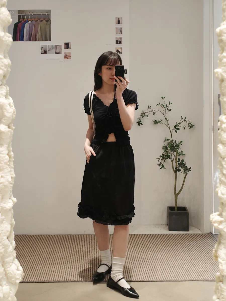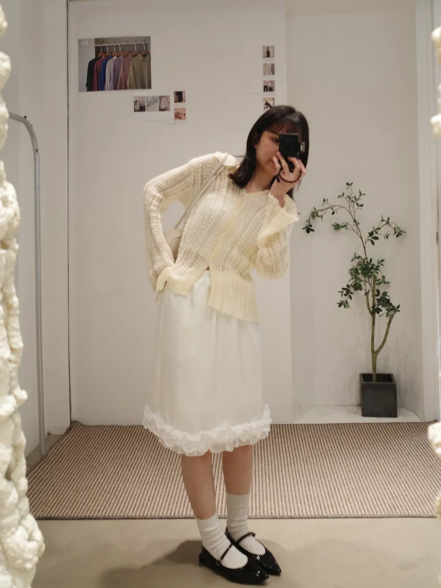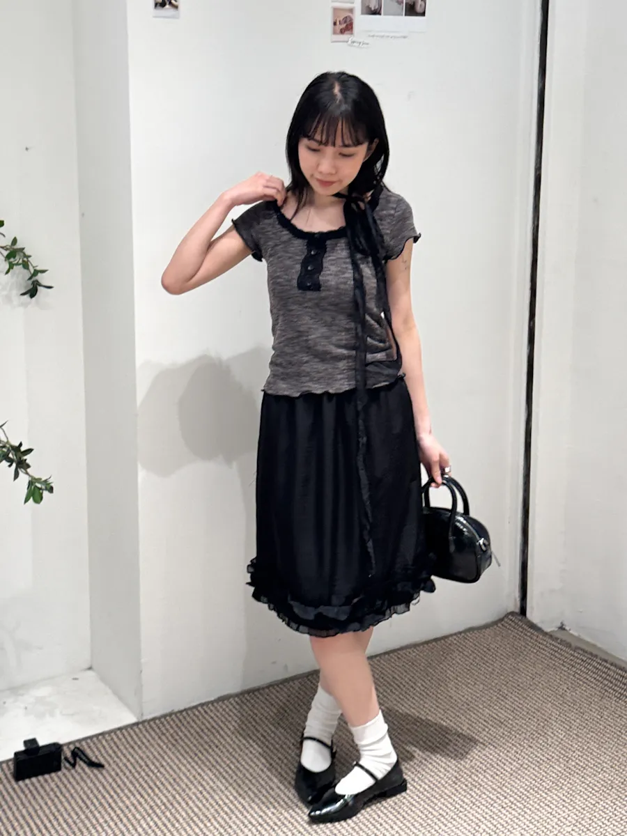 絲綢感光澤柔軟滾邊泡泡蕾絲五分長裙 2color