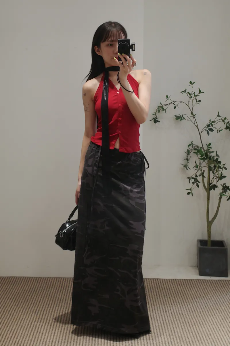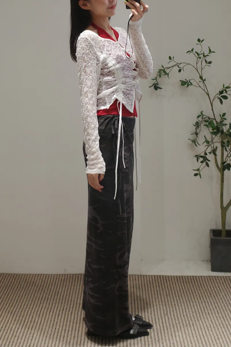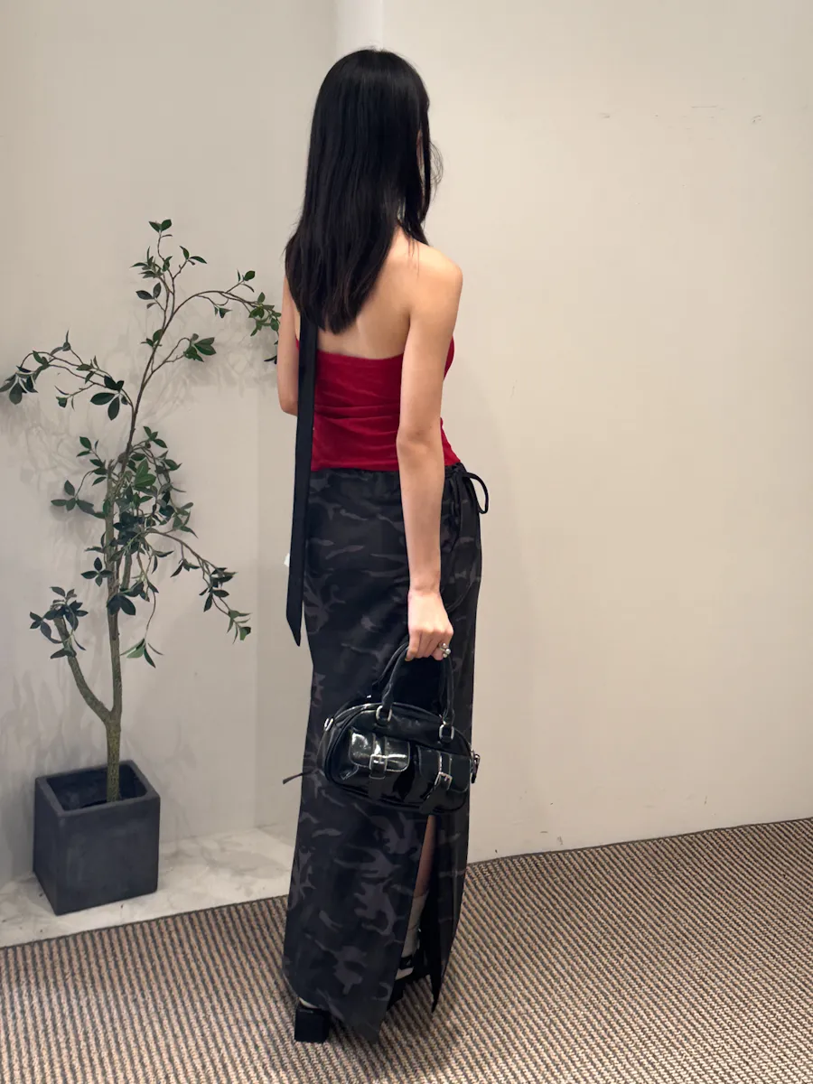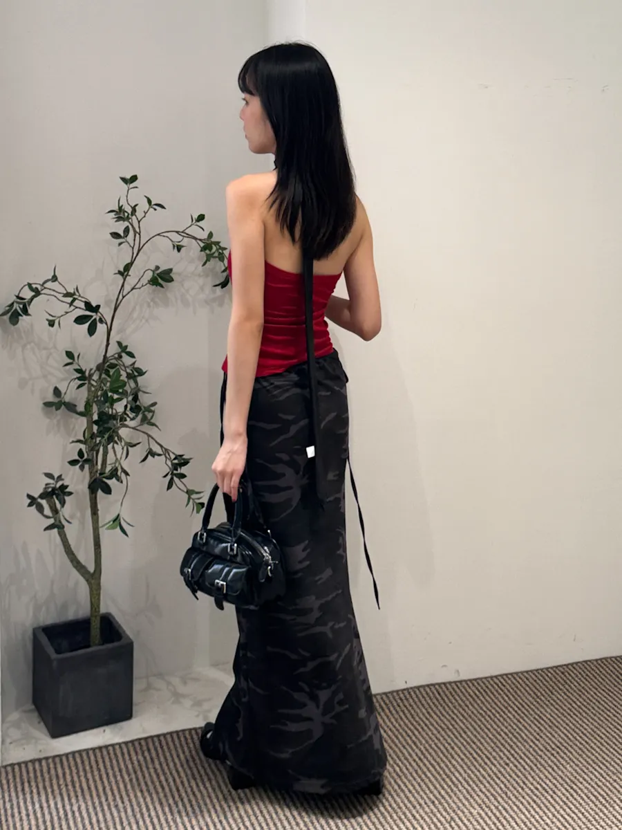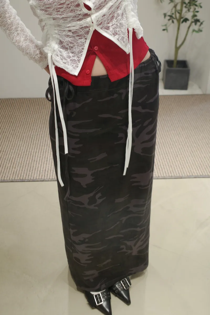 兩側腰邊有綁繩調節,單邊開衩,微彈性