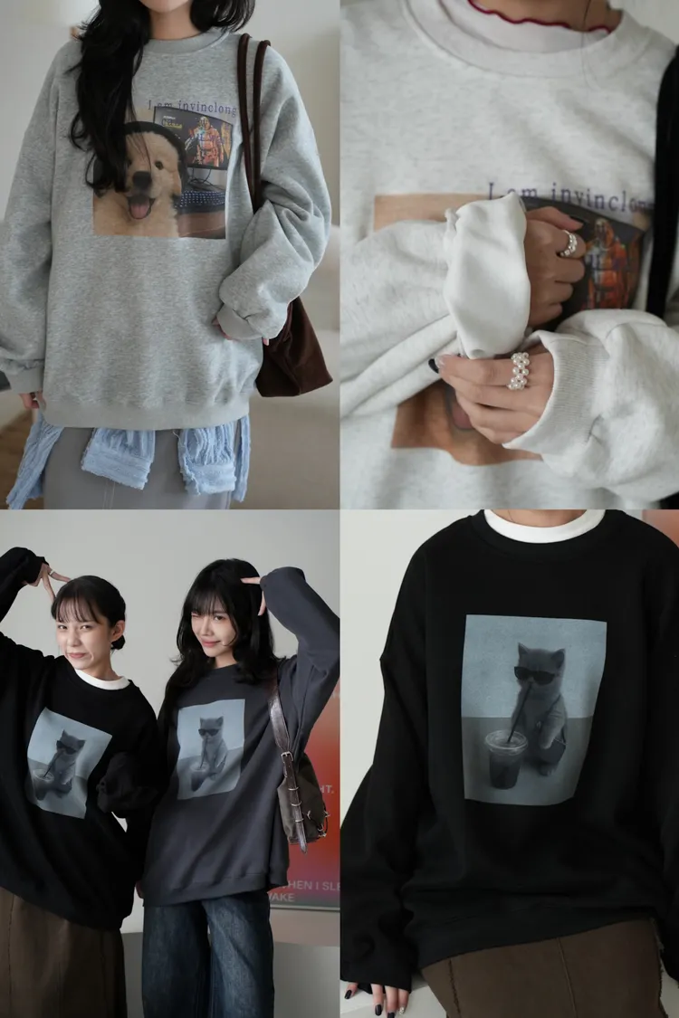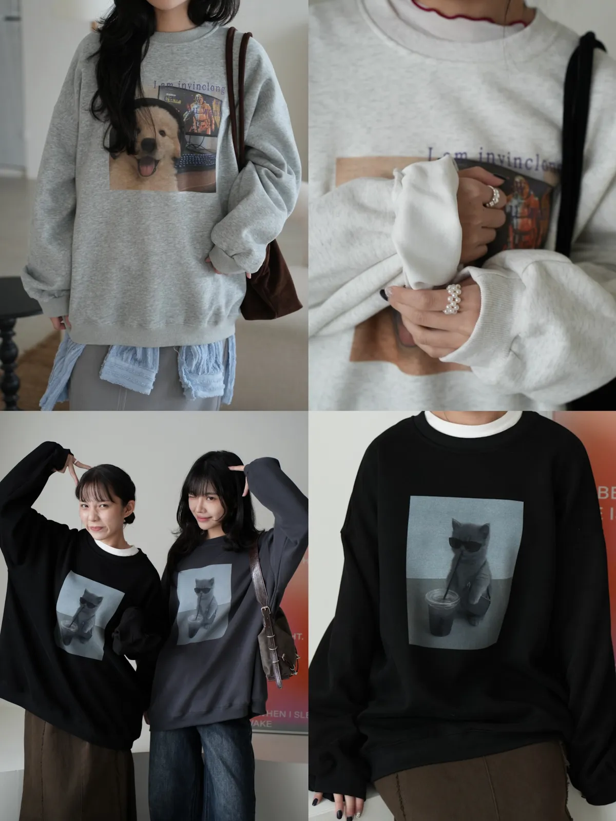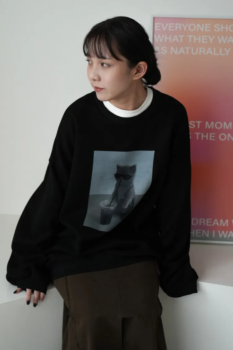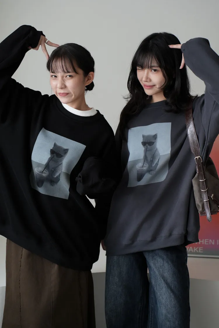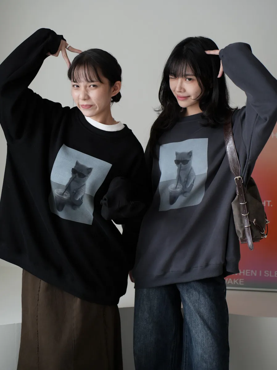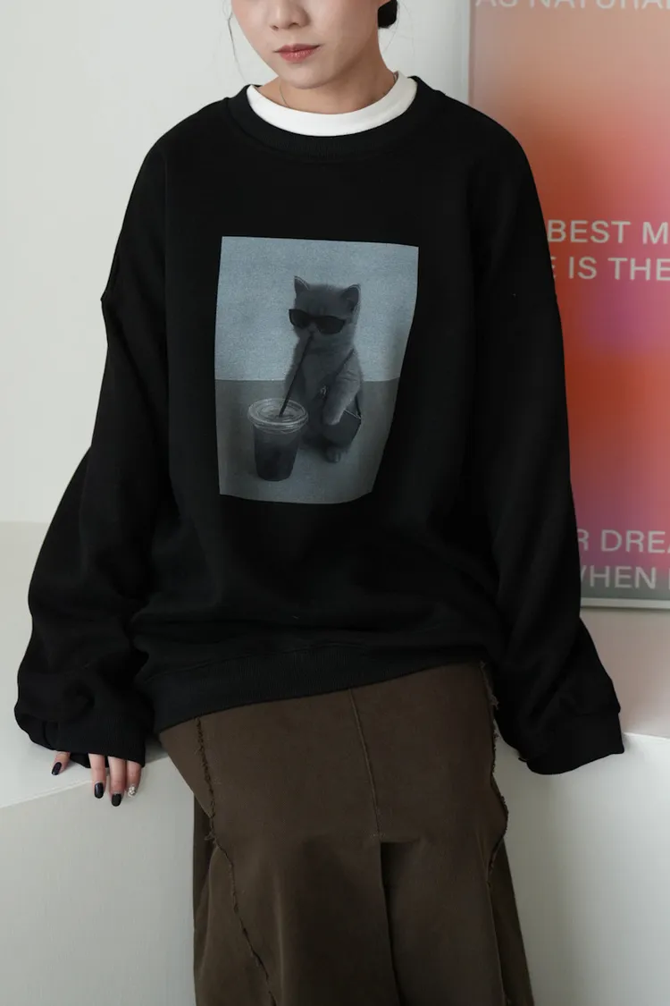 貓咪喝咖啡狗狗聽音樂長袖大學tee 4color