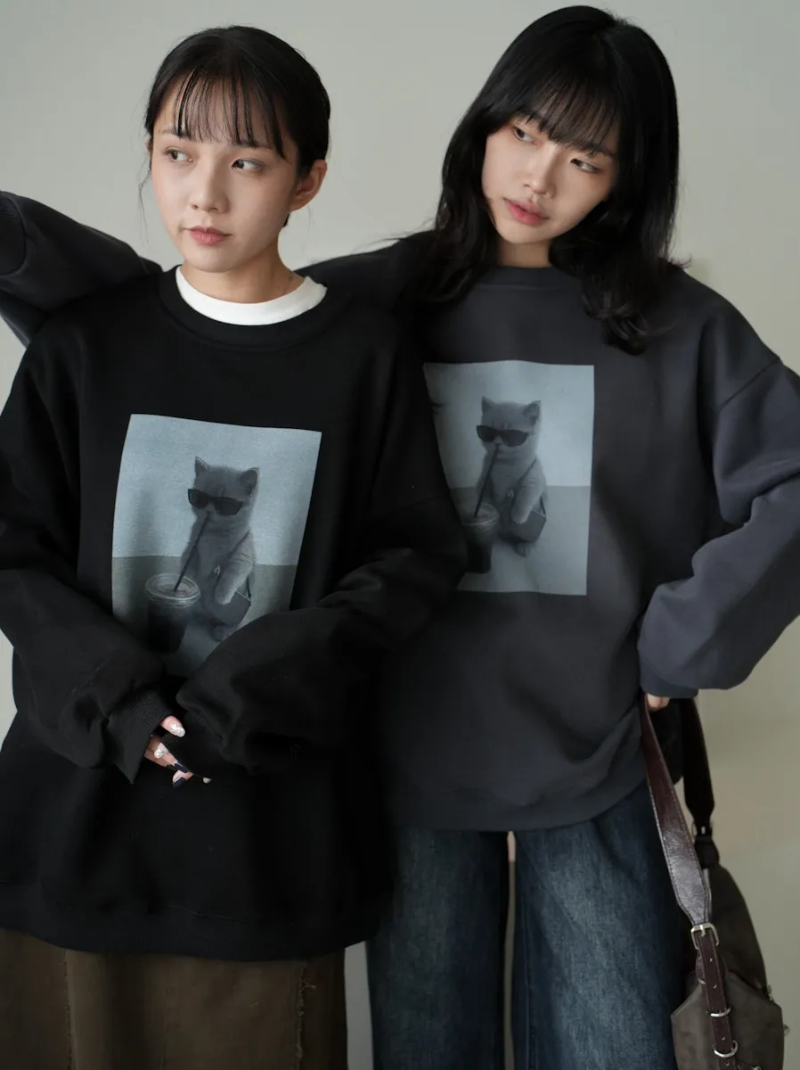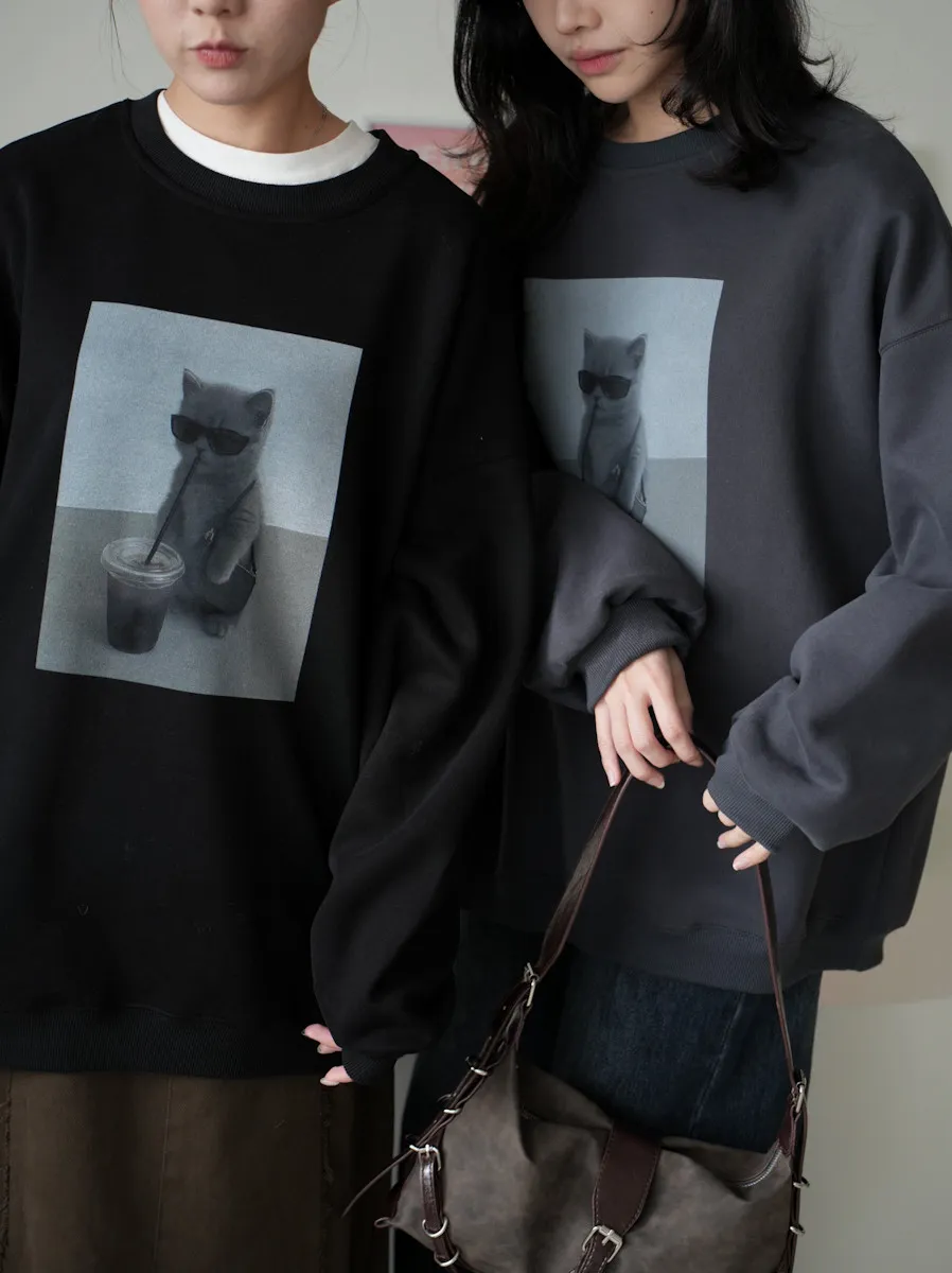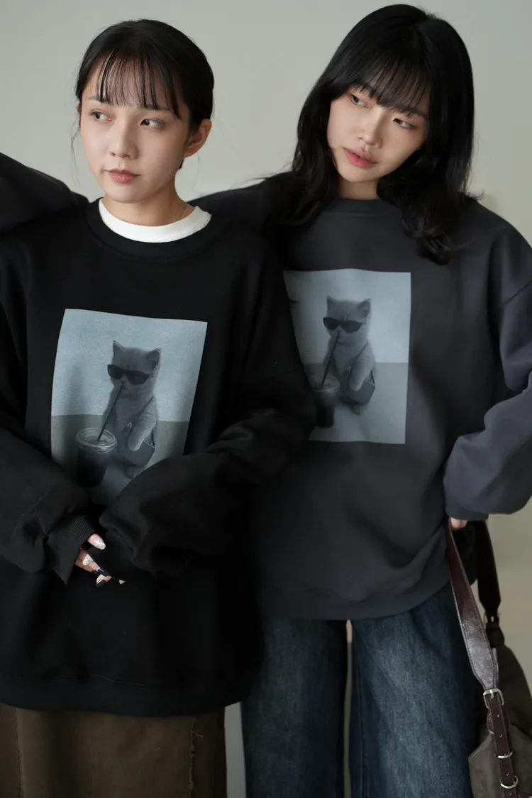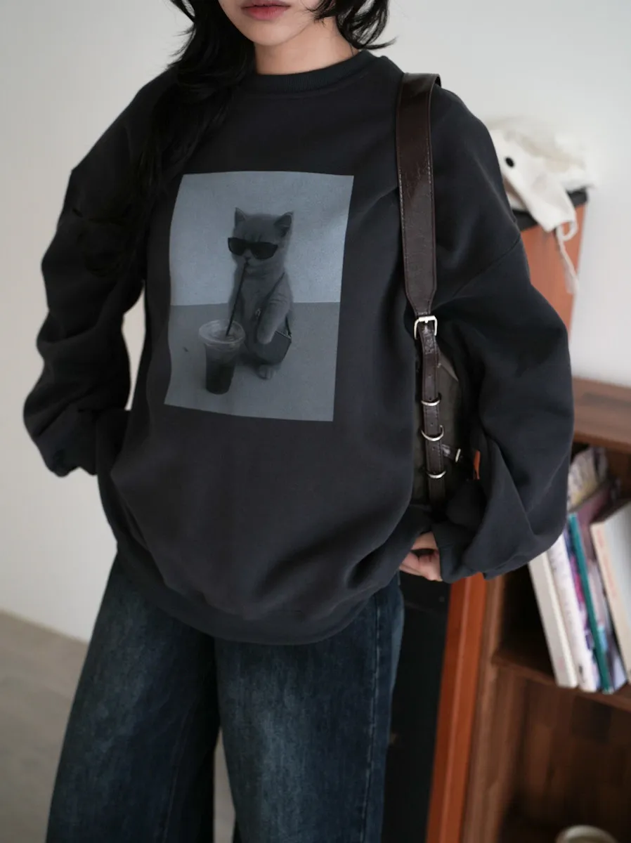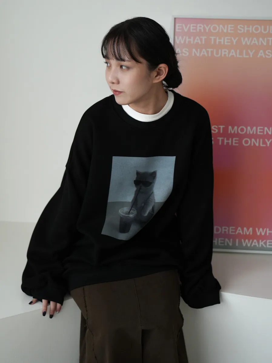 貓咪喝咖啡狗狗聽音樂長袖大學tee 4color