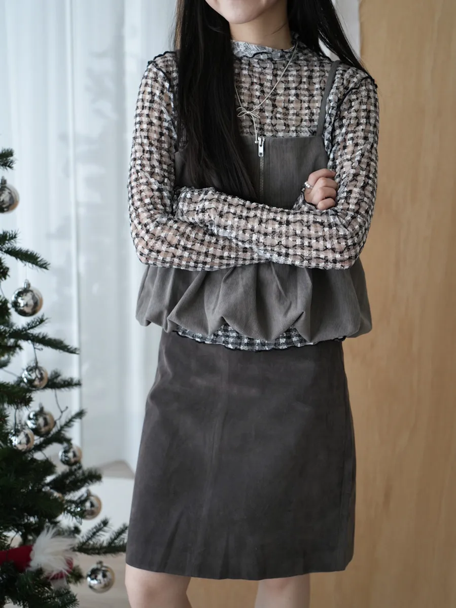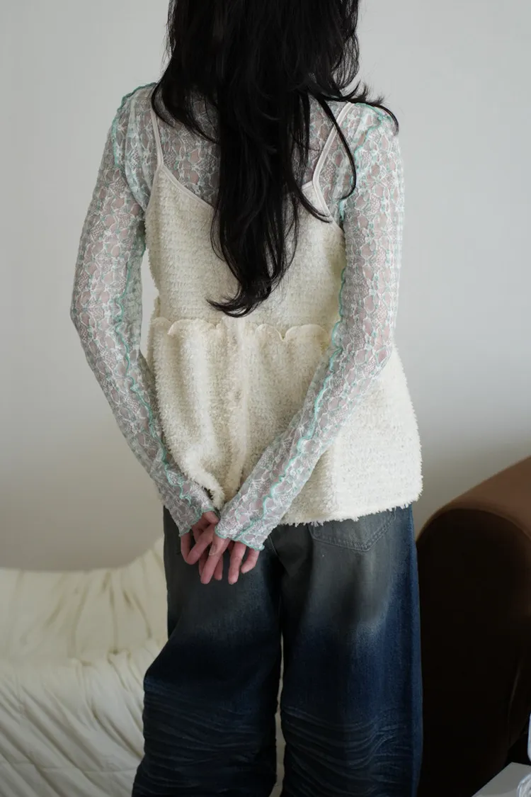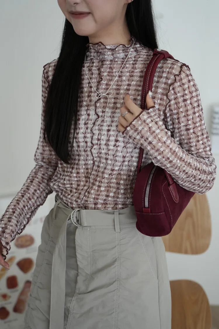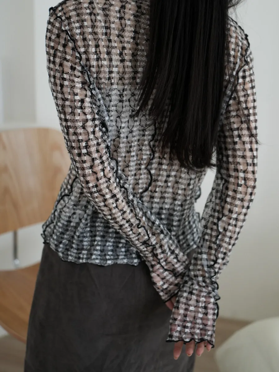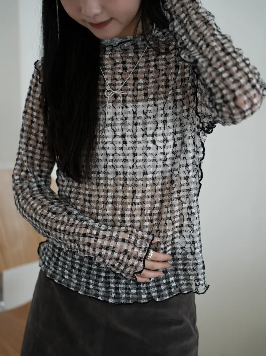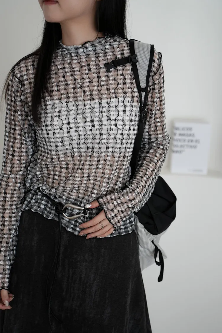 超級美 格紋蕾絲打底長袖上衣 4color