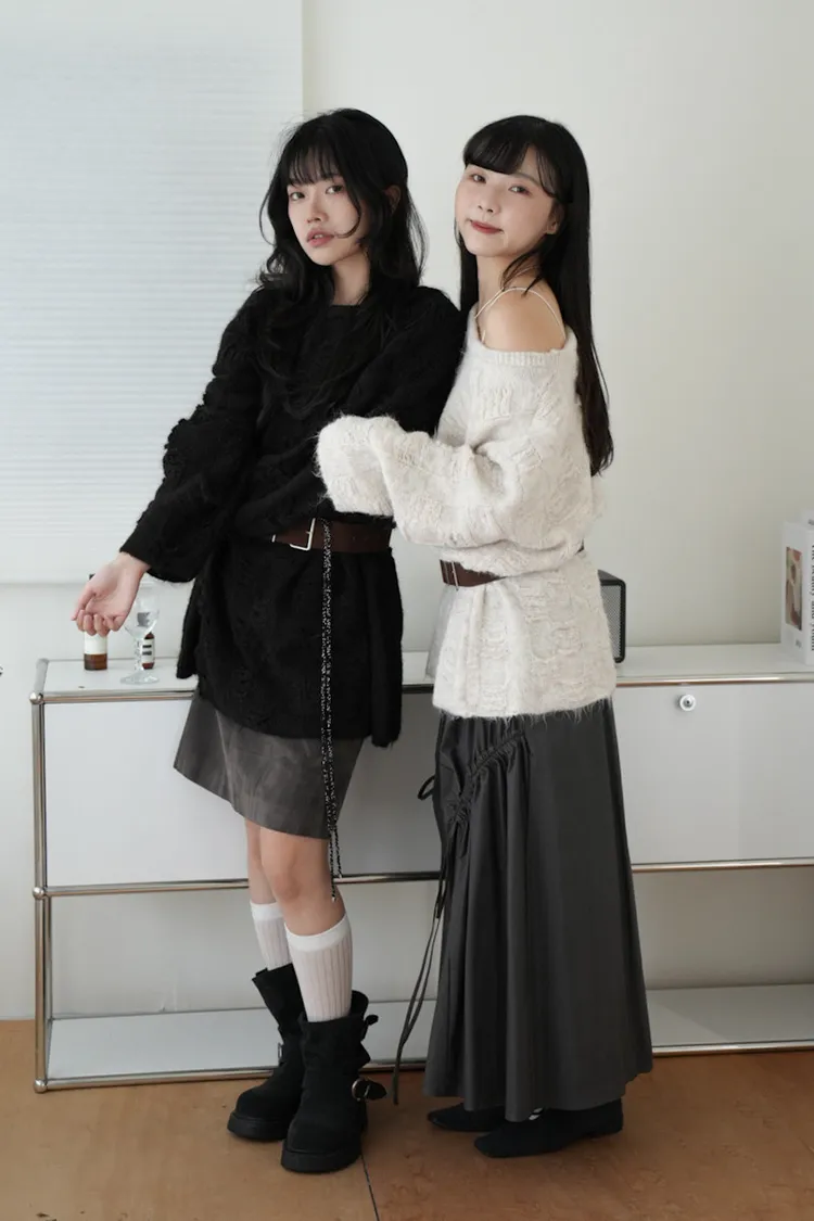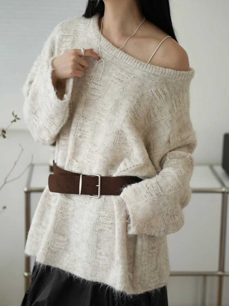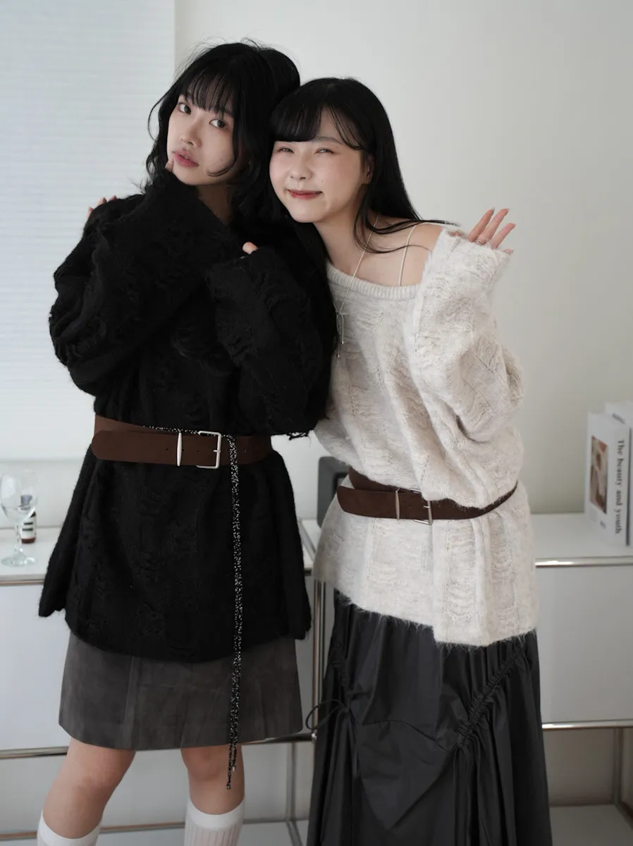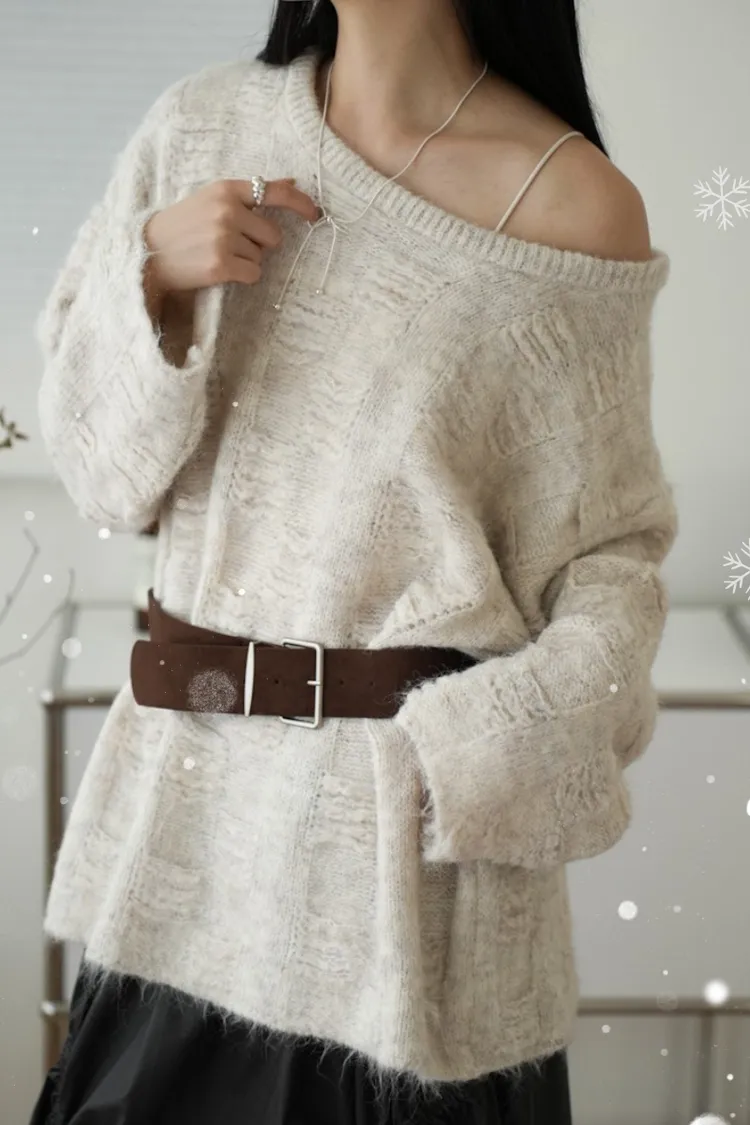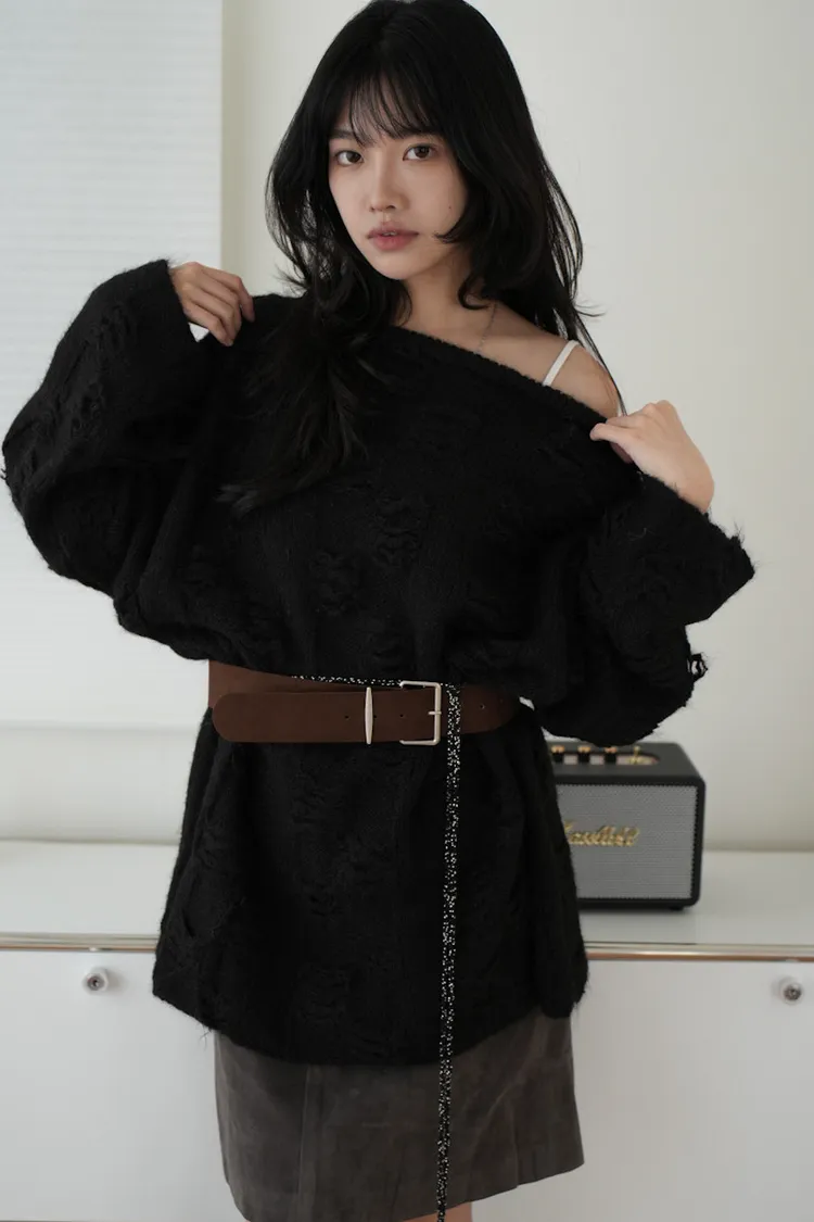 慵懶犯規 破壞感斜肩大毛衣附皮帶 2color
