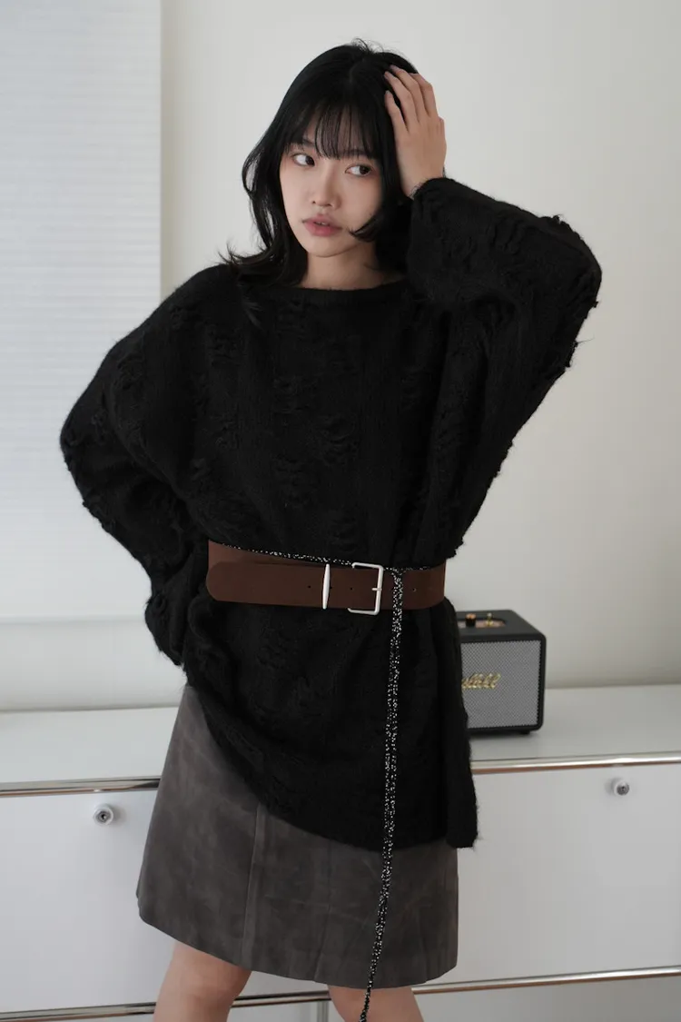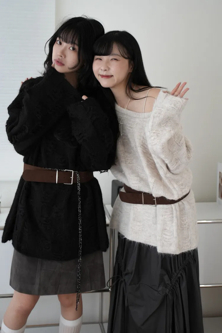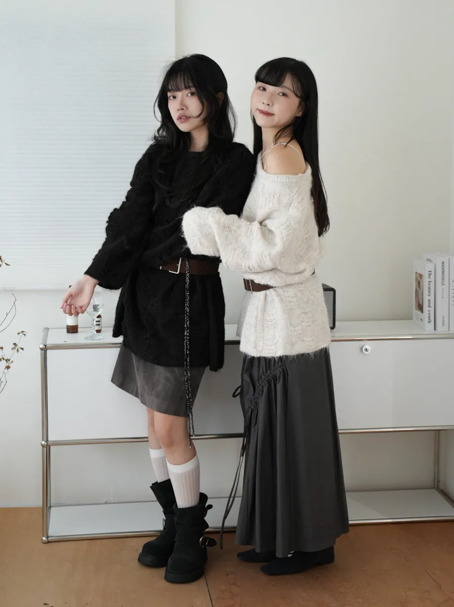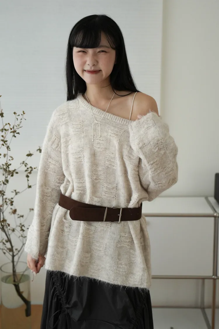 慵懶犯規 破壞感斜肩大毛衣附皮帶 2color