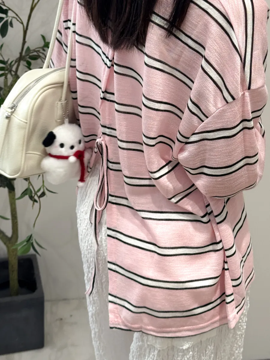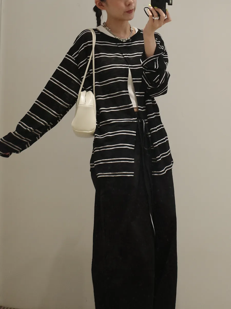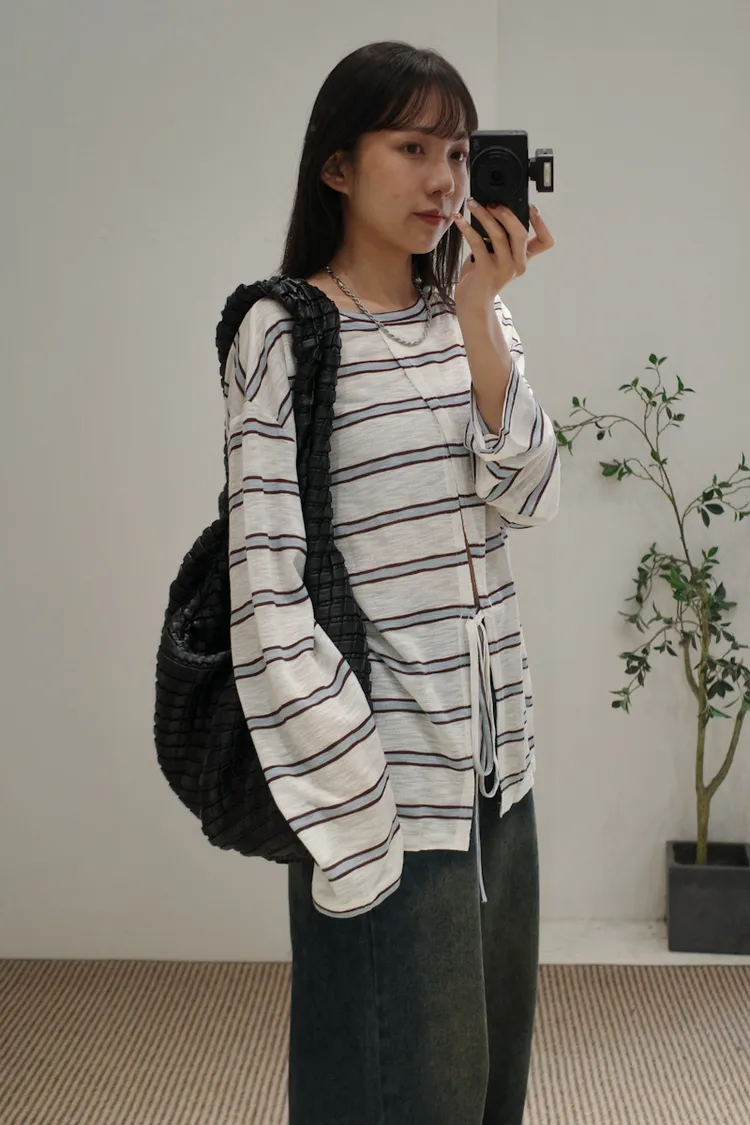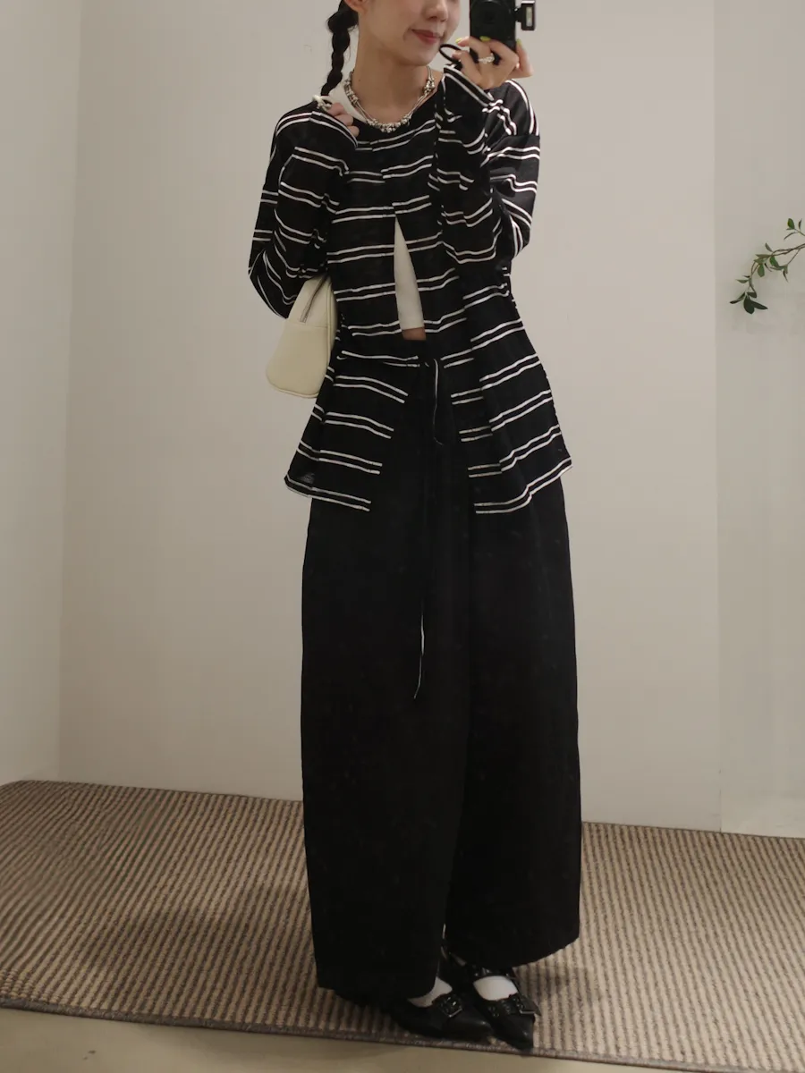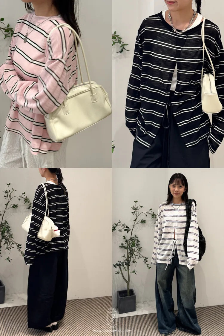 早秋橫條開衩薄針織長袖上衣 3color