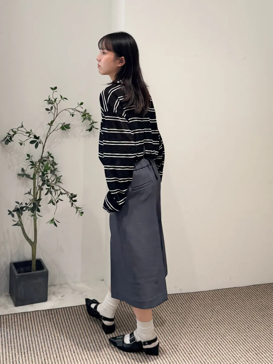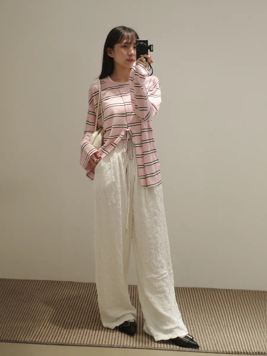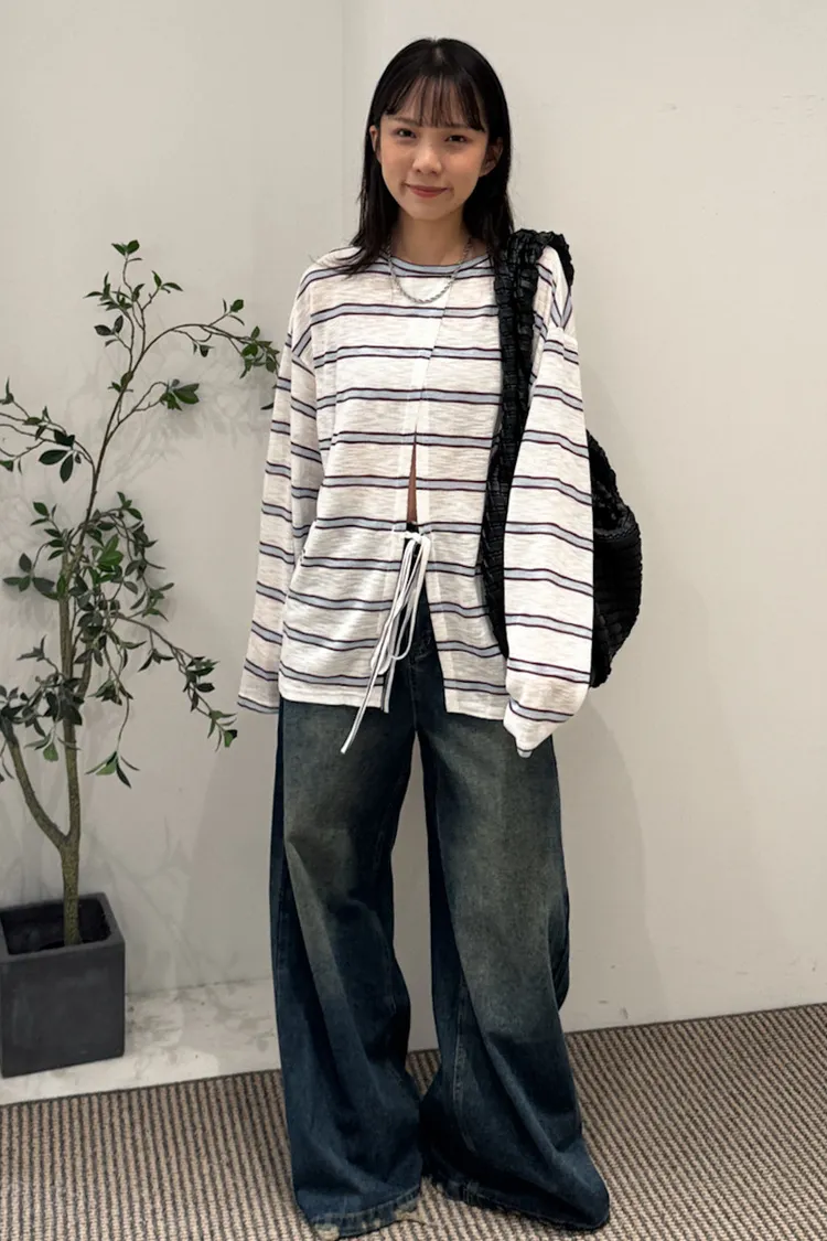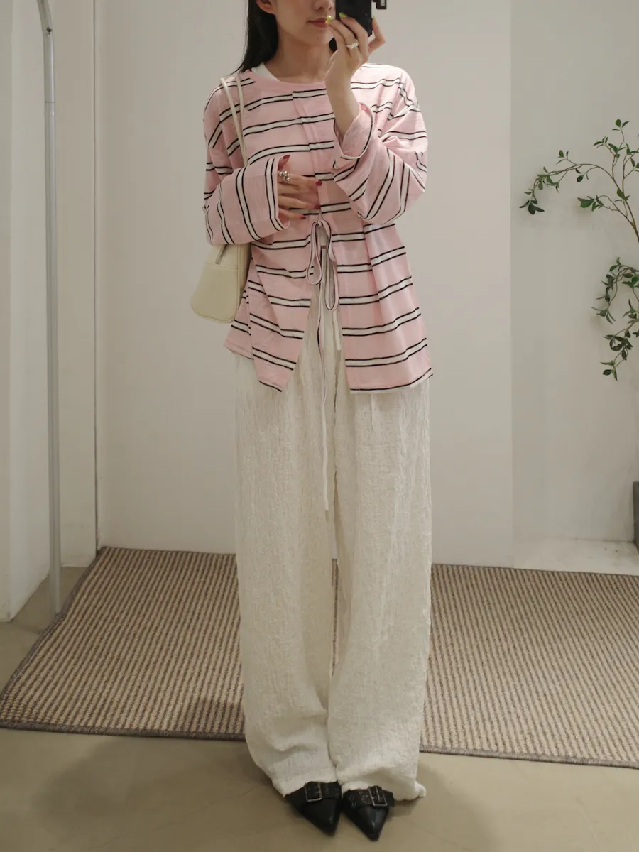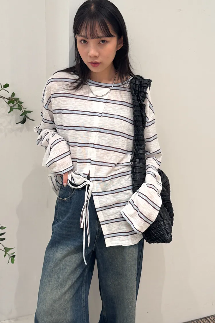 早秋橫條開衩薄針織長袖上衣 3color