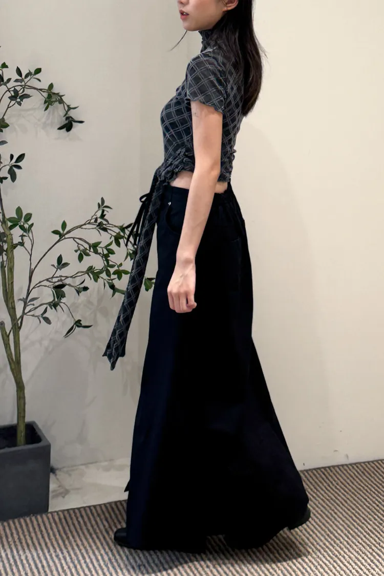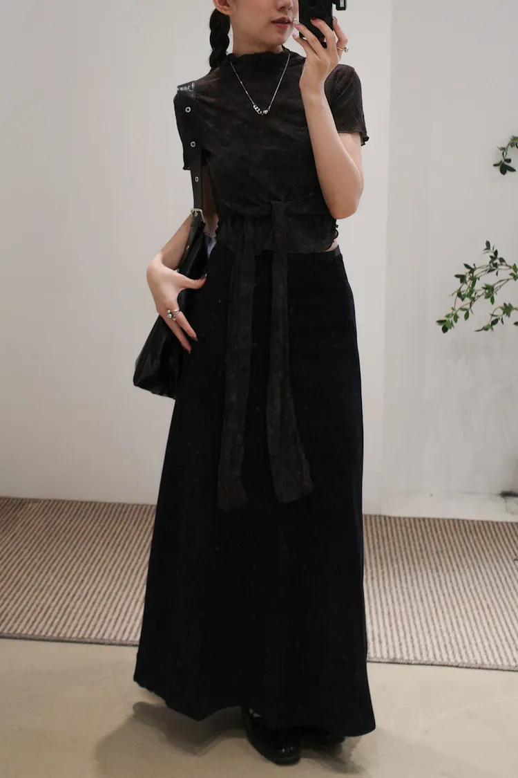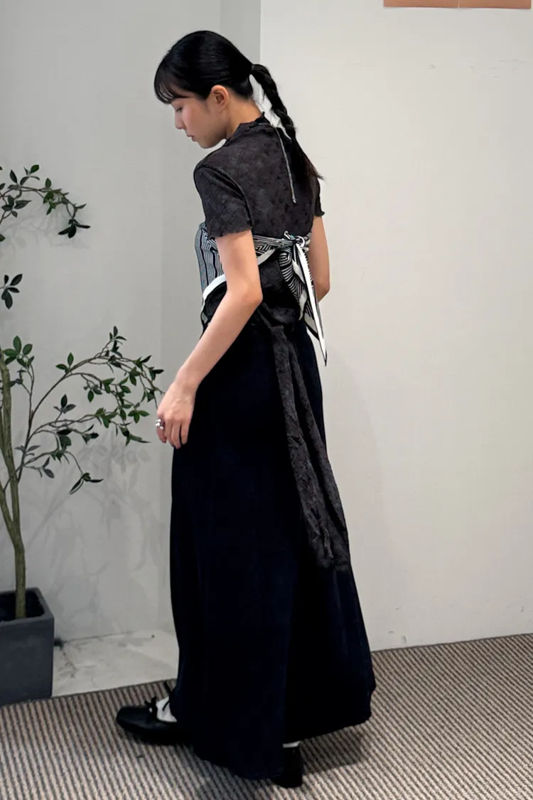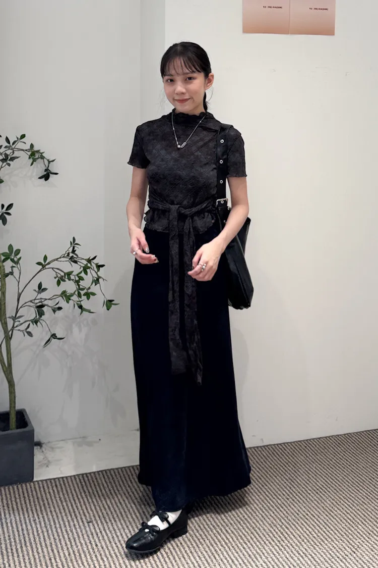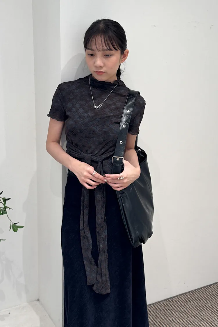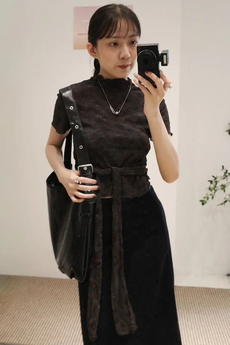 有彈性,微立領,捲捲邊,下擺圓弧狀,腰有綁繩