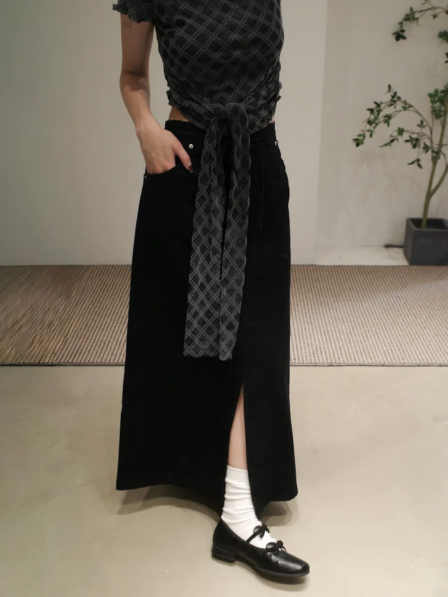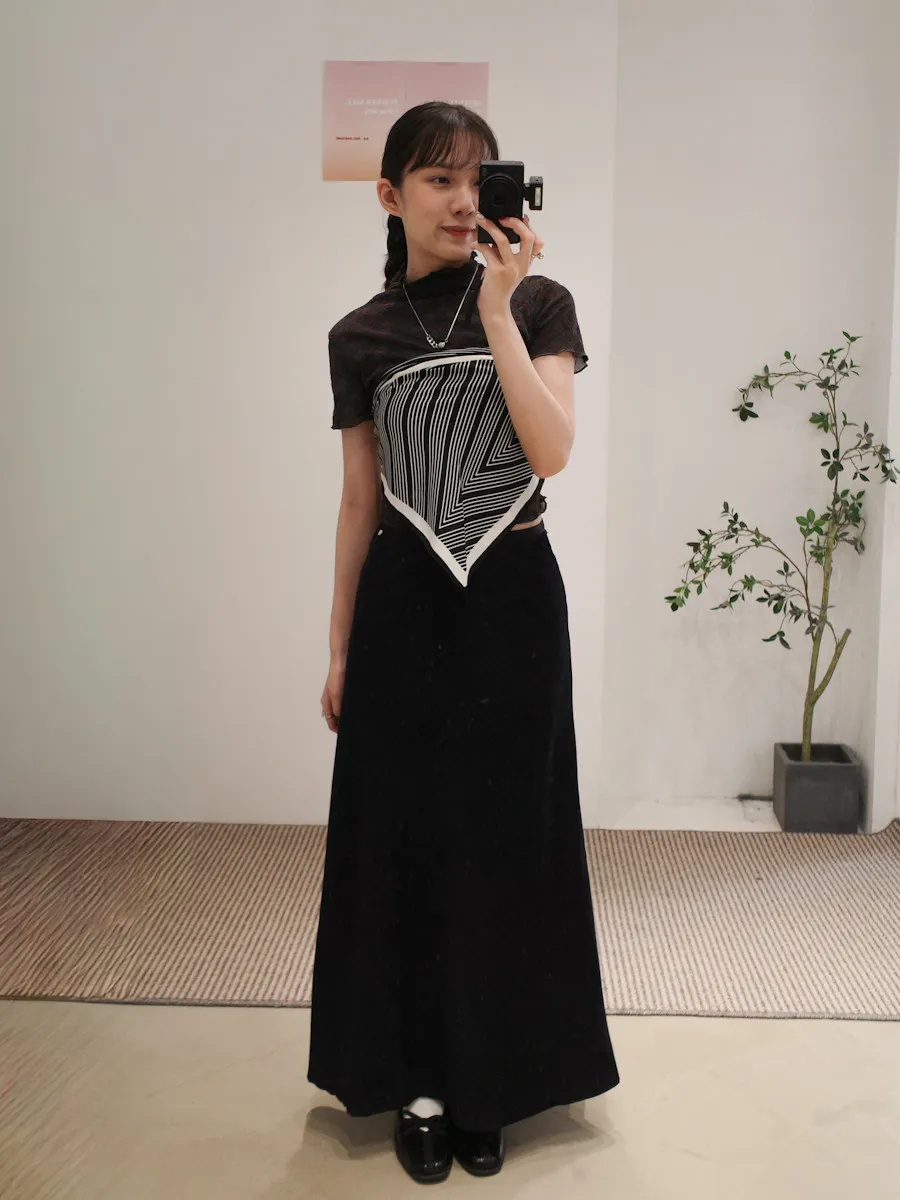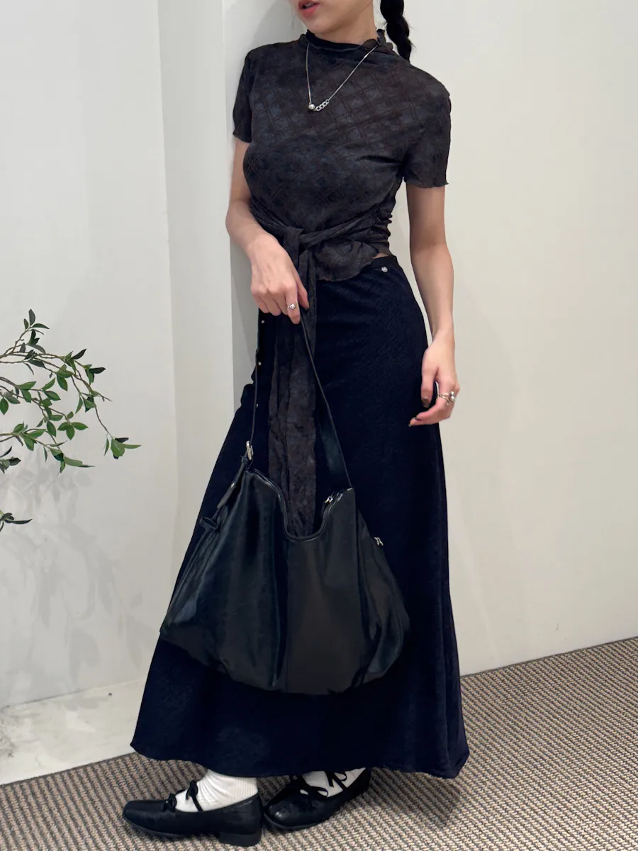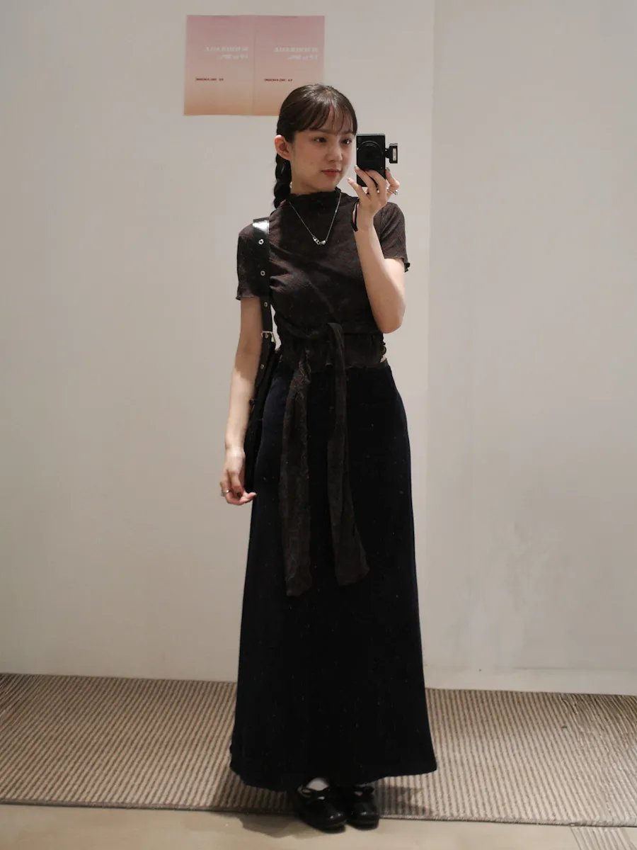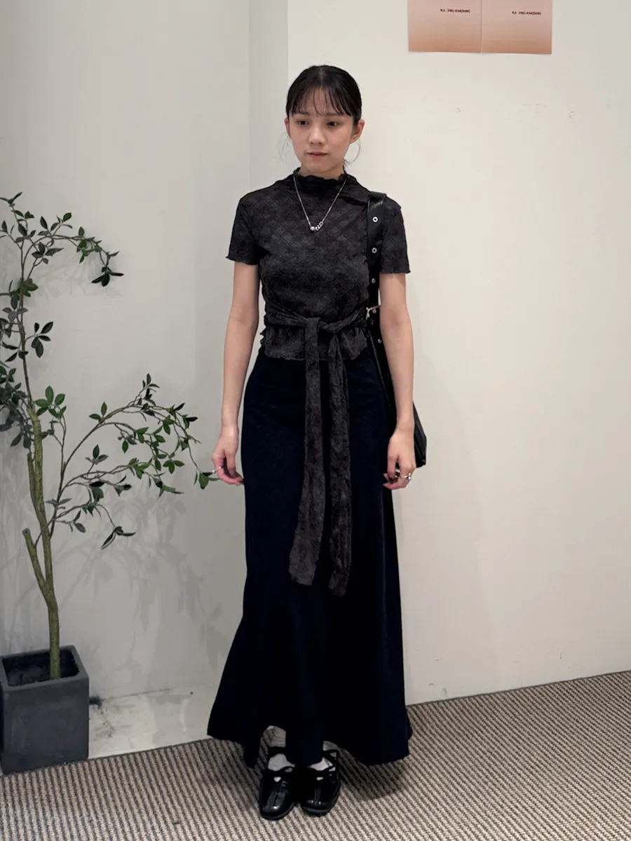 有彈性,微立領,捲捲邊,下擺圓弧狀,腰有綁繩