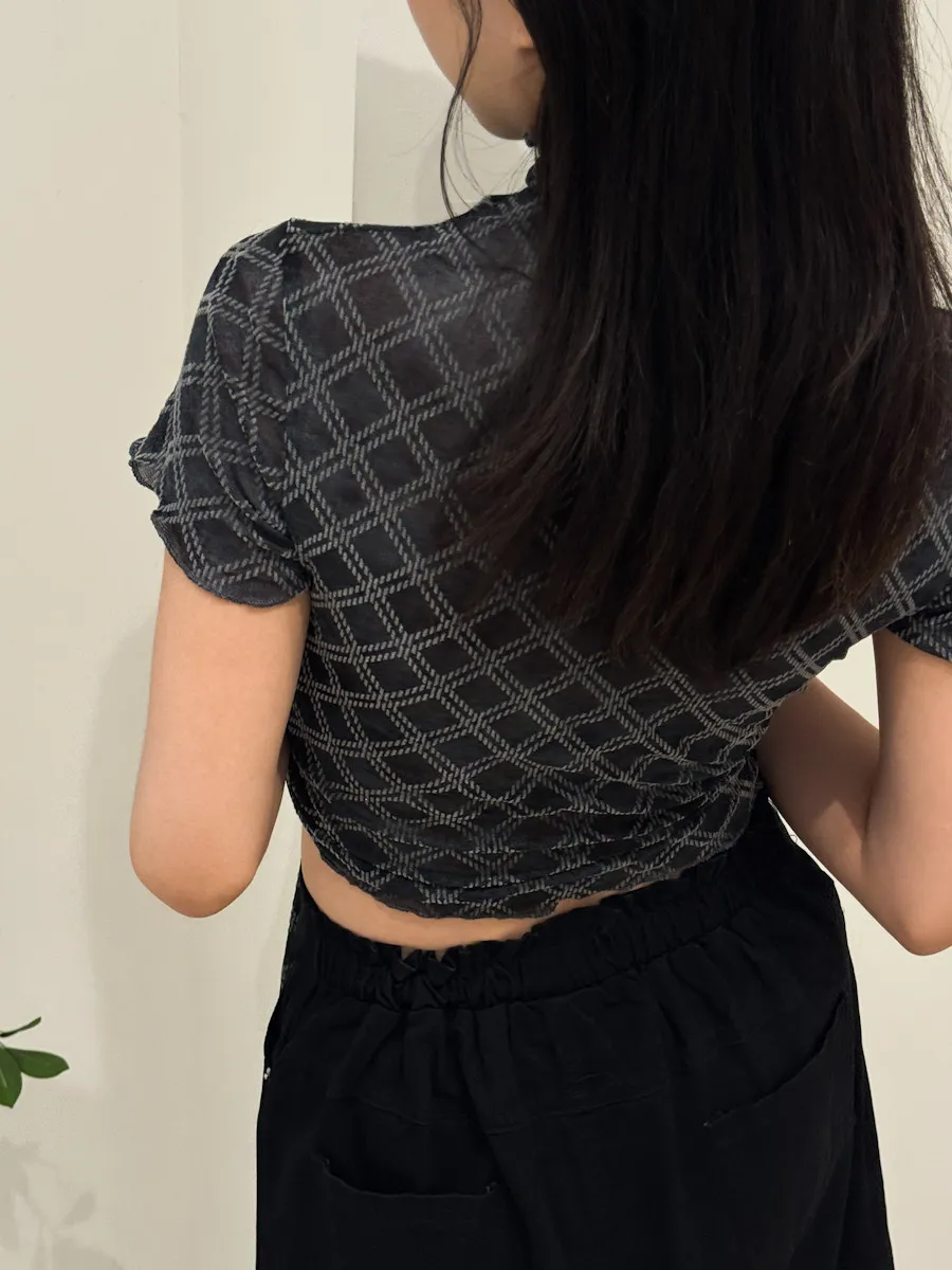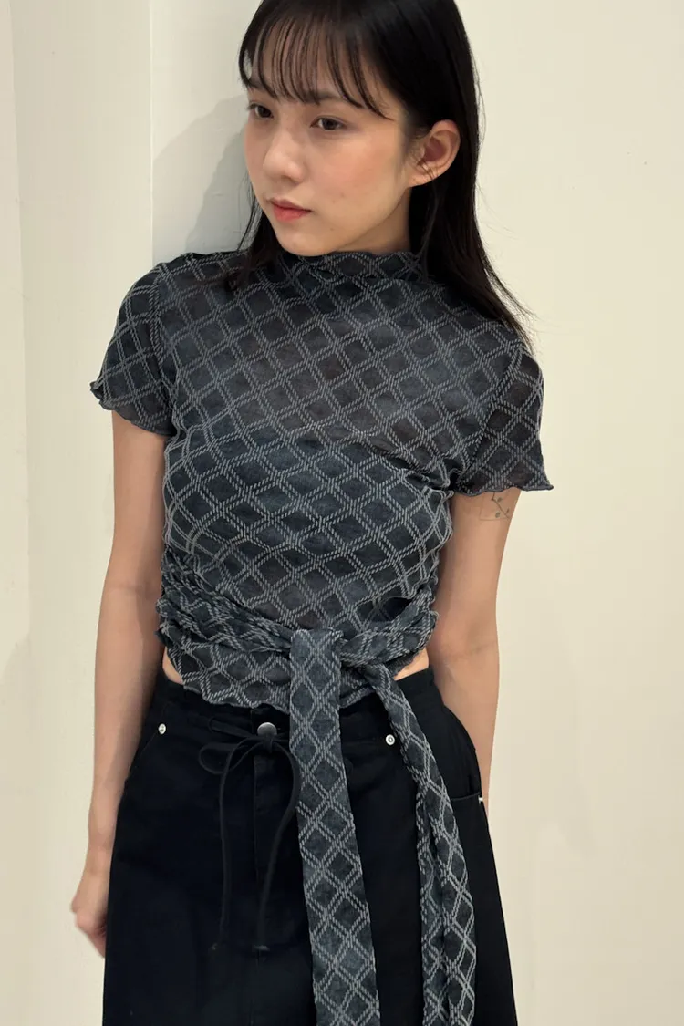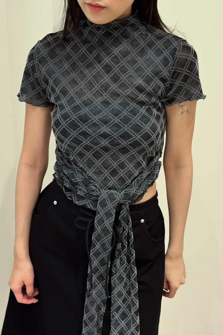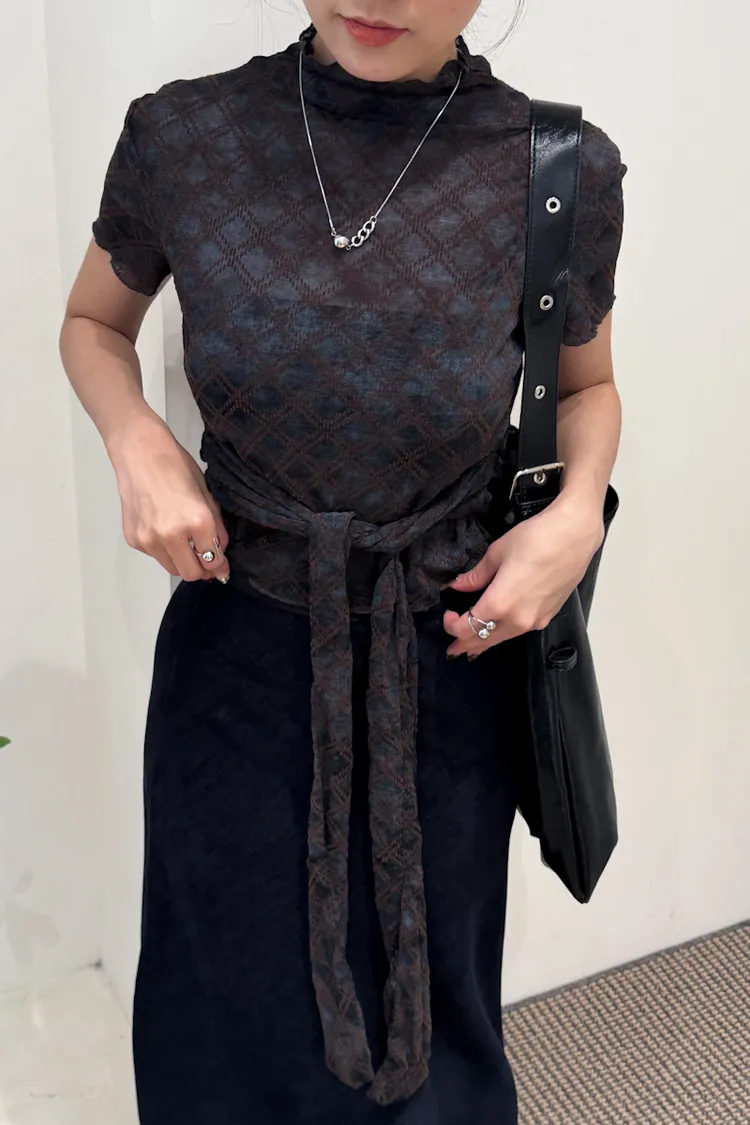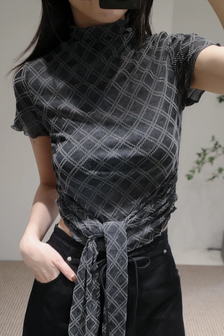 紗質半高領線格紋路短袖上衣 2color
