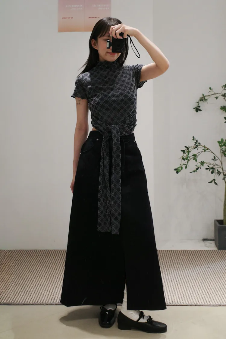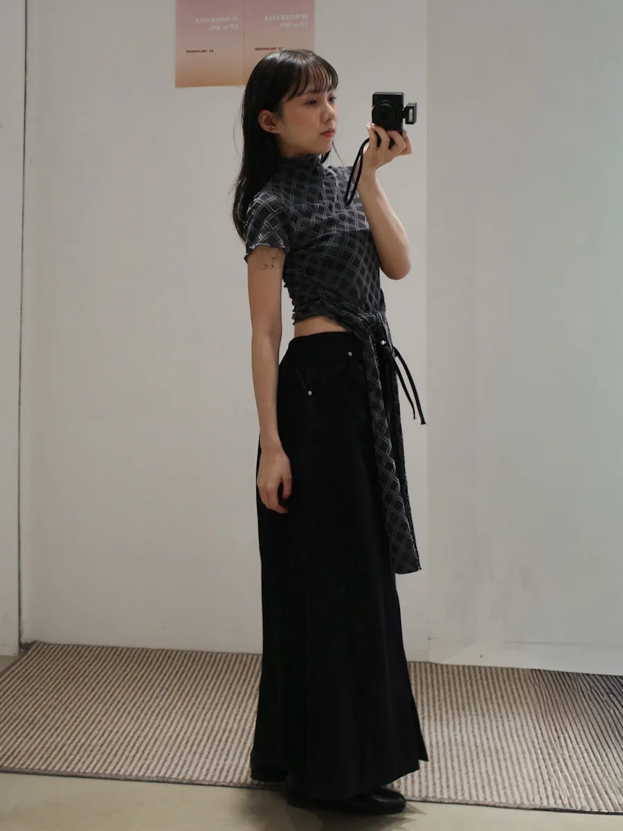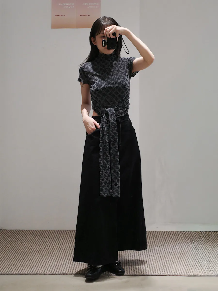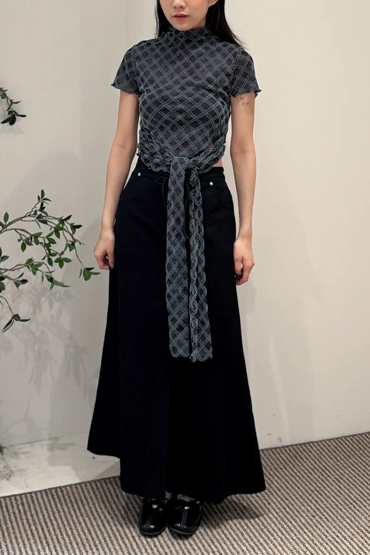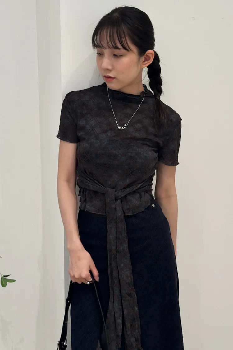 紗質半高領線格紋路短袖上衣 2color