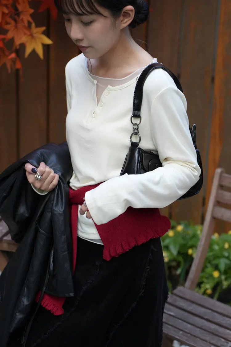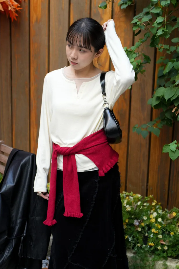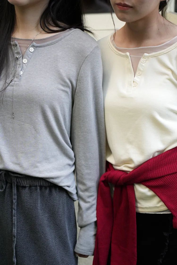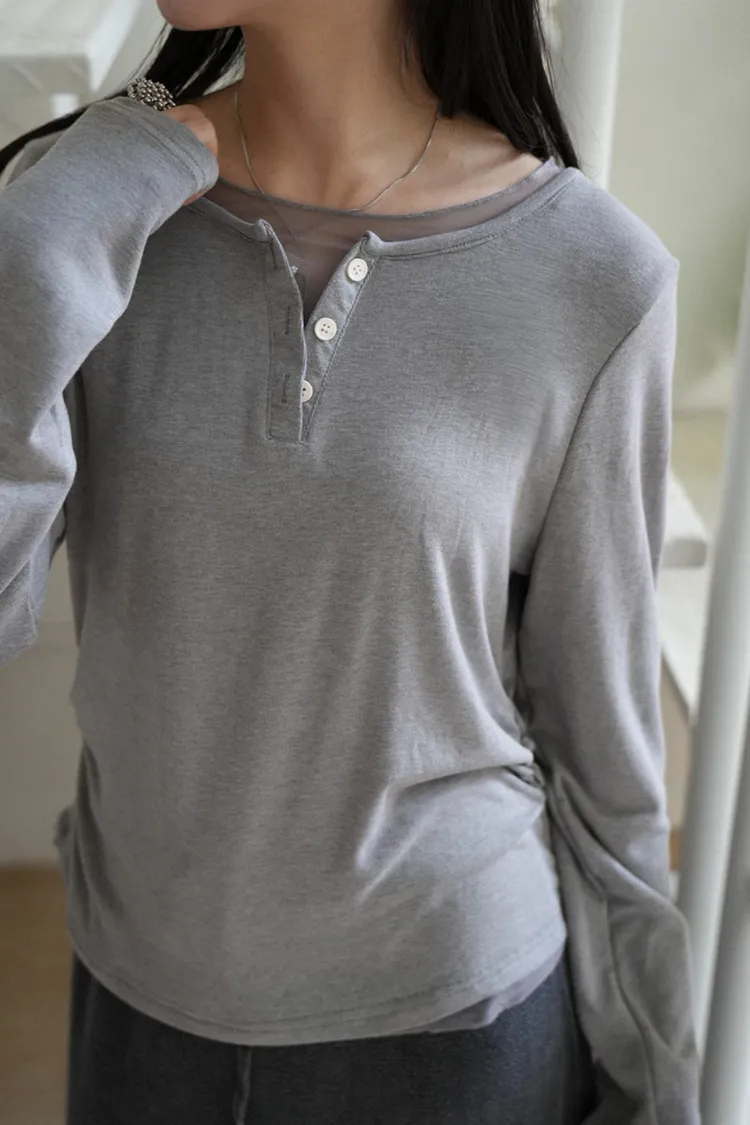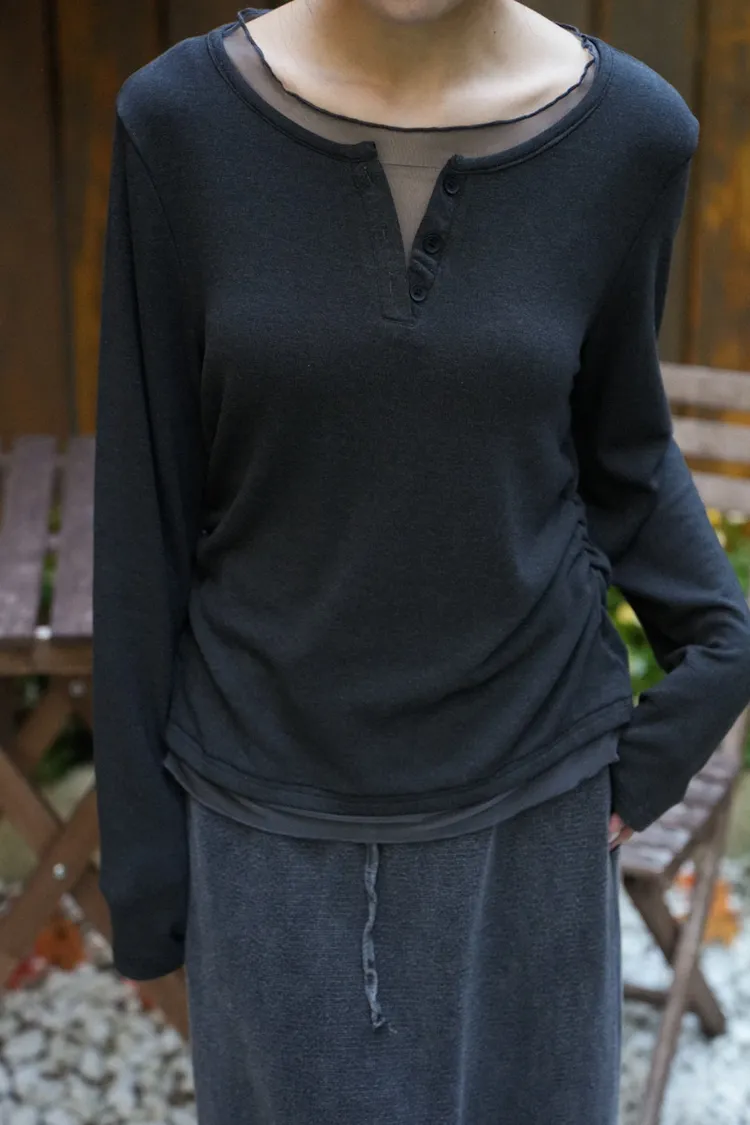 嫩Q拼接紗排釦側抓摺長袖上衣 3color
