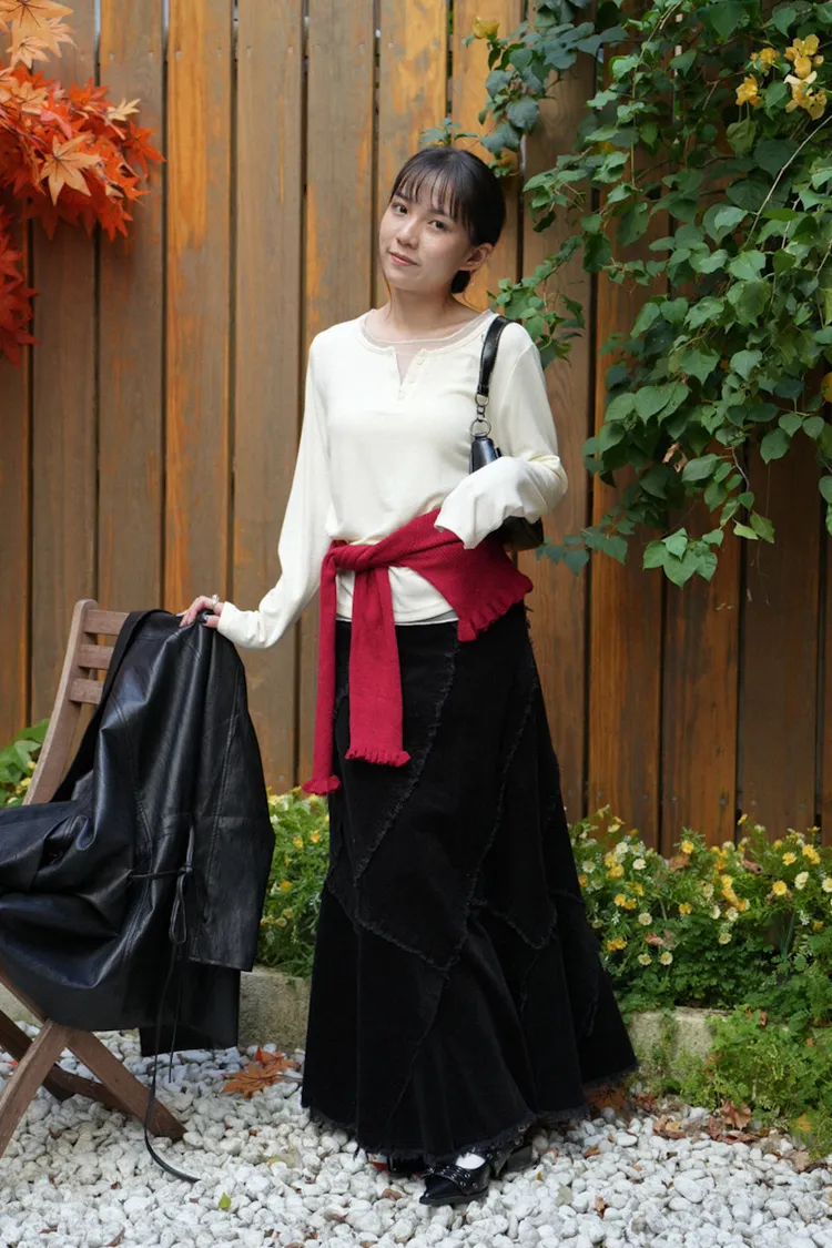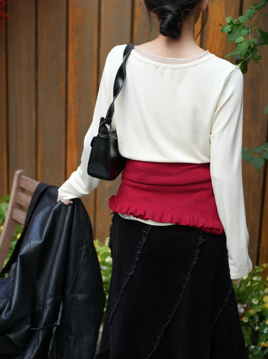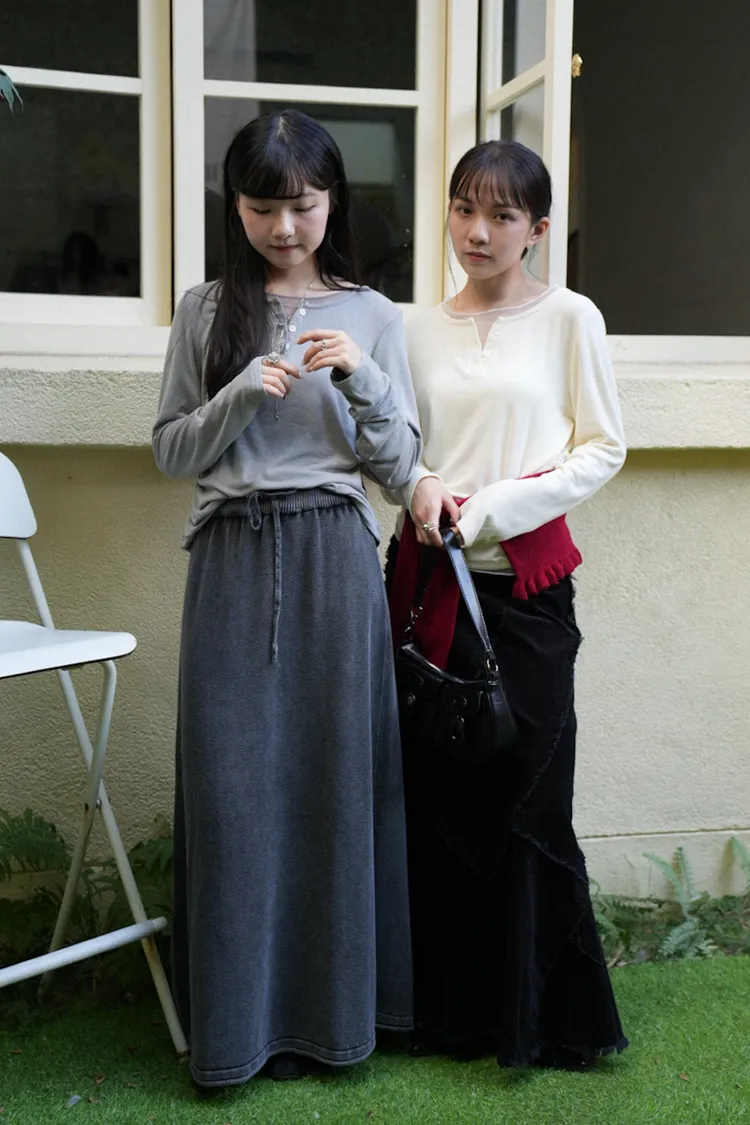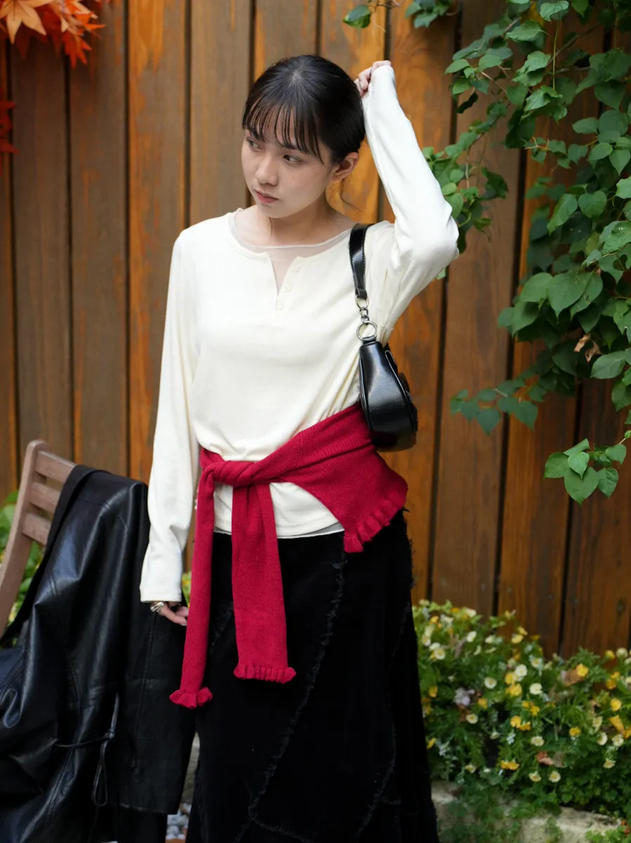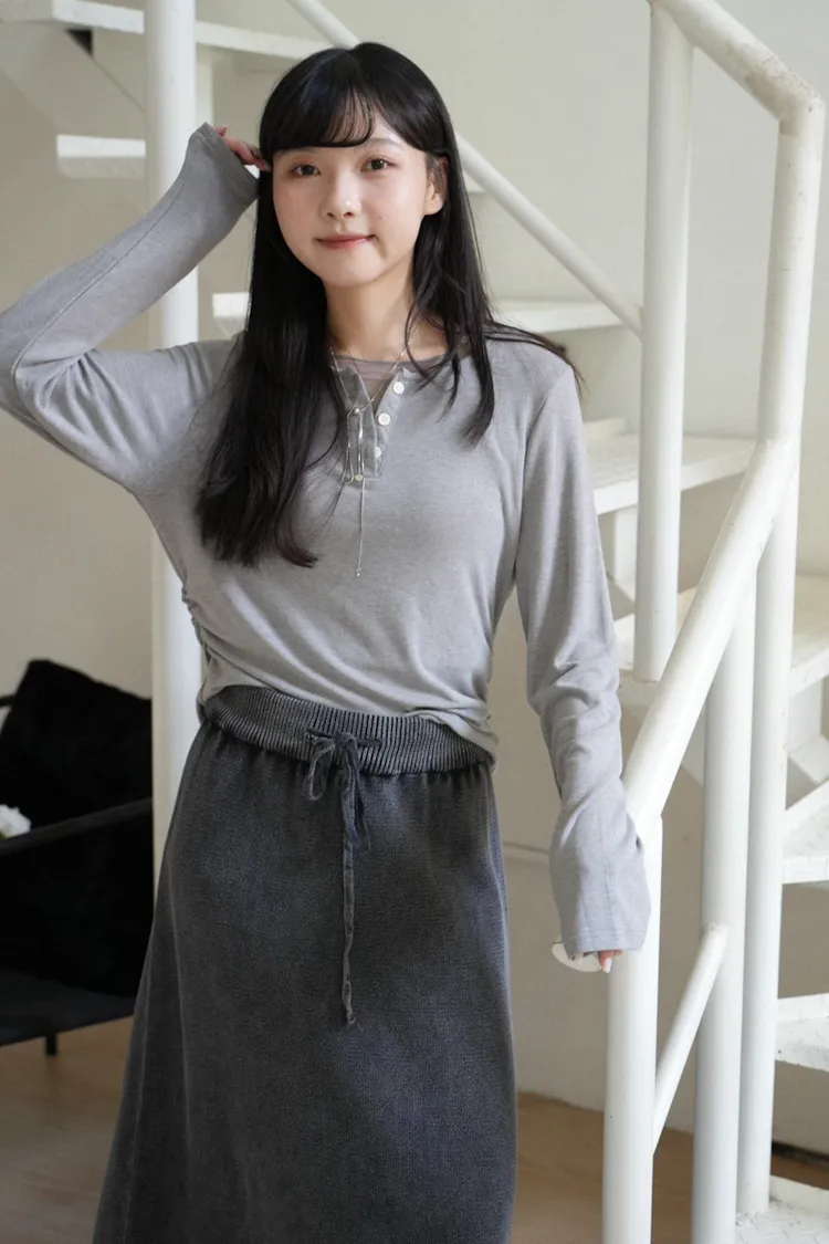 嫩Q拼接紗排釦側抓摺長袖上衣 3color