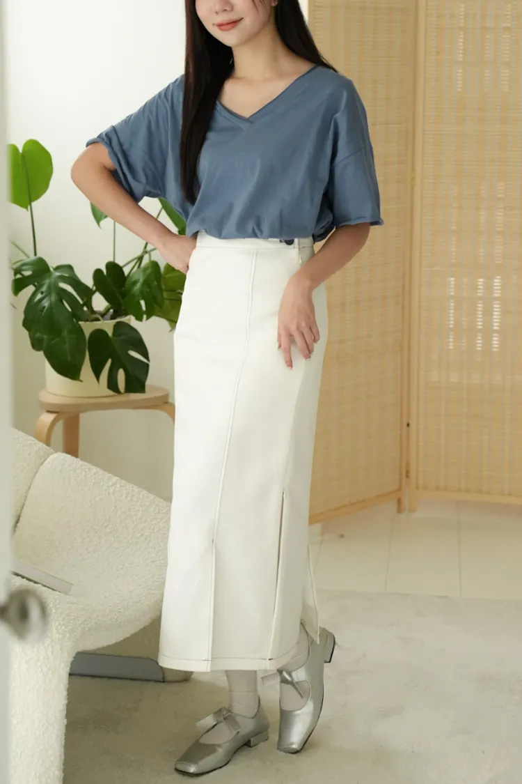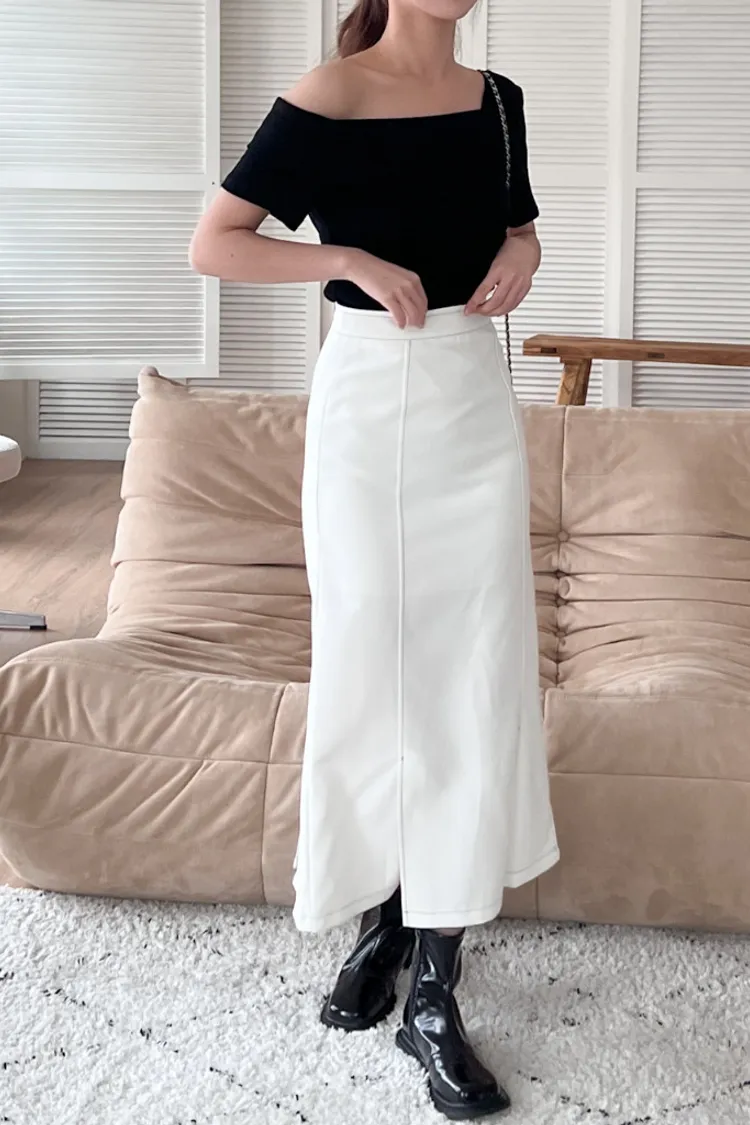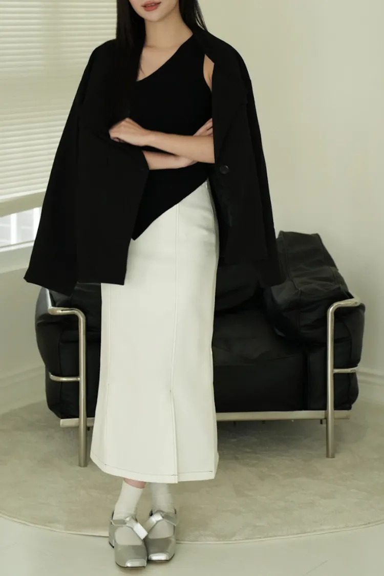 •info:微微彈性,腰側有扣子及側拉鍊,下側中有拉鍊可調整衩高,前後都有雙開衩,白底黑線,有內襯